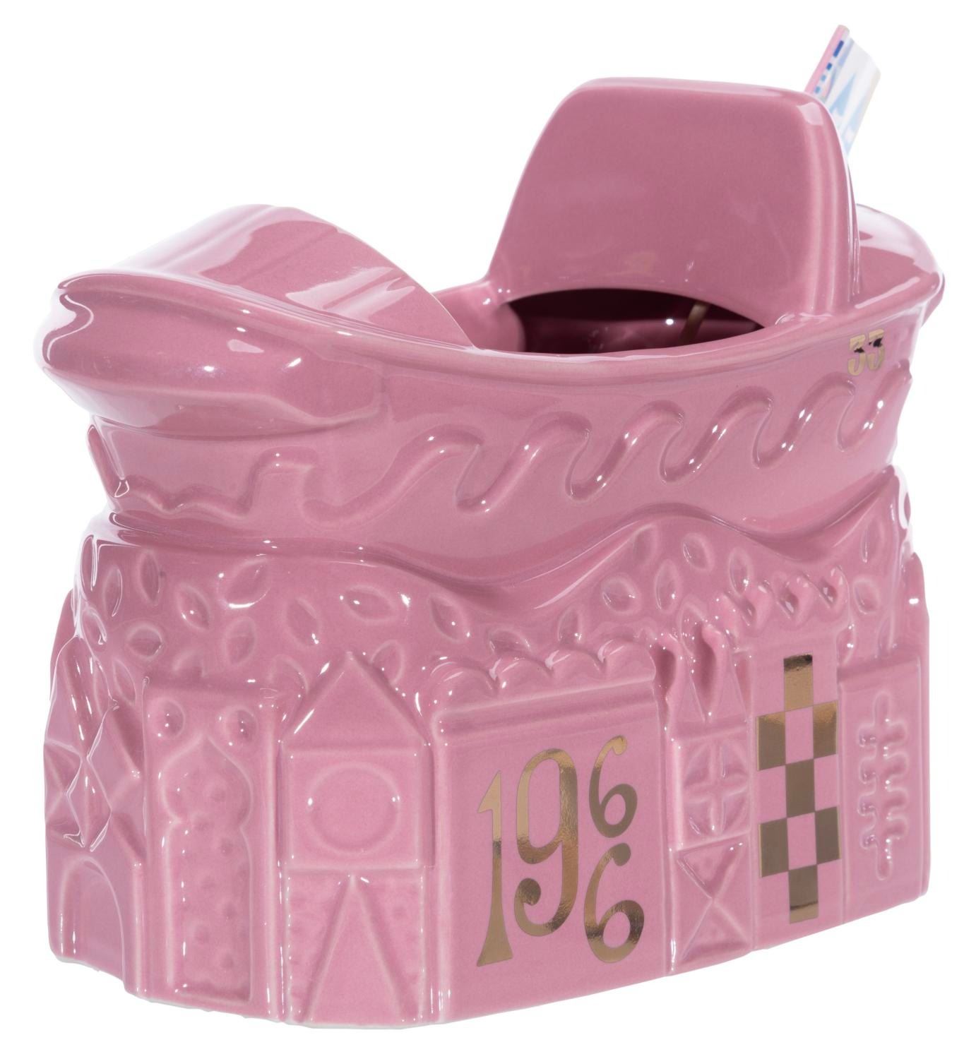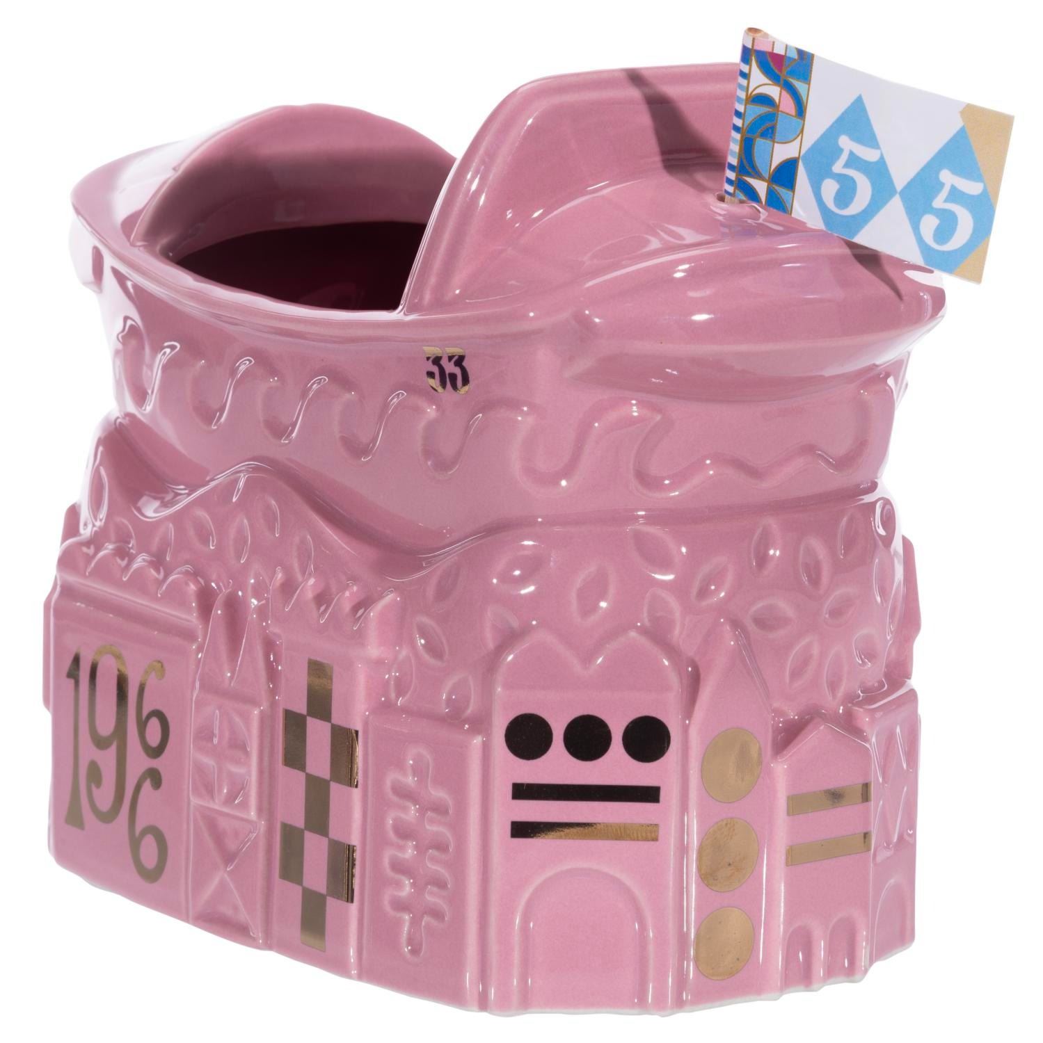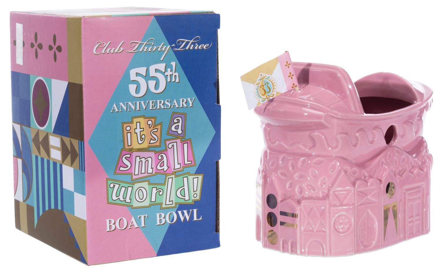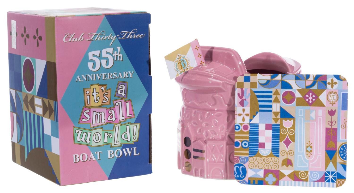 (Disneyland, 2021) A third edition Club 33 exclusive "Boat Bowl” designed by Vantiki and Tiki Farm to celebrate It’s a Small World’s 55th anniversary. Also included are a Club 33 toothpick flag and a coaster. Measuring 5” x 5.5” x 3.25” deep with its original 5.25” x 6.25” x 3.75” deep pastel-colored box, this limited edition ceramic mug, toothpick flag, and 4” x 4” coaster are in fine condition.