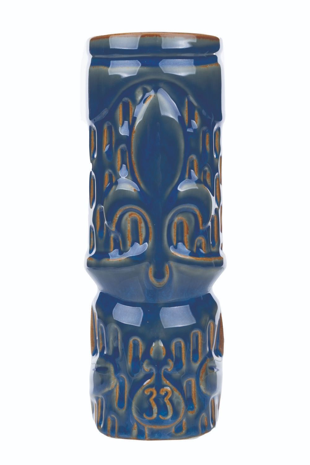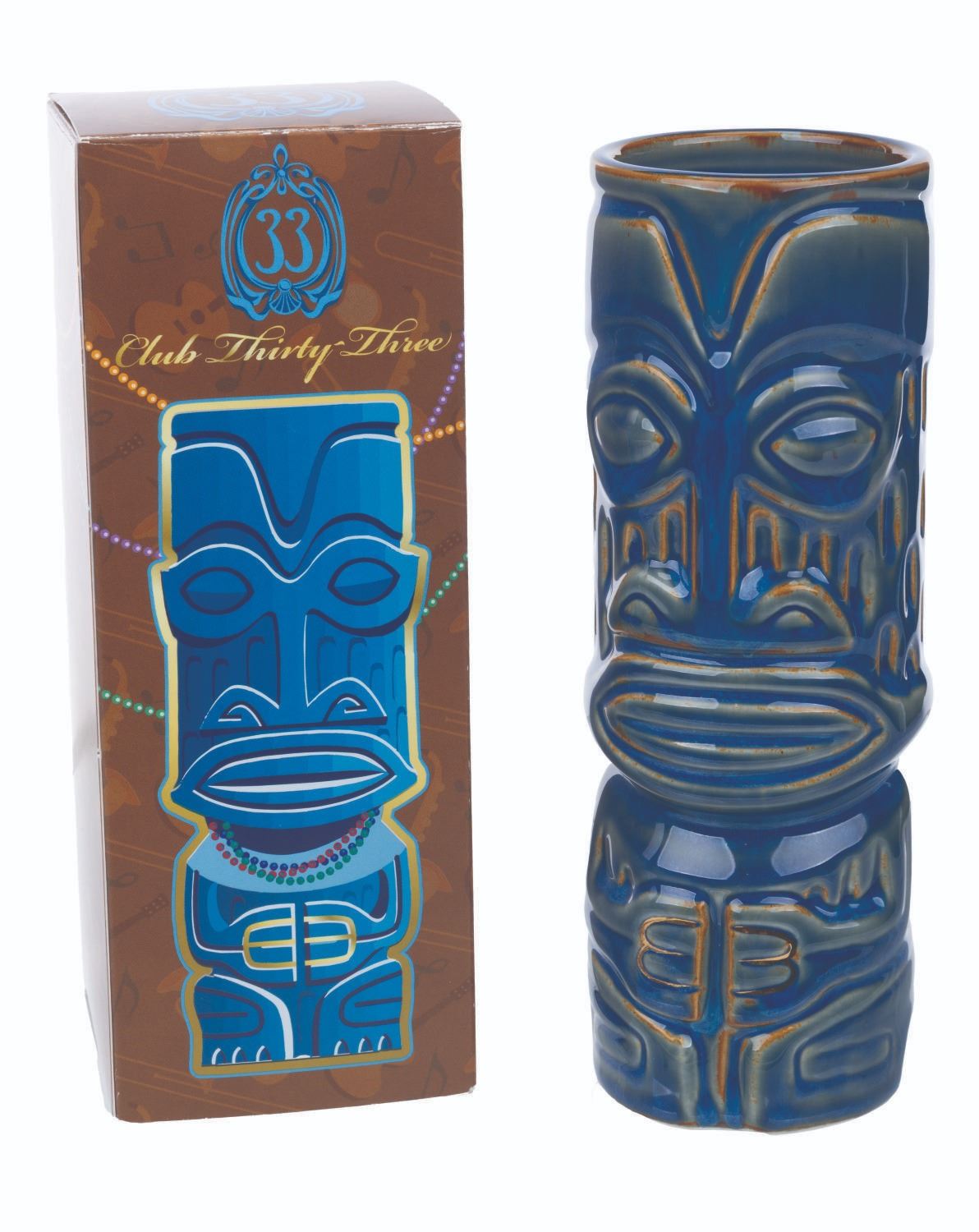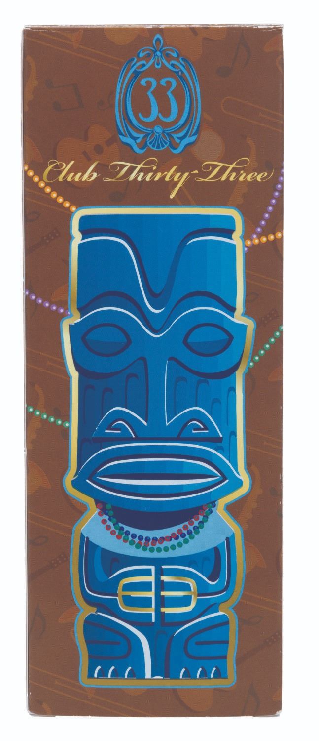 (Disneyland, 2022) A Club 33 Mardi Gras tiki mug designed by SHAG. Released in a limited edition of 2500, the mug features a Club 33 logo on the reverse and on the bottom of the mug. Measuring 8" tall and 2.75" in diameter with its original 3.25" x 3.25" x 8.5" tall box, the ceramic mug is in very good condition with light wear and missing its original bead necklace.