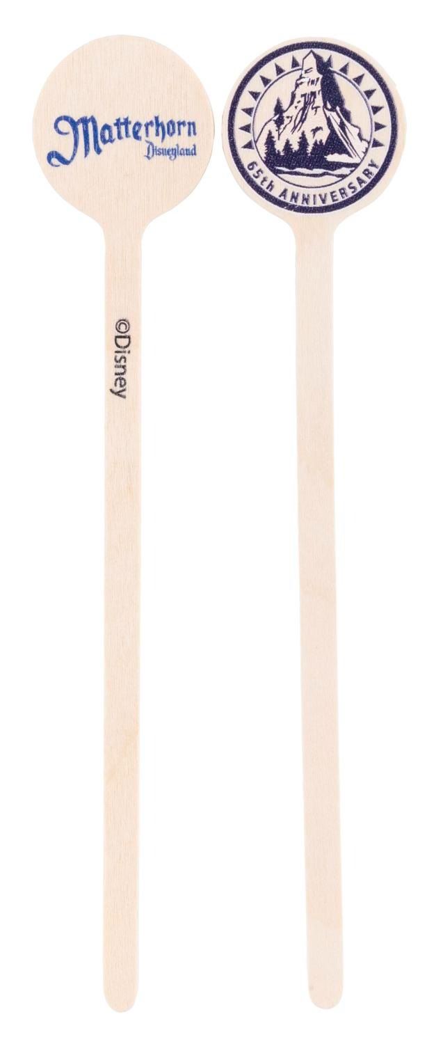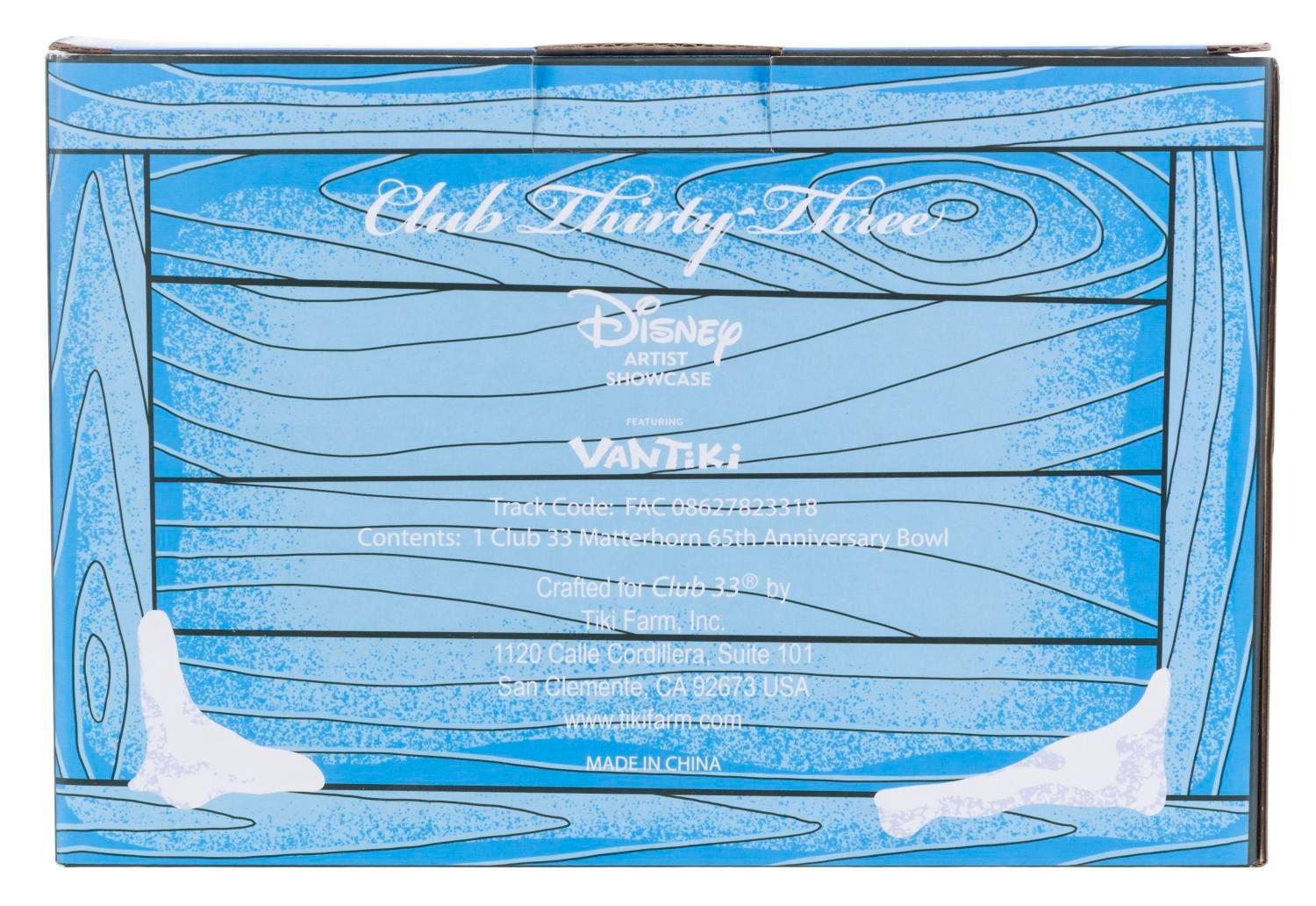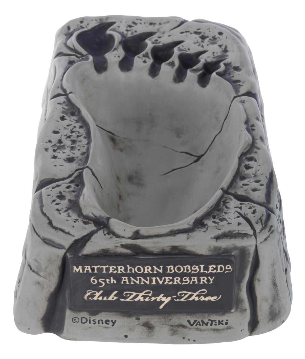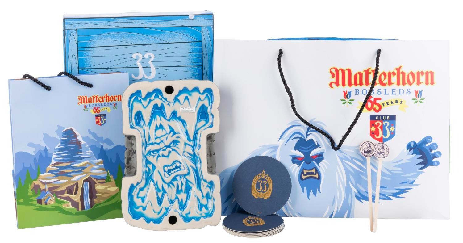(Disneyland, 2024) A collection of Club 33 Matterhorn 65th anniversary souvenir items including a ceramic Yeti footprint bowl by VanTiki, two wooden anniversary swizzle sticks, ten paper Club 33 coasters, four pieces of Club 33-branded tissue paper, and two Matterhorn Bobsleds anniversary souvenir bags. Ranging in size from 4” in diameter to 12” x 16”, the items are in very good to fine condition with light wear and creases.
