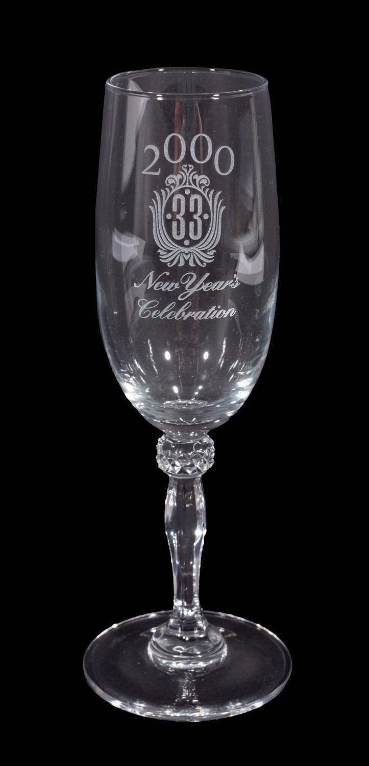 (Disneyland, 2000s) A commemorative Club 33 souvenir champagne flute, offered to members during the New Year's celebration of 2000 at Disneyland. Measuring 7.75" the glass is in fine condition.
