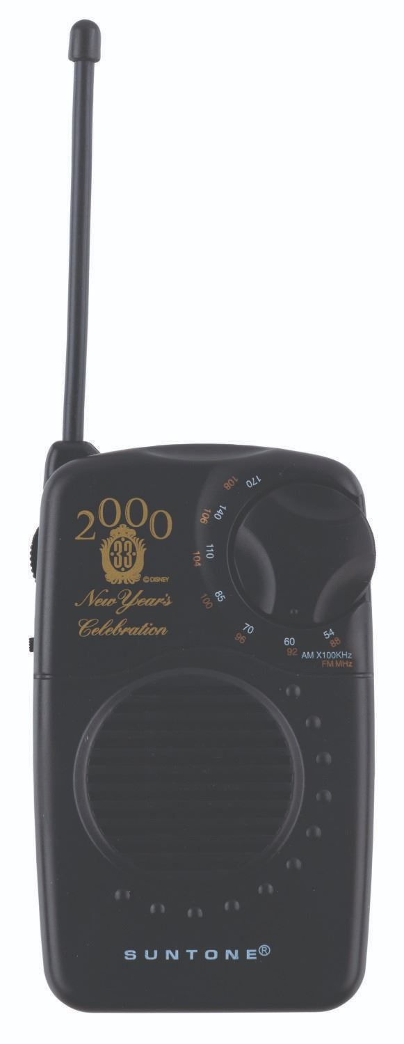 (Disneyland, 2000) A Club 33 transistor radio from Disneyland’s 2000 New Year’s Celebration. In preparation for Y2K and the night's grand celebrations, Guests carried transistor radios around the Park to tune into special broadcasts of music, announcements, and the Millennium Celebration Fireworks. Powered by two “AA” batteries (not included), the radio did not work when tested and likely needs servicing to function. Measuring 4” x 1” x 8”, the radio displays in fine condition.