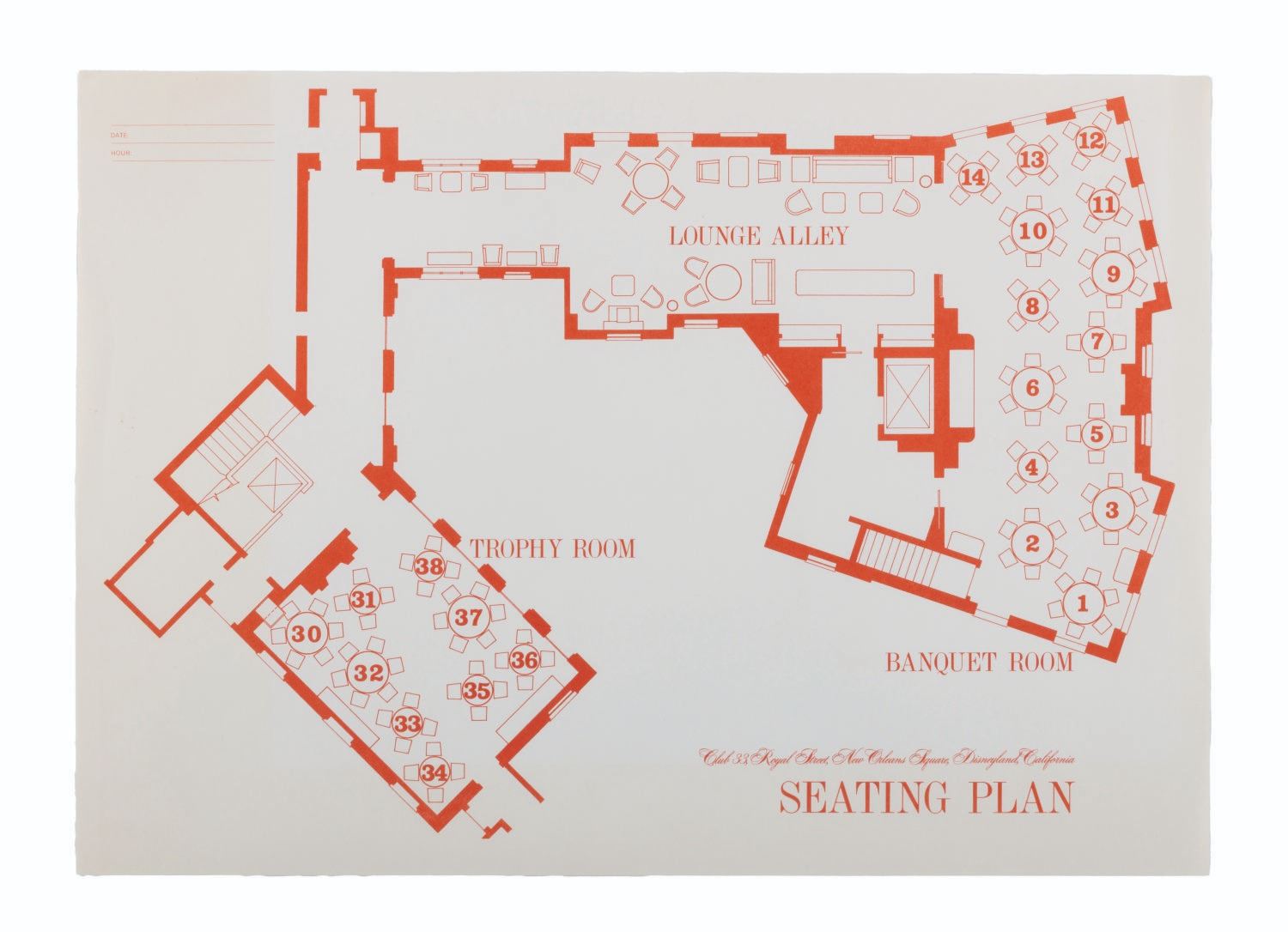 (Disneyland, 1967) A seating plan for the exclusive New Orleans Square restaurant, Club 33. This map from the early days of the VIPs-only establishment includes the trophy room, lounge alley, and banquet room. Measuring 10" x 14", the paper seating plan is in very good condition with light creases, wear, and discoloration from age.