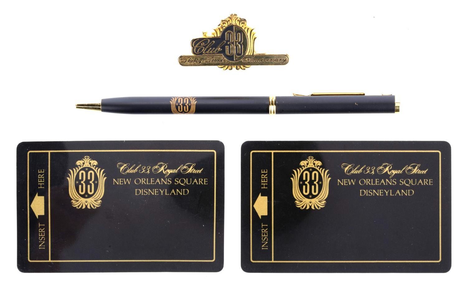 (Disneyland, 2000) A Club 33 souvenir collection including an ink pen, a commemorative "Thirty-Third Anniversary" pin, and two Member ID cards featuring magstripes. The pen measures 5.25" long, the pin is 1.75"x1", and the cards are 3.5"x2.25". Each piece is in very good condition, the cards exhibiting minor scuffs and the pen requiring an ink refill.