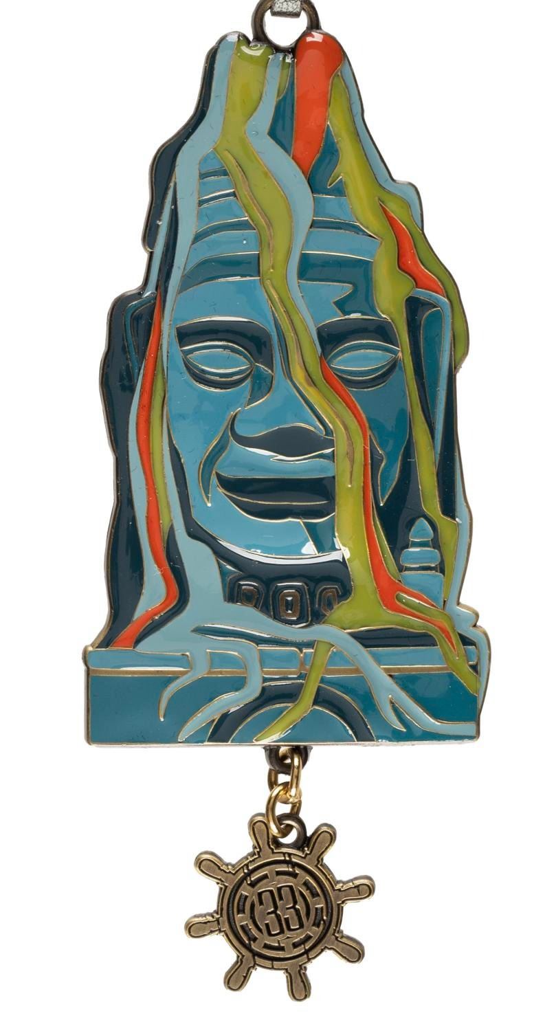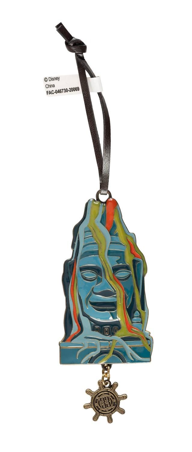 (Disneyland, 2020) A Club 33 ornament from the 2020 "Tiki Takeover" event in honor of the 25th anniversary of the Indiana Jones Adventure. Inspired by the giant statue within the Jungle Cruise, this ornament was released in a limited edition of only 700. Measuring 1.75" x 4" with a 3" leather loop, the ornament is in fine condition with its original box.