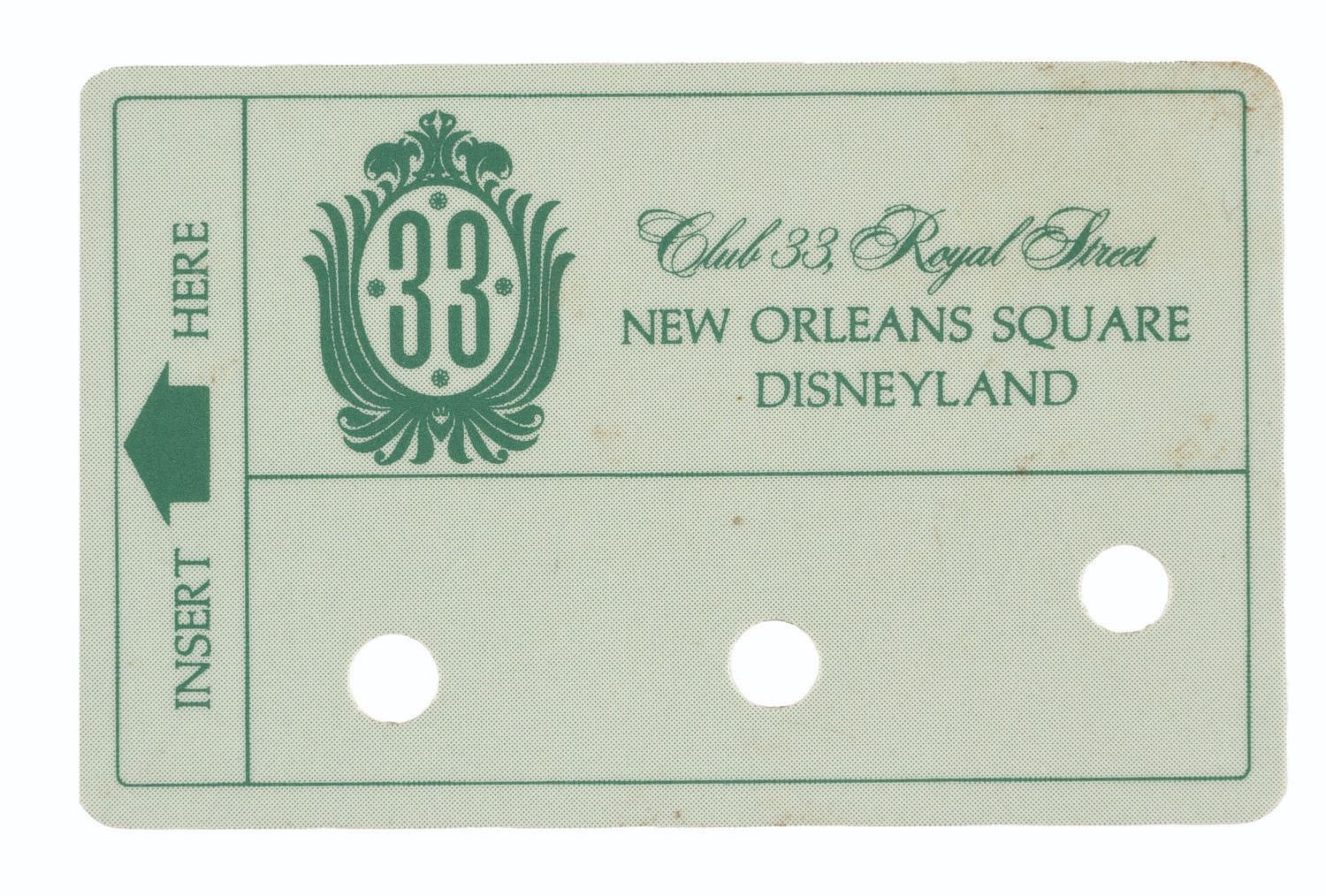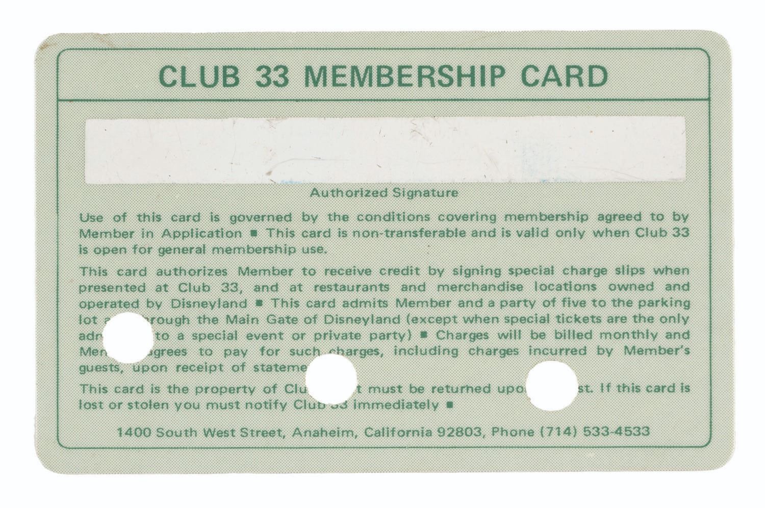 (Disneyland, 1980s) A rare membership card for Disneyland’s exclusive Club 33 with the logo on the front and the rules of usage on the reverse. This card is unused and has been voided with three hole punches to the lower half. Measuring 2.25" x 3.5", the card is in very good condition with light surface soiling and scuffing.