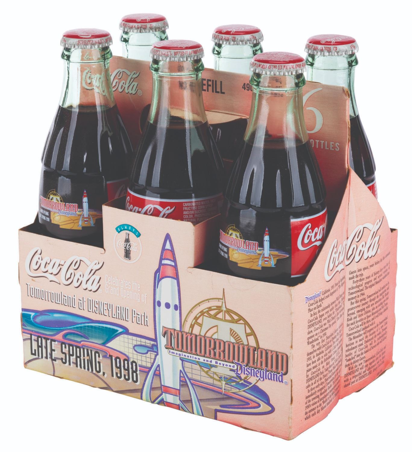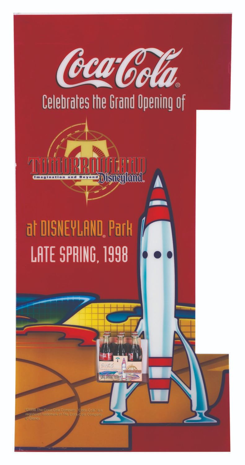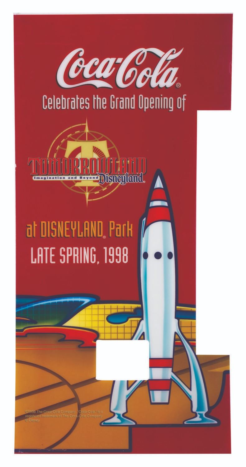 (Disneyland, 1998) A plastic Coca-Cola vending machine front panel and a six-pack of glass Coke bottles promoting the opening of New Tomorrowland in late spring 1998. Vending machines throughout Southern California were reskinned with panels like this one touting the upcoming $100 million renovation to the land. The 36” x 76” vending machine cover displays in very good condition with typical paint loss, scuffs, and wear from Park use, while the 4.75” x 7” x 7.75” tall six-pack is in good condition with creases, stains, wear, and heavy discoloration from age. Please note that the six-pack is for collecting purposes only and is not recommended for consumption.