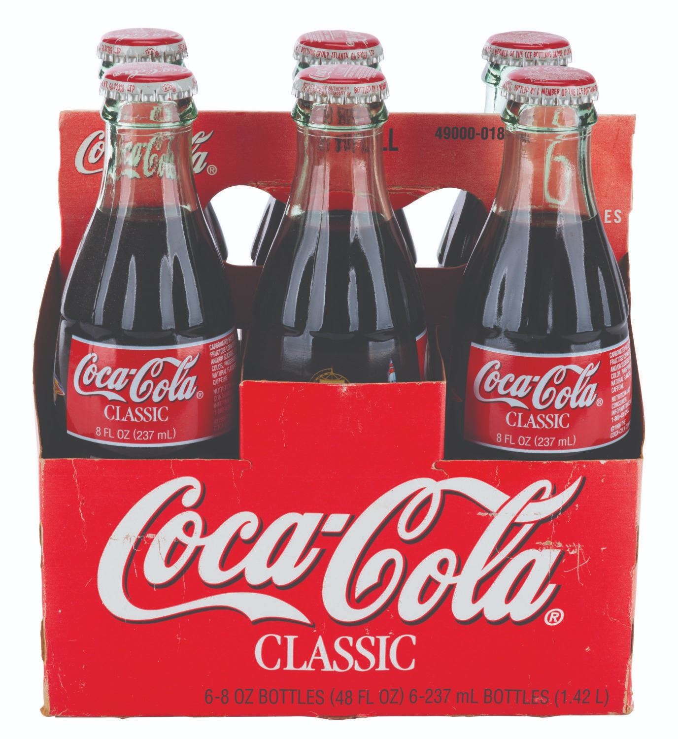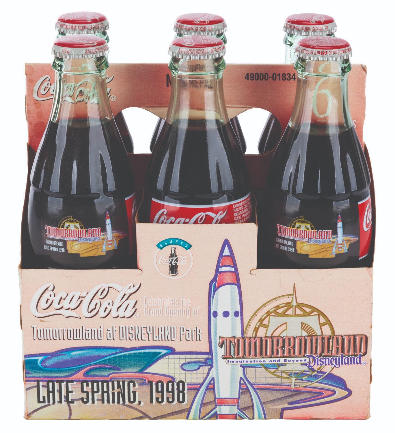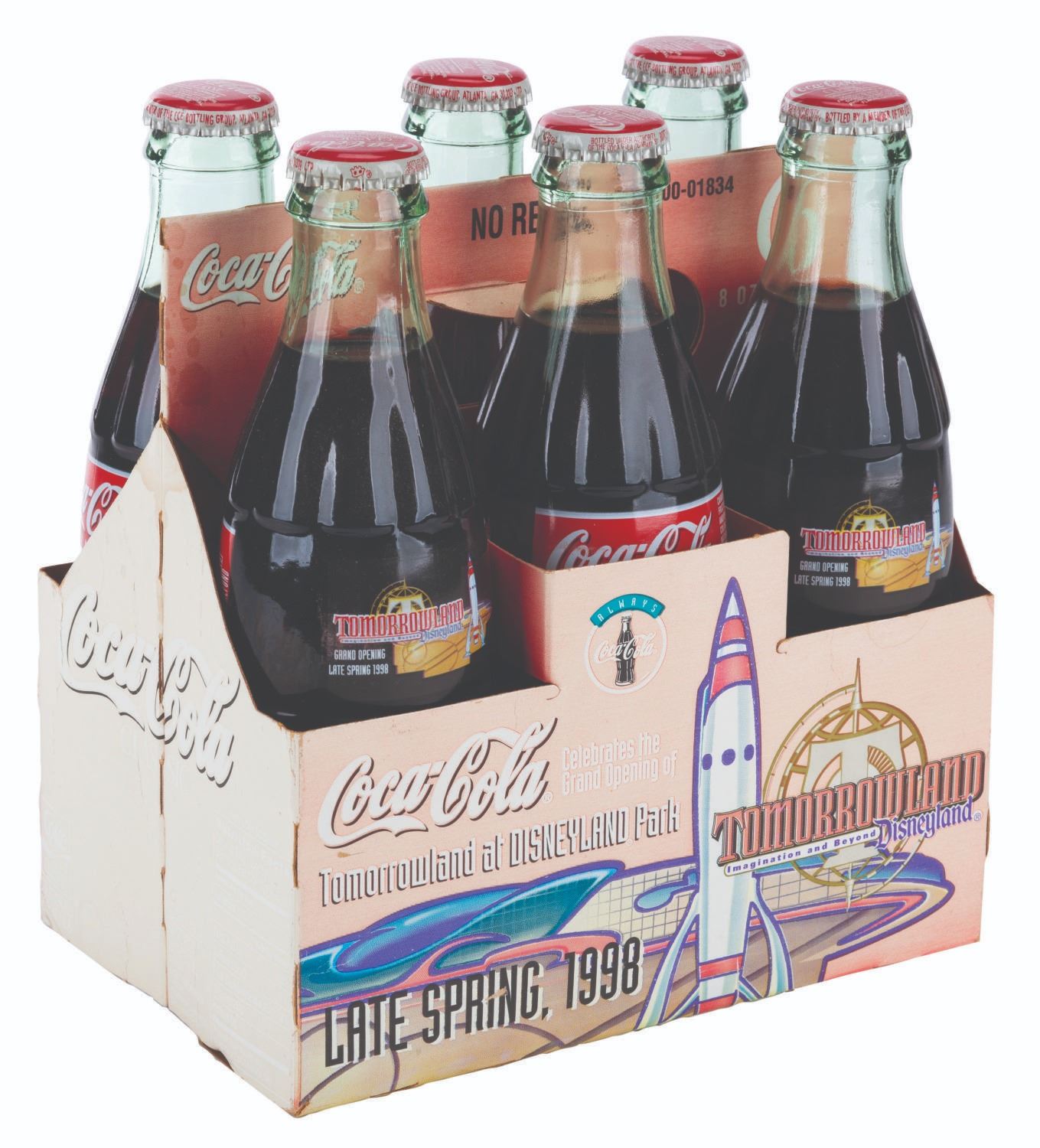 (Disneyland, 1998) A plastic Coca-Cola vending machine front panel and a six-pack of glass Coke bottles promoting the opening of New Tomorrowland in late spring 1998. Vending machines throughout Southern California were reskinned with panels like this one touting the upcoming $100 million renovation to the land. The 36” x 76” vending machine cover displays in very good condition with typical paint loss, scuffs, and wear from Park use, while the 4.75” x 7” x 7.75” tall six-pack is in good condition with creases, stains, wear, and heavy discoloration from age. Please note that the six-pack is for collecting purposes only and is not recommended for consumption.