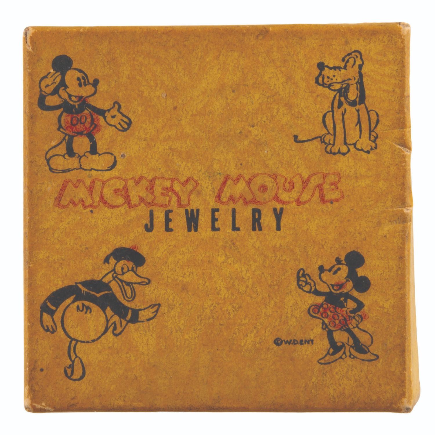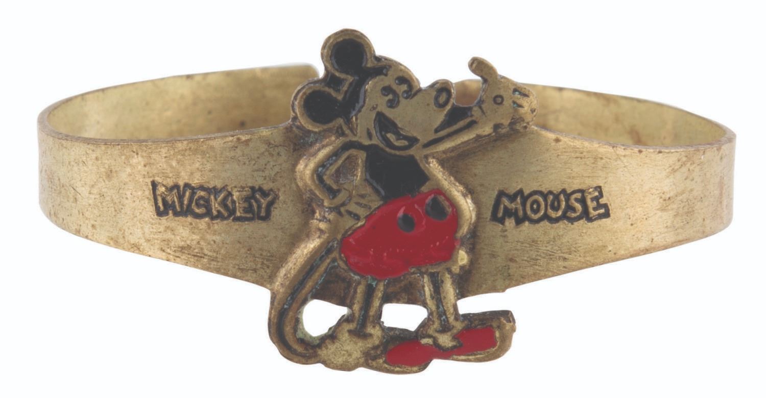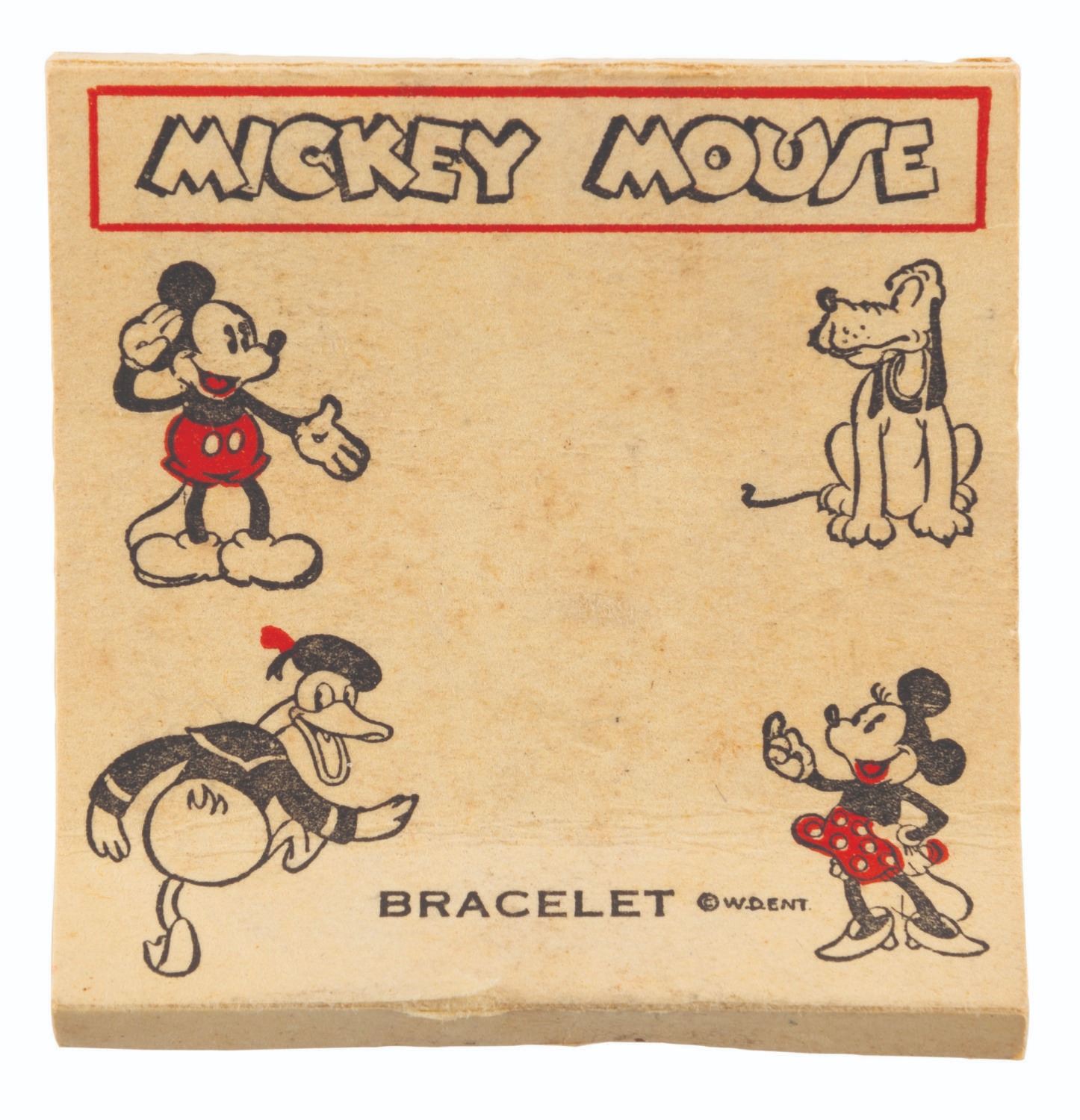 (Cohn & Rosenberger, 1932) A Mickey Mouse infant bracelet made by Cohn & Rosenberger, one of the first official Walt Disney merchandise licensees. The metal and enamel bracelet is designed for a small wrist and comes in the original Disney-branded box. Measuring 1.5" x 1.75", the bracelet is in good condition with tarnishing, discoloration, soiling, and tiny spots of enamel loss. The 2.5" x 2.5" box is in good condition with discoloration, edge wear, fading, and staining.
