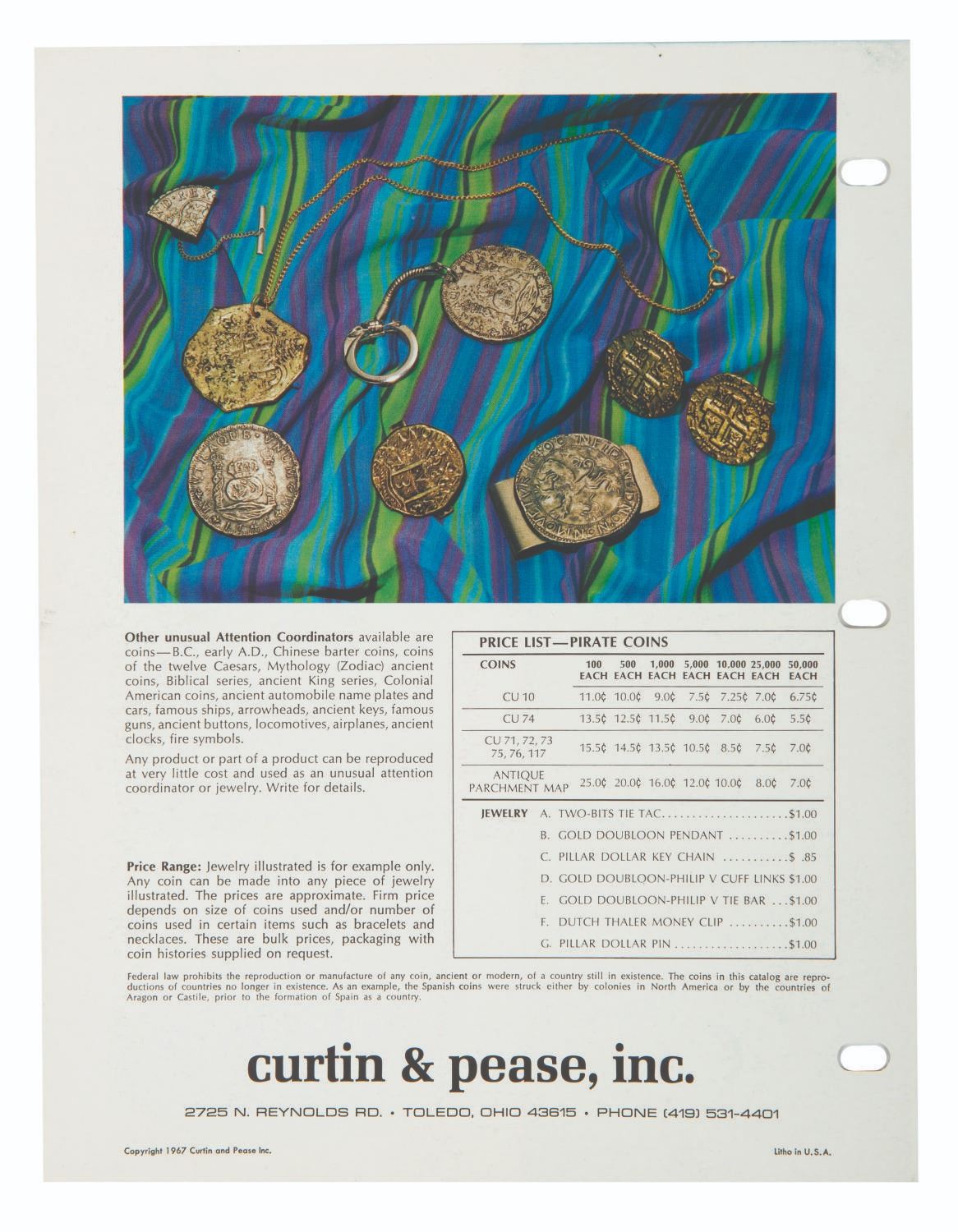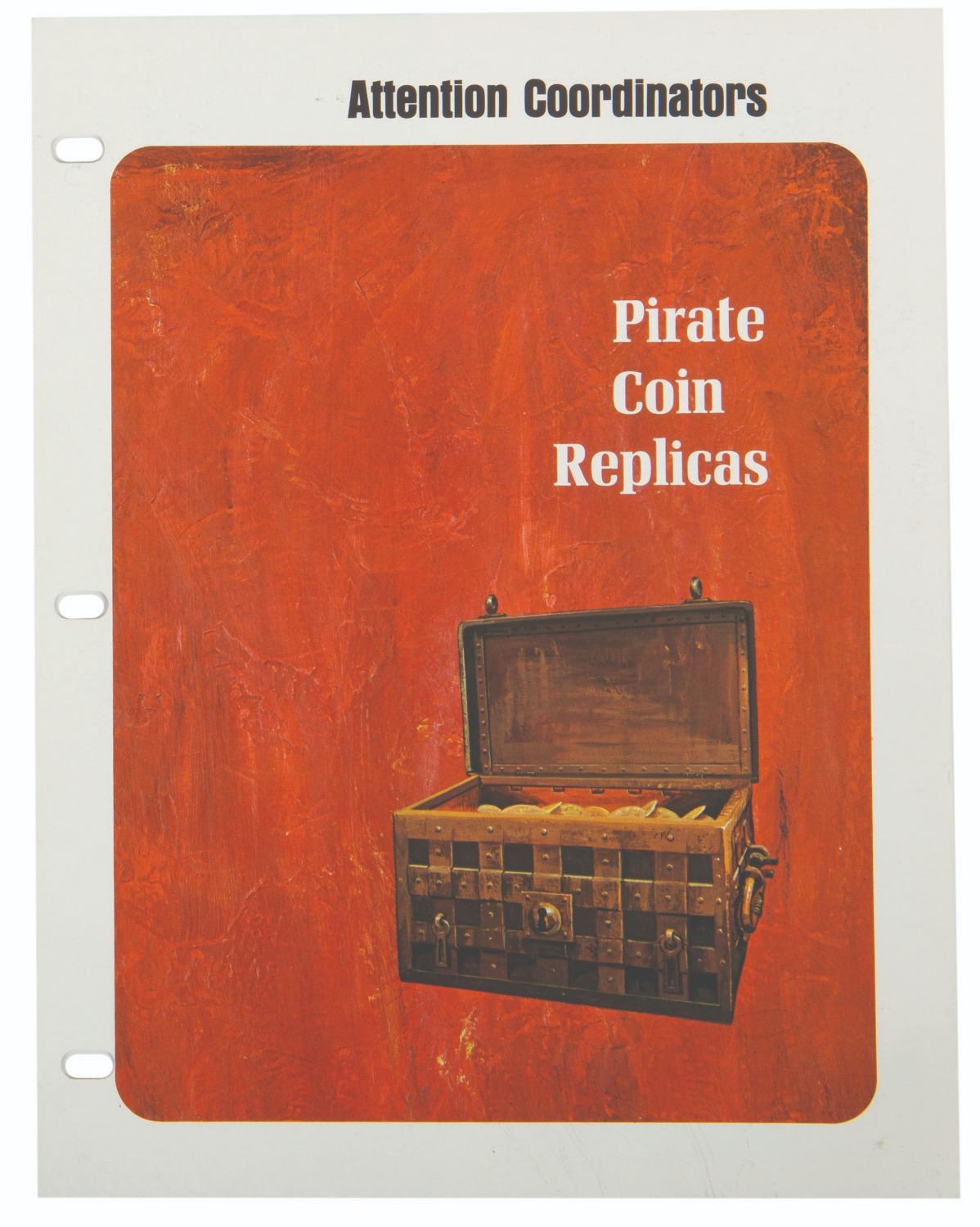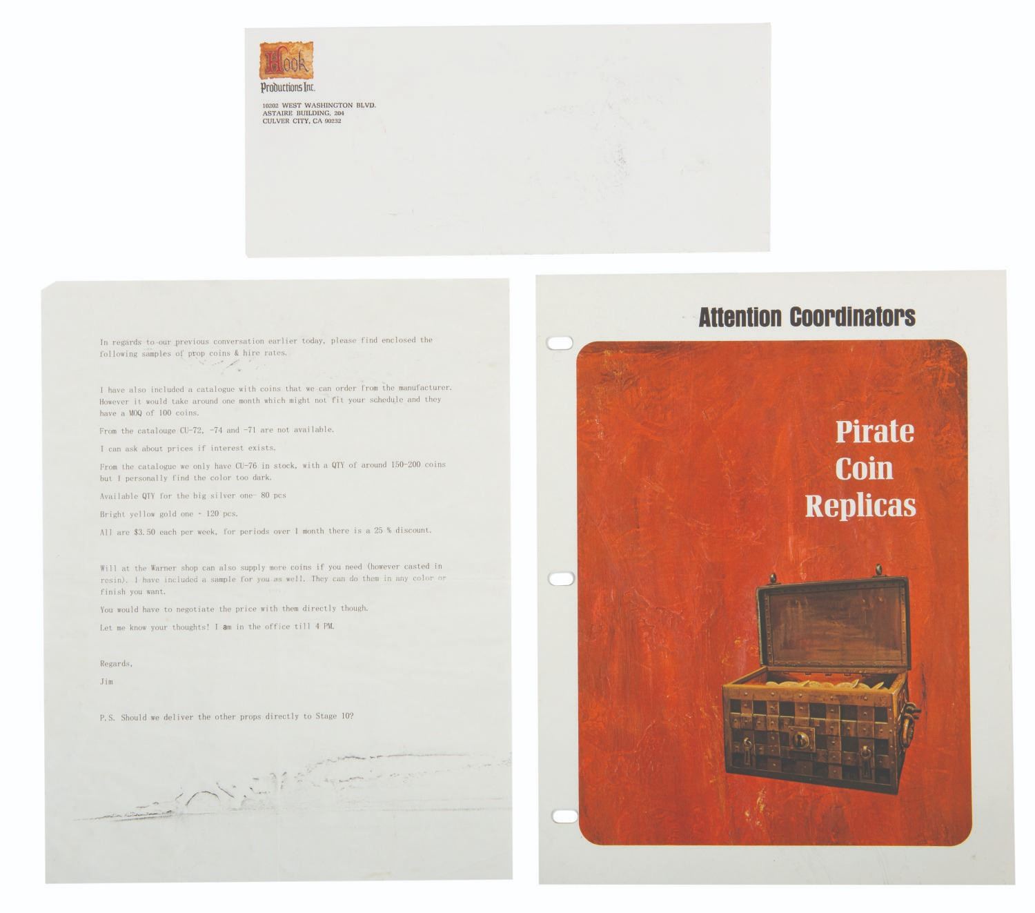 (TriStar Pictures, 1991) A brochure and three sample prop coins sent to the production of Steven Spielberg’s “Hook,” to provide prop pirate coins for the filming. Along with a letter from the coin supplier, the collection also includes a “Hook” letterhead envelope. Measuring 1.25” to 1.75” in diameter, the coins are in fine condition. Measuring 8.5” x 11” the brochure, letter, and 4.25” x 9.5” envelope are in good condition with creases and soiling to the letter.