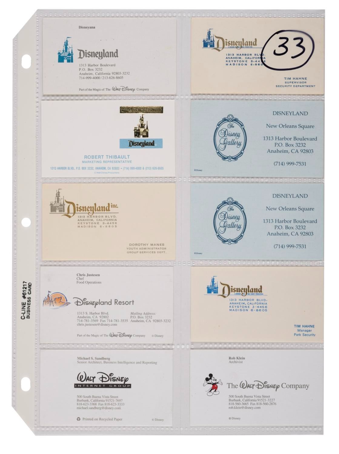 (Disney, 1960s-2000s) Ten business cards spanning decades and divisions of the Walt Disney Company, including Disneyland. Among this lot are 3 cards from the 1960s-70s, 4 cards from the 1980s-90s, and 3 cards from the 1990s-2000s. Measuring 3.5"x2", each card is in very good condition with minor edge wear.