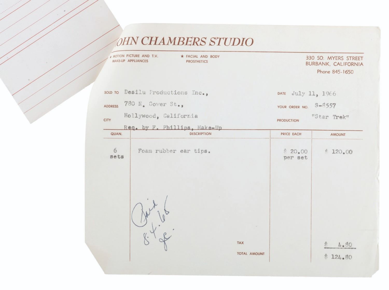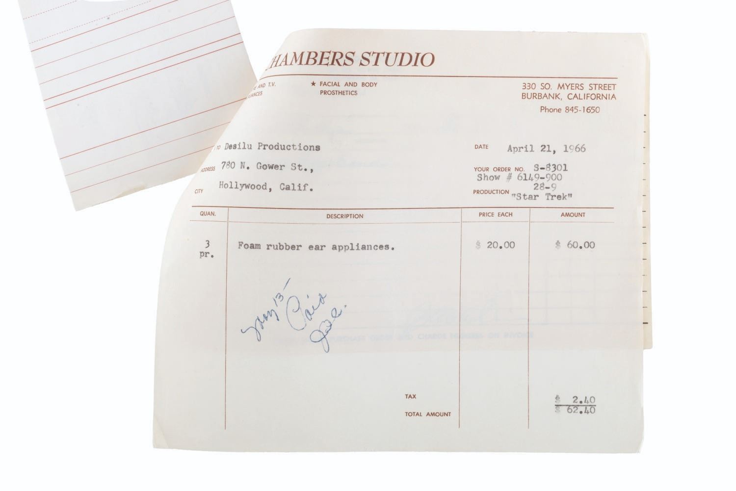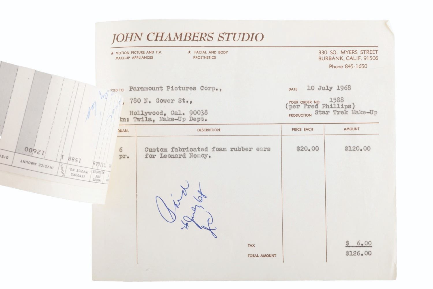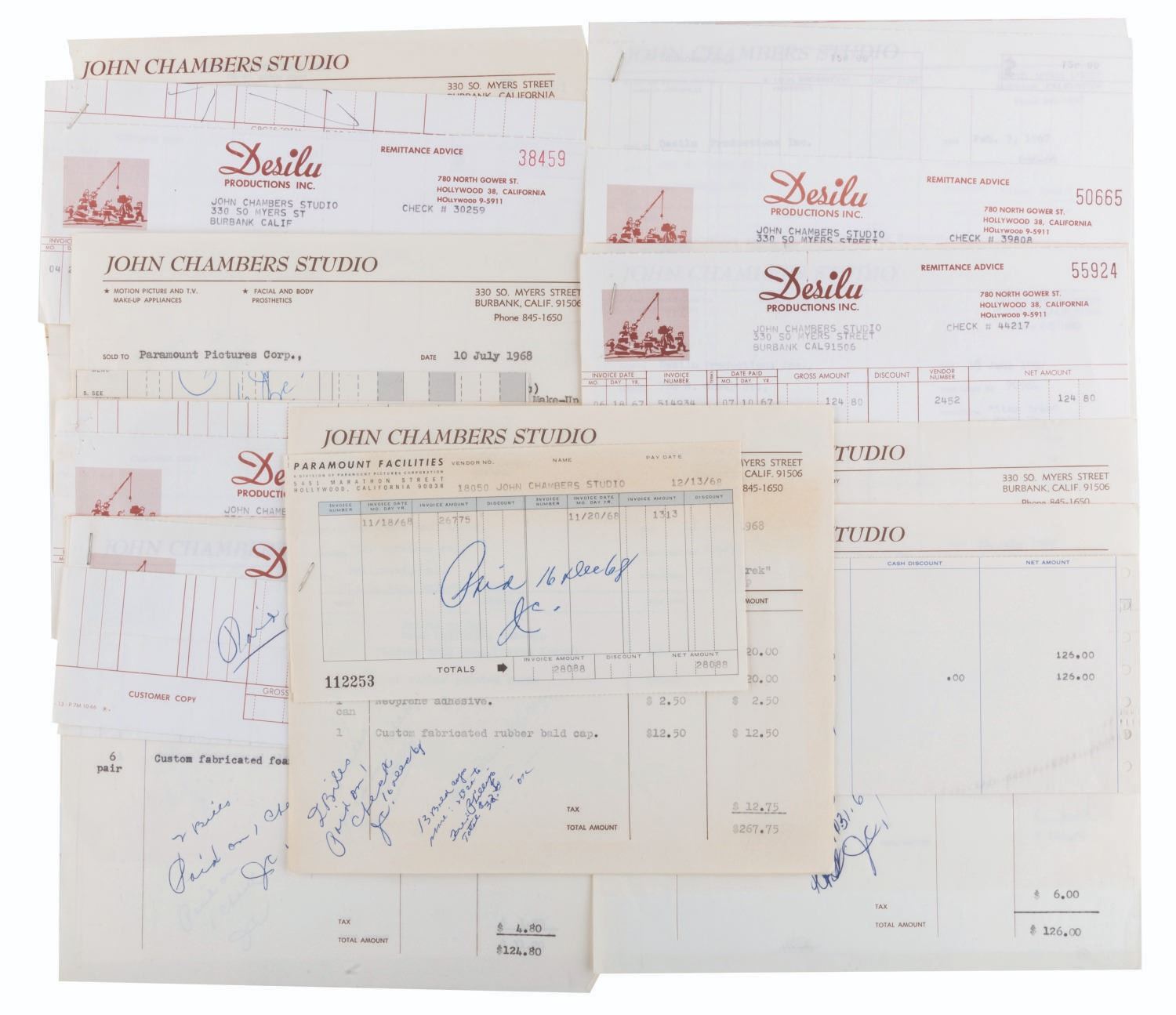 (Chambers/Desilu/Paramount, 1966-68) A collection of 11 invoices from John Chambers Studio for Spock ears used in key Spock episodes of "Star Trek." Comparing invoice dates to production dates confirms this batch of paperwork includes invoices for Spock ears worn in the episodes "Charlie X," “Shore Leave,” "City on the Edge of Forever," "Amok Time,” Mirror, Mirror," “Journey to Babel,” "Spock's Brain," and “The Way to Eden.” Also included are invoices for bald caps that include "The Way to Eden," and of particular note the invoice for the first Spock ears produced by Chambers on April 21,1966, which actor Leonard Nimoy credited with essentially saving the show. The invoices are stapled to matching paperwork from Desilu and Paramount Studios, and include hand notations by John Chambers and others. Measuring up to 7.5" x 8.75" each, the paperwork is in very good condition with typical wear from handling and age, including some color shift to paper, and wear around staples.