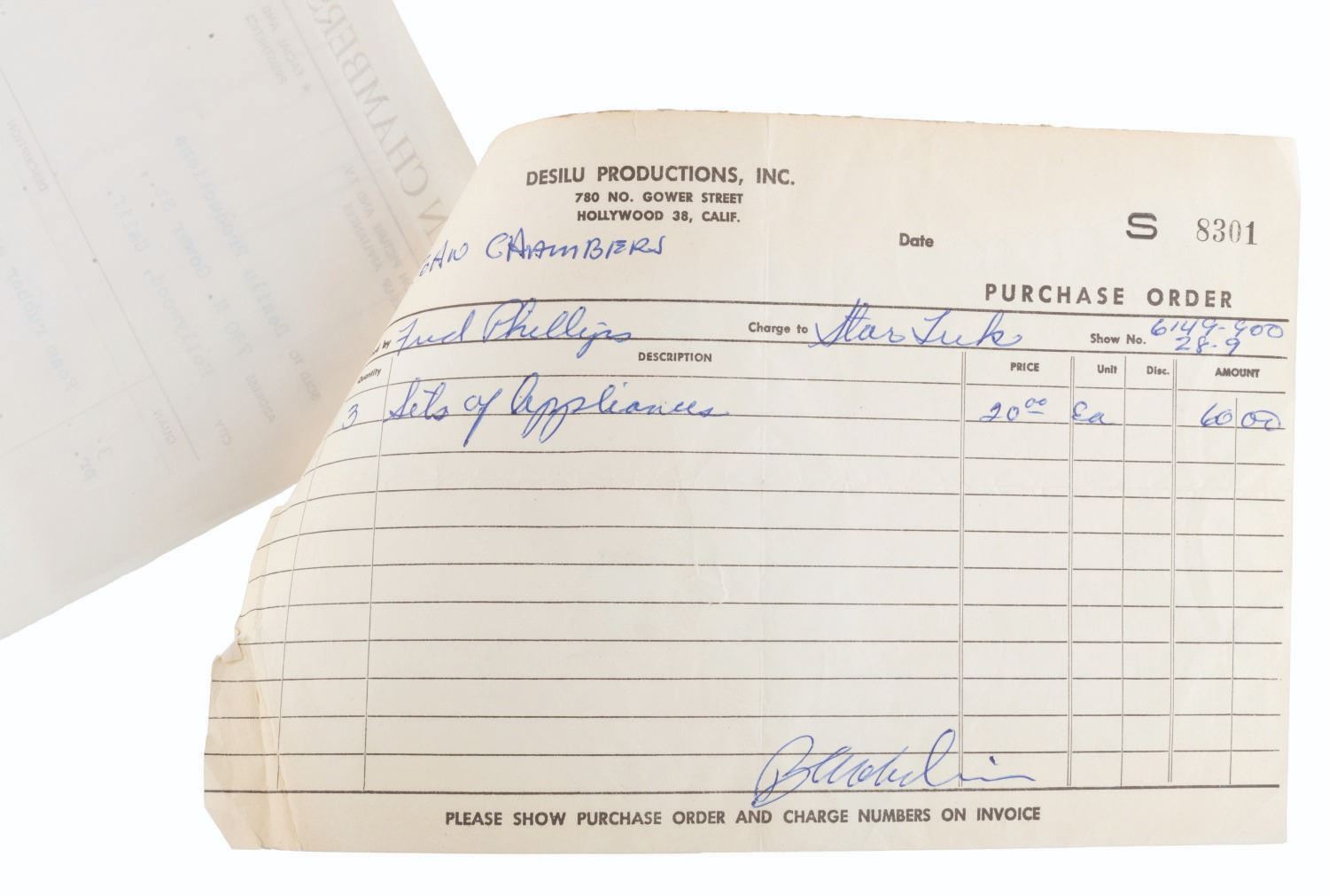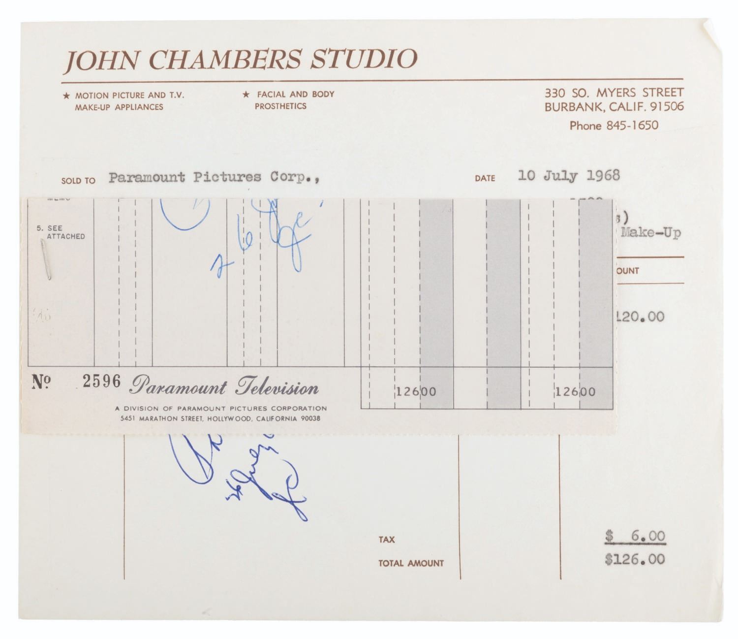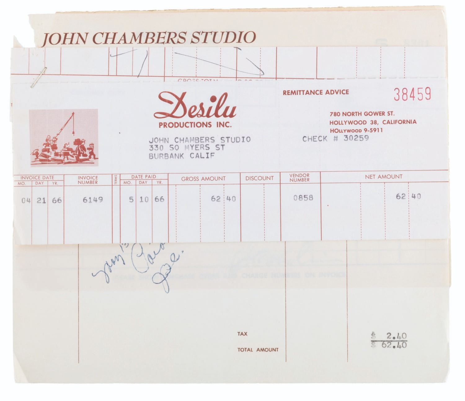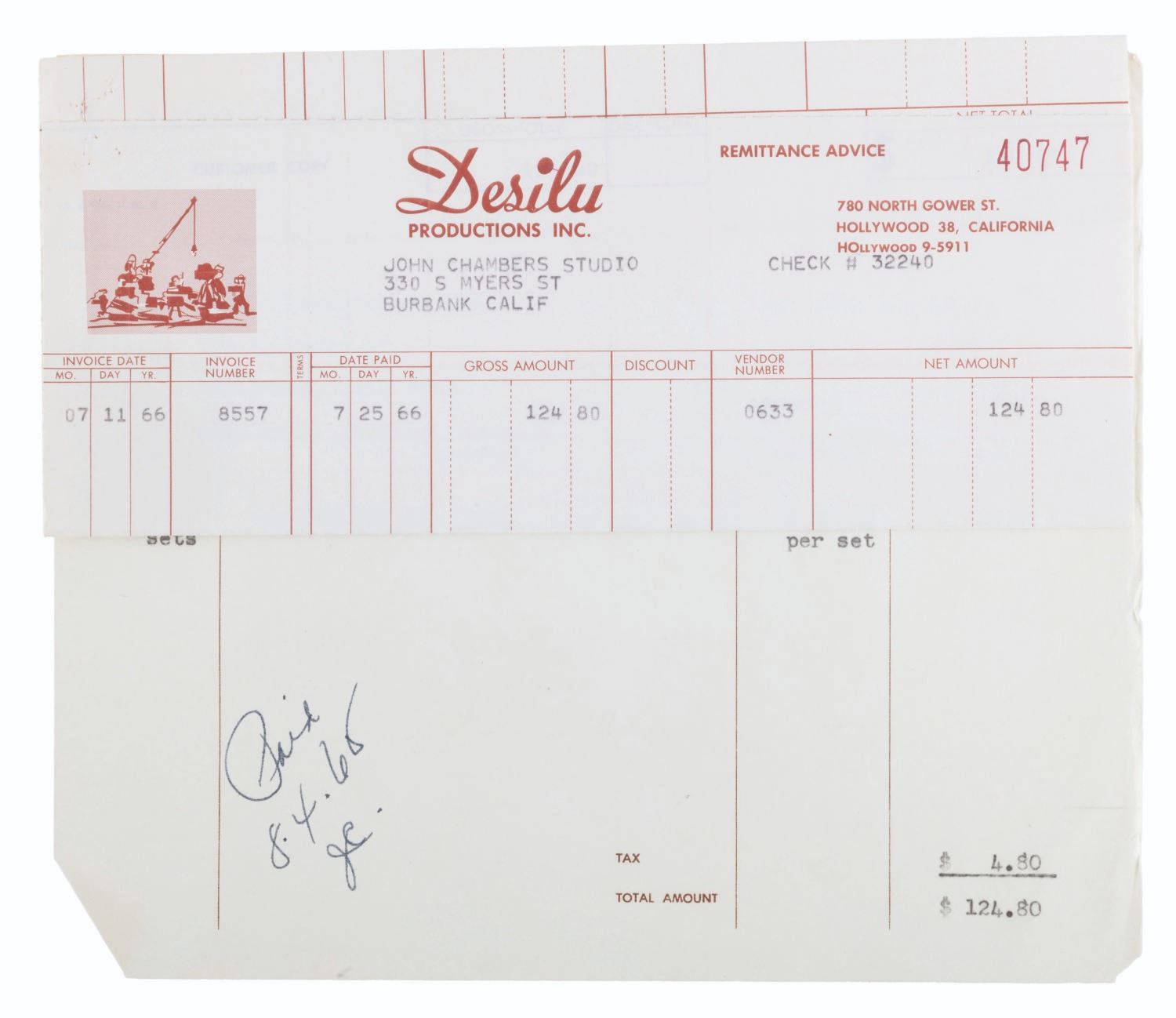 (Chambers/Desilu/Paramount, 1966-68) A collection of 11 invoices from John Chambers Studio for Spock ears used in key Spock episodes of "Star Trek." Comparing invoice dates to production dates confirms this batch of paperwork includes invoices for Spock ears worn in the episodes "Charlie X," “Shore Leave,” "City on the Edge of Forever," "Amok Time,” Mirror, Mirror," “Journey to Babel,” "Spock's Brain," and “The Way to Eden.” Also included are invoices for bald caps that include "The Way to Eden," and of particular note the invoice for the first Spock ears produced by Chambers on April 21,1966, which actor Leonard Nimoy credited with essentially saving the show. The invoices are stapled to matching paperwork from Desilu and Paramount Studios, and include hand notations by John Chambers and others. Measuring up to 7.5" x 8.75" each, the paperwork is in very good condition with typical wear from handling and age, including some color shift to paper, and wear around staples.