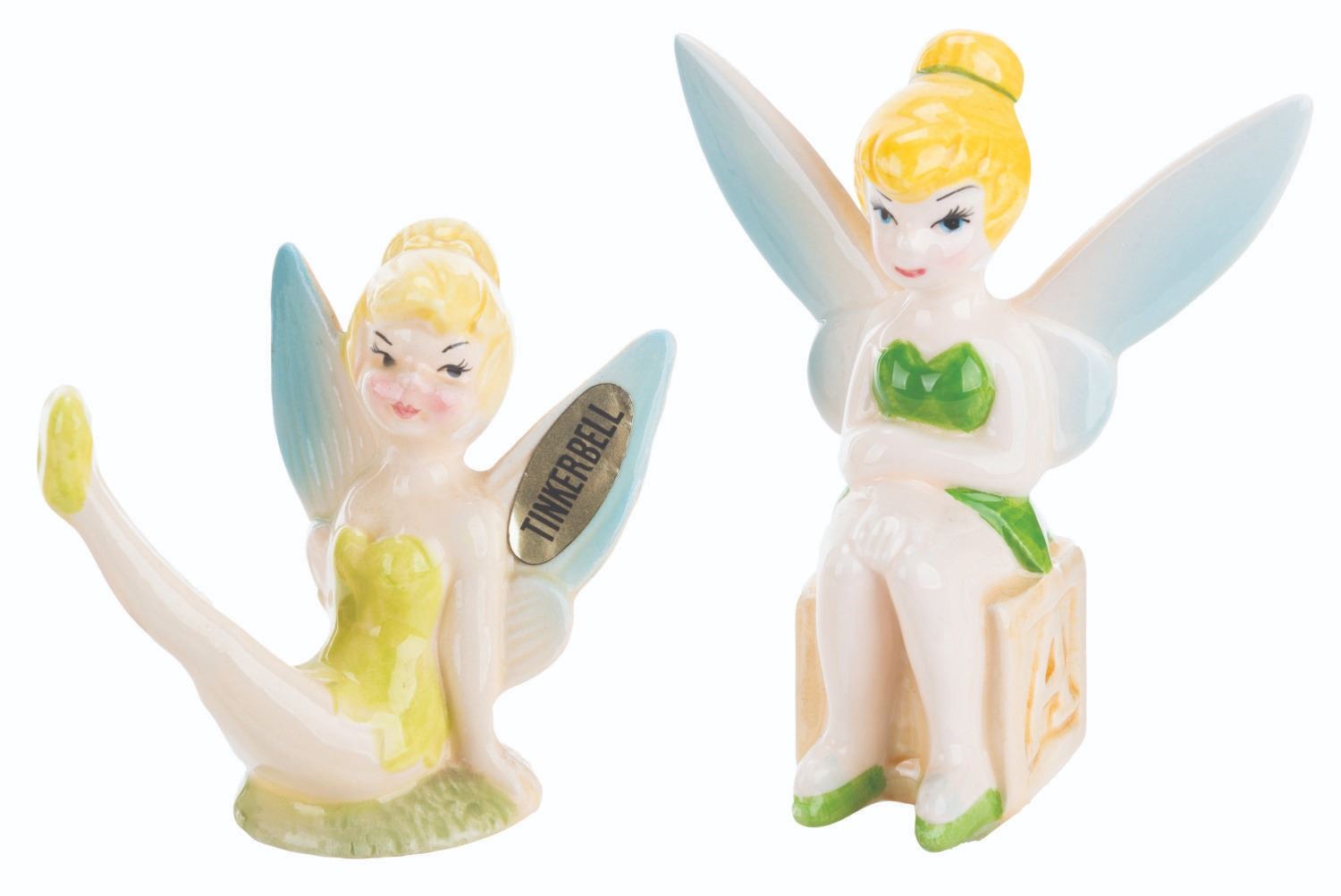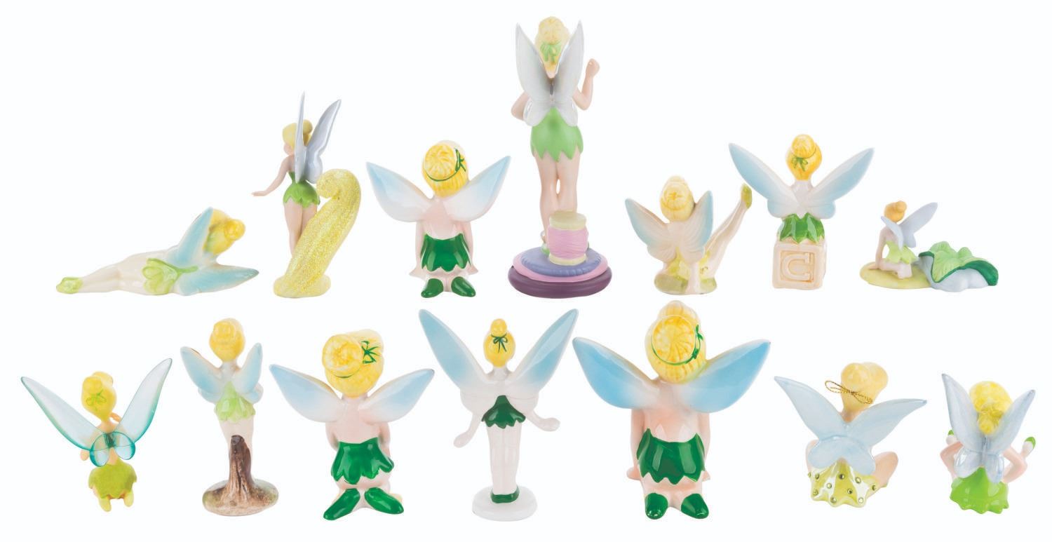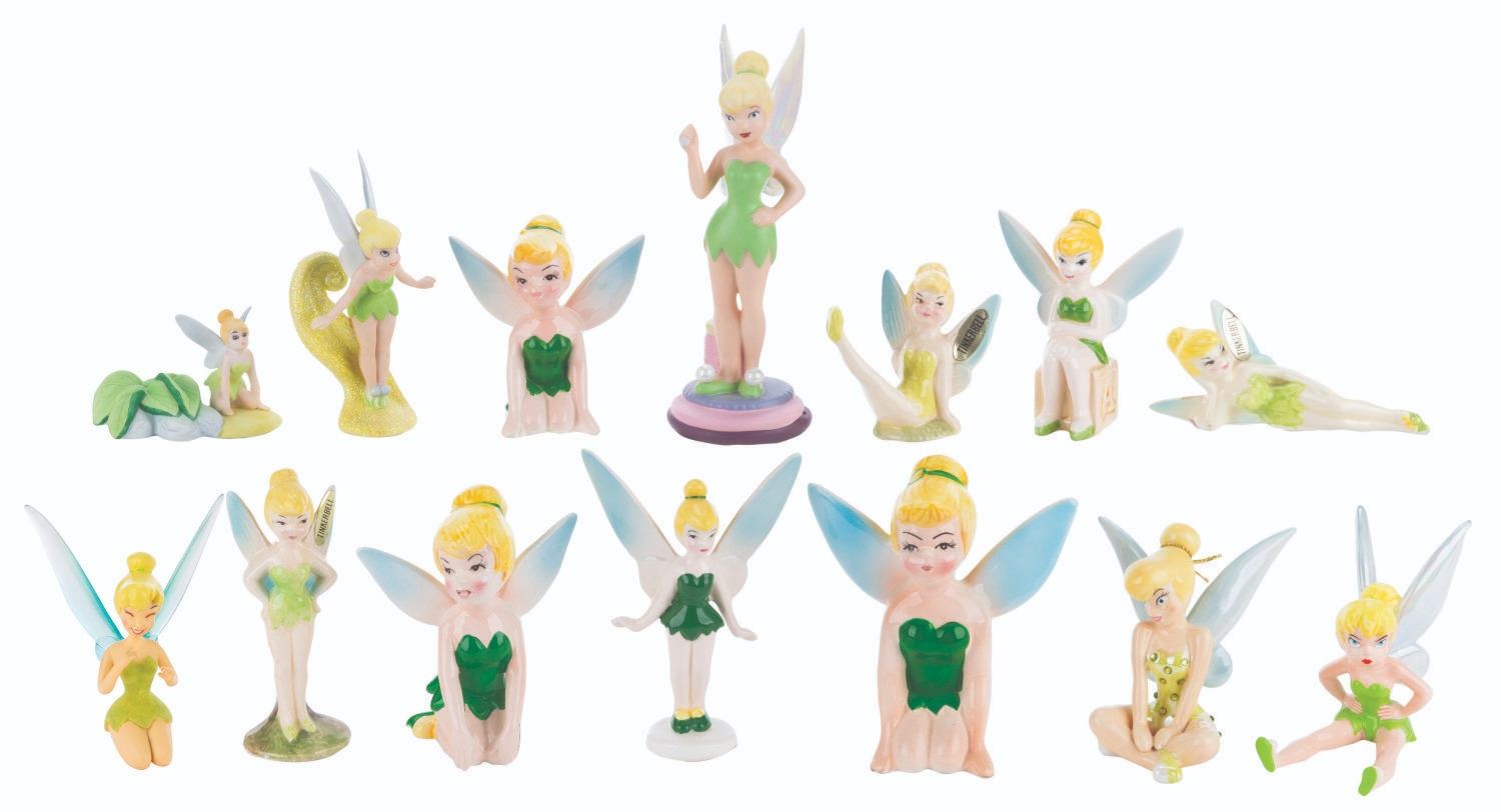 (Disney/Enesco, 1950-2000s) A delightful collection of 14 ceramic Tinker Bell figurines produced throughout the years. Measuring between 1.75" to 6", the figures are in fine condition, with one in very good condition showing a repair to a broken arm.