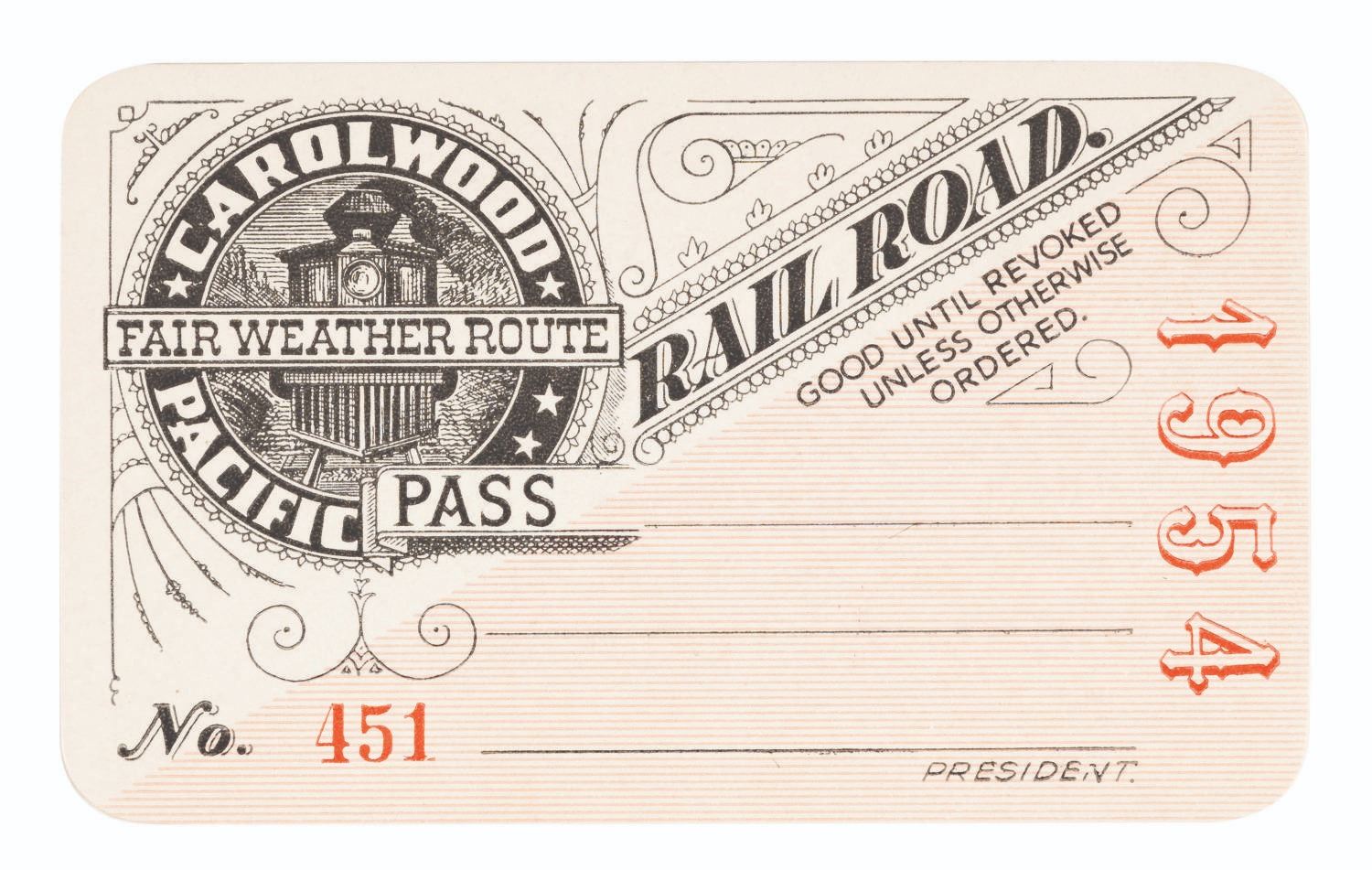 (Disney, 1954) A rare collection of 17 unused passes from Carolwood Pacific Railroad, Walt’s personal backyard railroad. Due to the limited capacity of the ride and ongoing safety issues, no further cards were issued after 1953. These 1954 passes were stored at the RETLAW offices and are sequentially numbered 450-466. Measuring 2.25” x 3.75” each, the passes are in fine condition.
