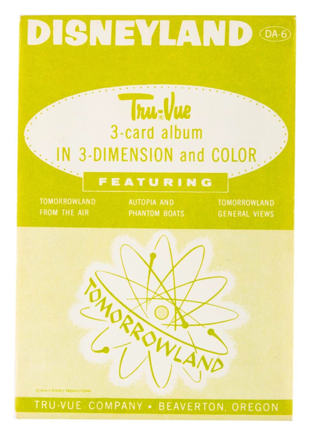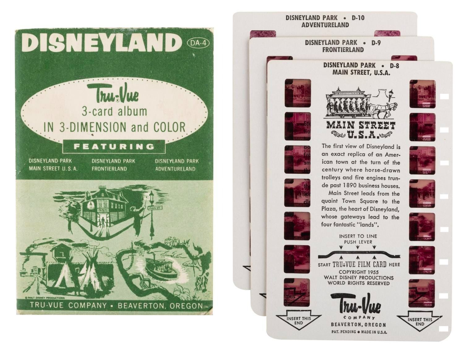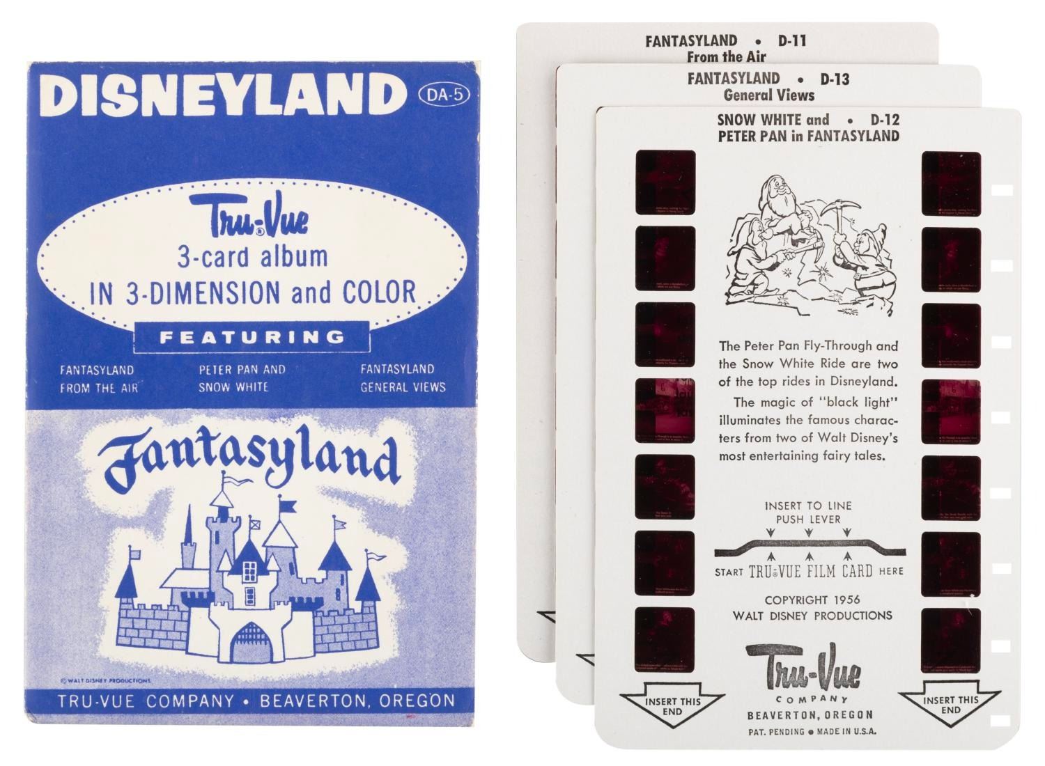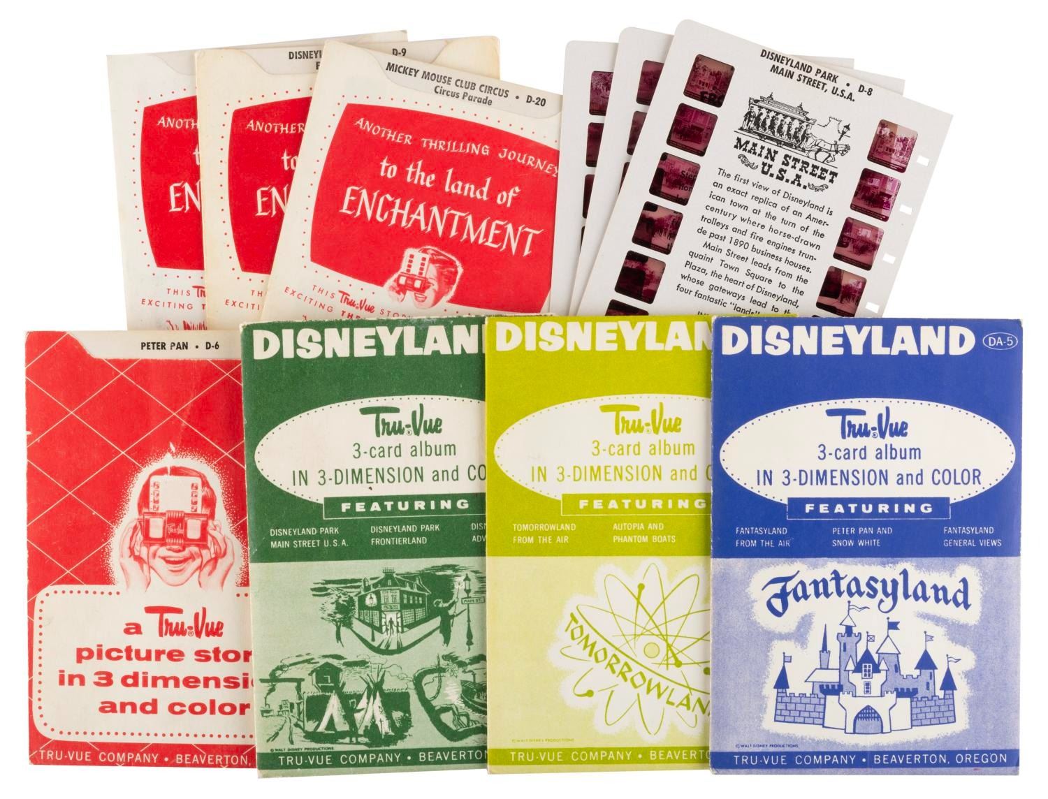 (Disney, 1955) A collection of Tru-Vue 3-D packs of the opening year of Disneyland. Included are two single packs of Frontierland, a single Mickey Mouse Club Circus, and a single pack of the film "Peter Pan." The three packs include sets on Fantasyland, Tomorrowland, and Main Street with Frontierland and Adventureland. Each measuring 4" x 5", the Tru-Vue slides are in very good condition with light handling wear and color fading typical of age. The envelopes are overall in good condition with edge wear and some pencil marks and the Tomorrowland set sealed with slides presumed in fine but faded condition.
