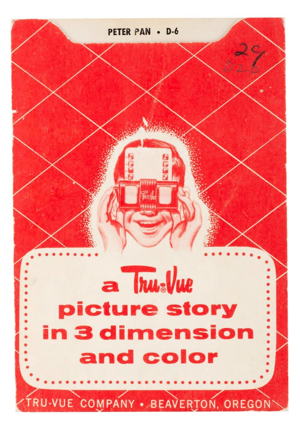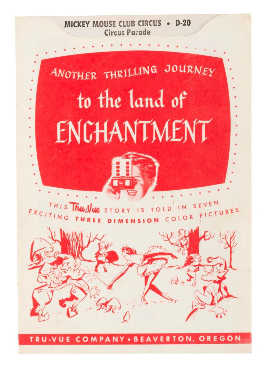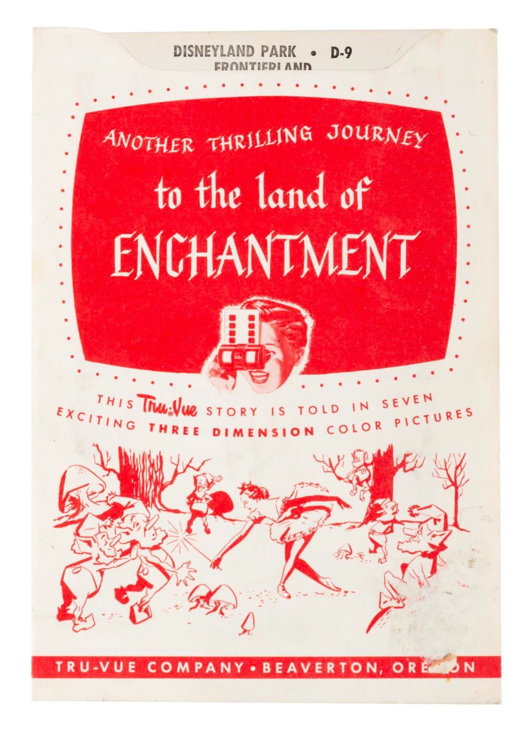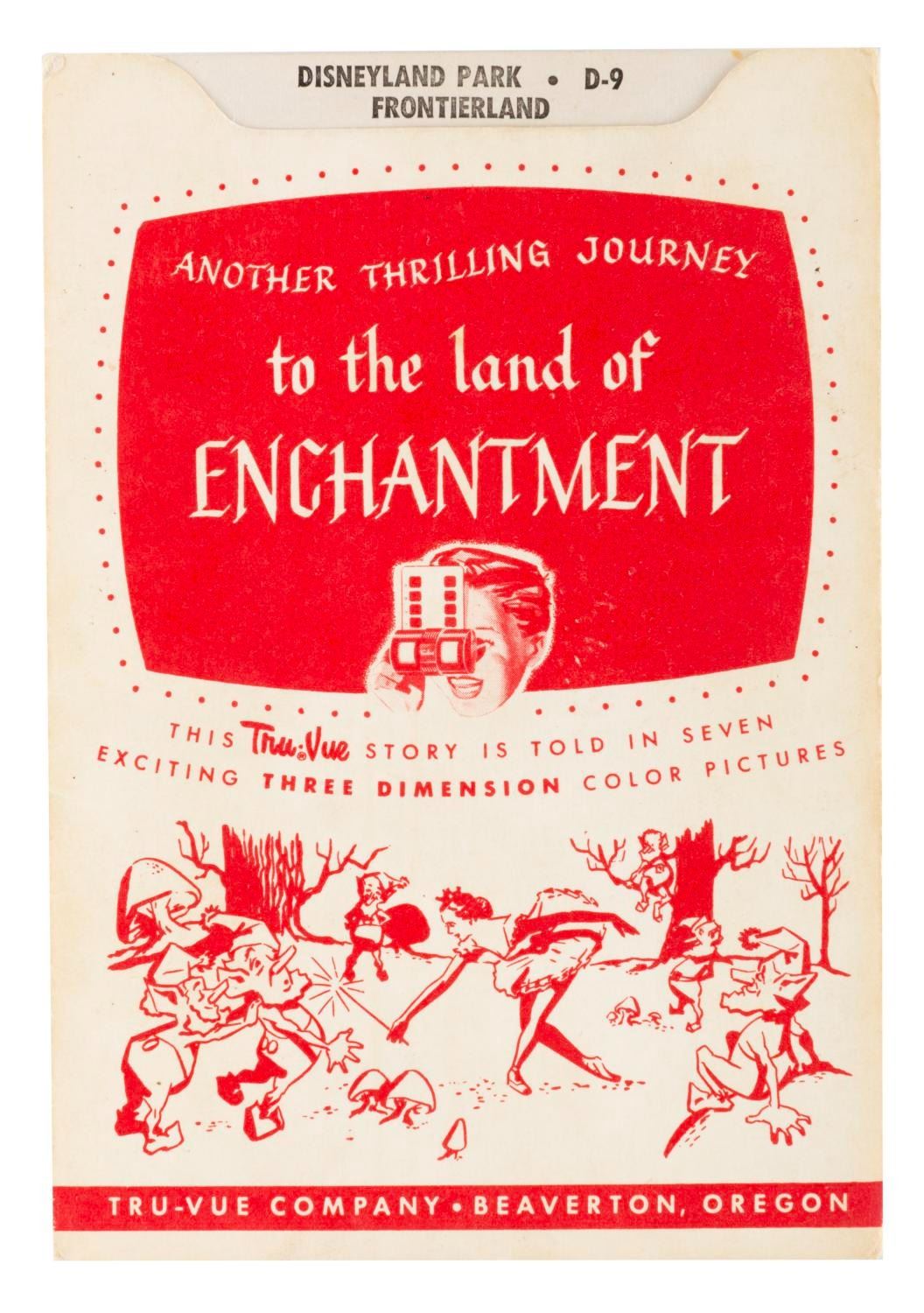 (Disney, 1955) A collection of Tru-Vue 3-D packs of the opening year of Disneyland. Included are two single packs of Frontierland, a single Mickey Mouse Club Circus, and a single pack of the film "Peter Pan." The three packs include sets on Fantasyland, Tomorrowland, and Main Street with Frontierland and Adventureland. Each measuring 4" x 5", the Tru-Vue slides are in very good condition with light handling wear and color fading typical of age. The envelopes are overall in good condition with edge wear and some pencil marks and the Tomorrowland set sealed with slides presumed in fine but faded condition.