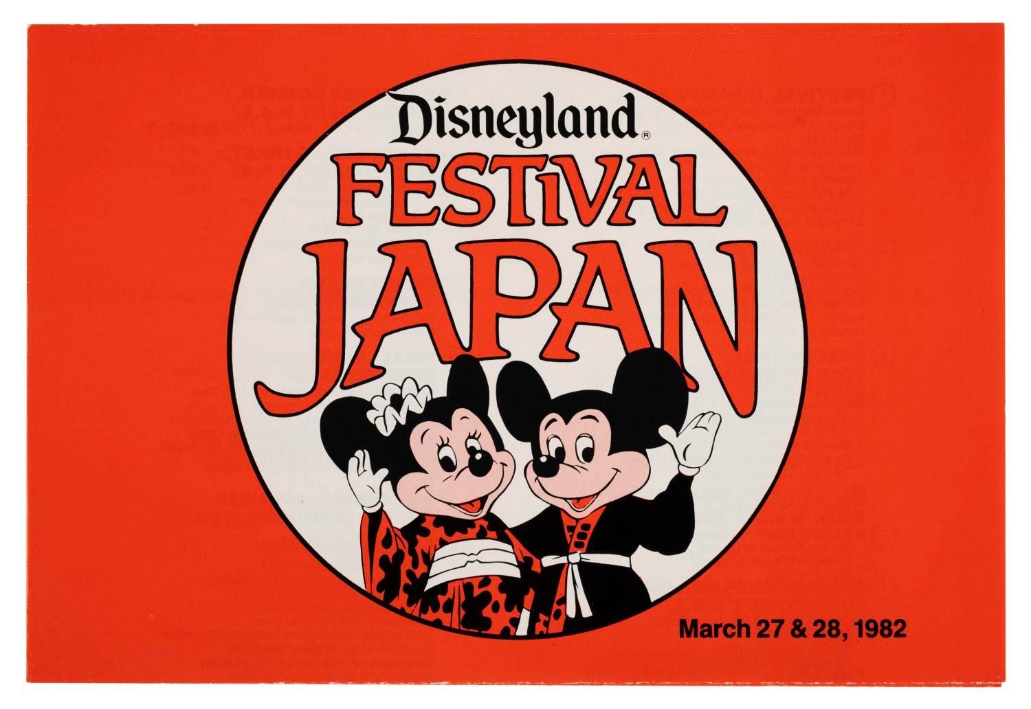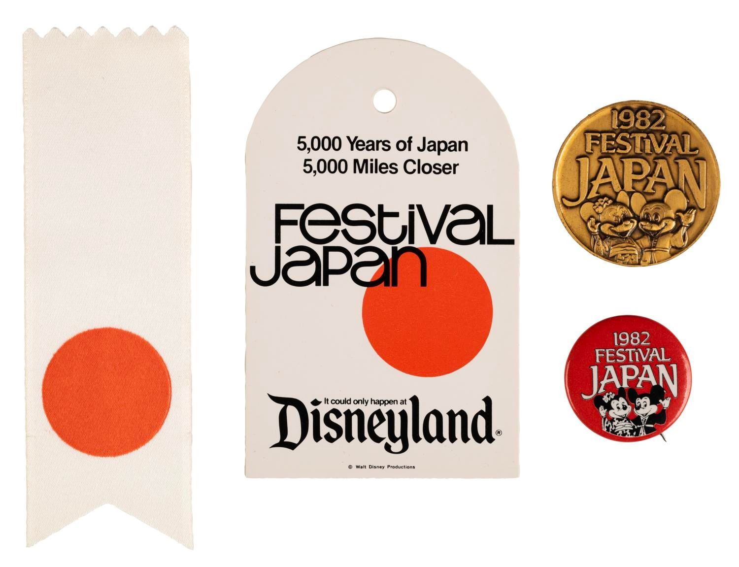 (Disneyland, 1982) A collection of five Disneyland 1982 Festival Japan Cast exclusives and souvenirs. Included are a program, a button, a paper tag, a ribbon, and a commemorative coin. Measuring 1.25" in diameter to 5" x 7.5", the items are in very good condition with light wear from use and small creases on the ribbon.