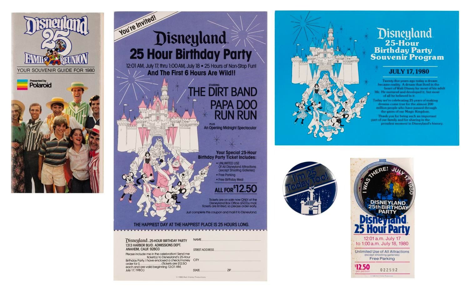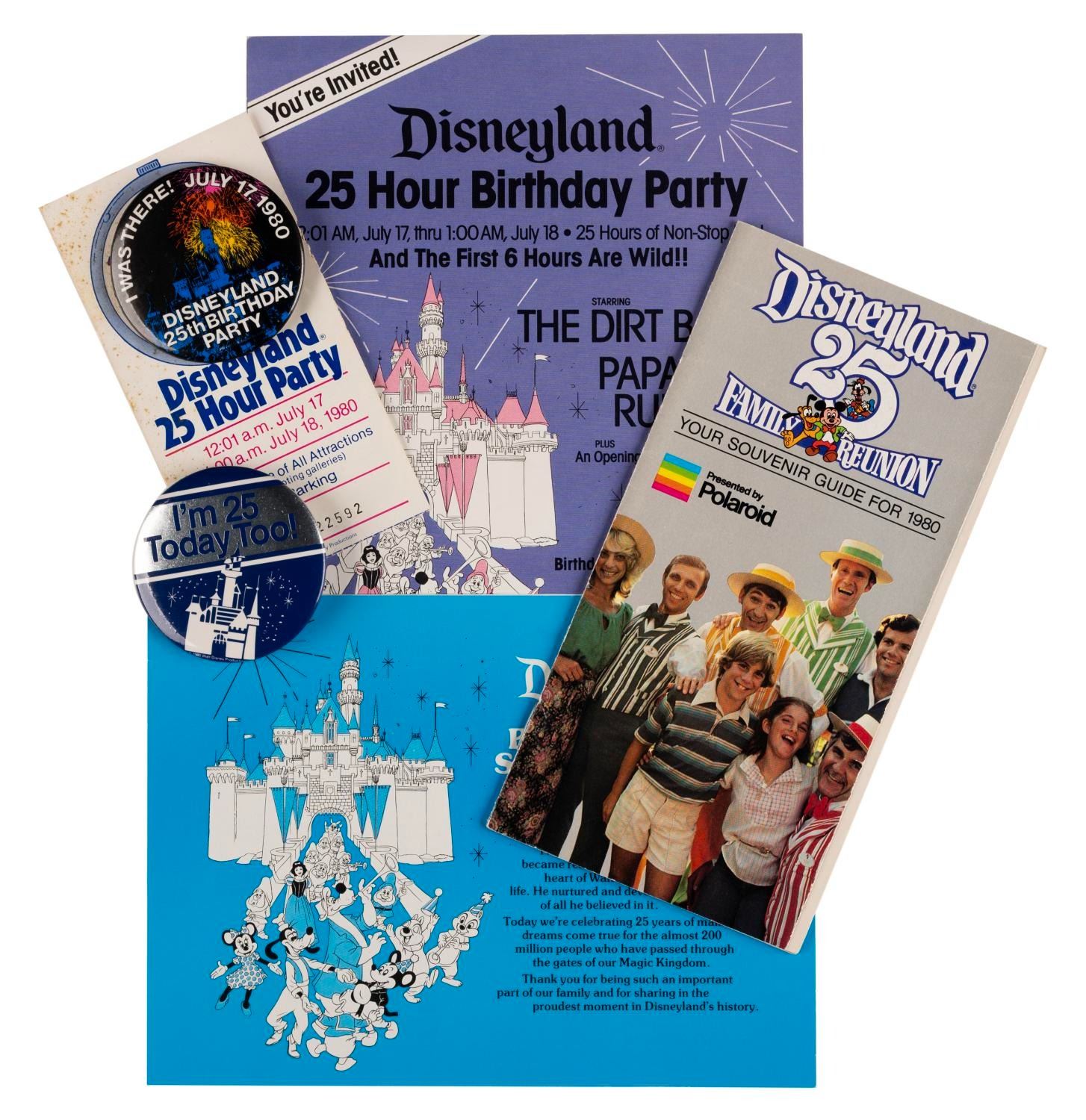(Disneyland, 1980) A collection of memorabilia from a 25-hour party celebrating the 25 Anniversary of Disneyland. The collection includes a single-sided 6" x 11" order form for tickets, a ticket with an attached button (missing stub), a rare "I'm 25 Today Too" button, a souvenir guide, and a 7.5" x 5.5" bi-fold program of events at the party. All are in very good condition with light wear from use.