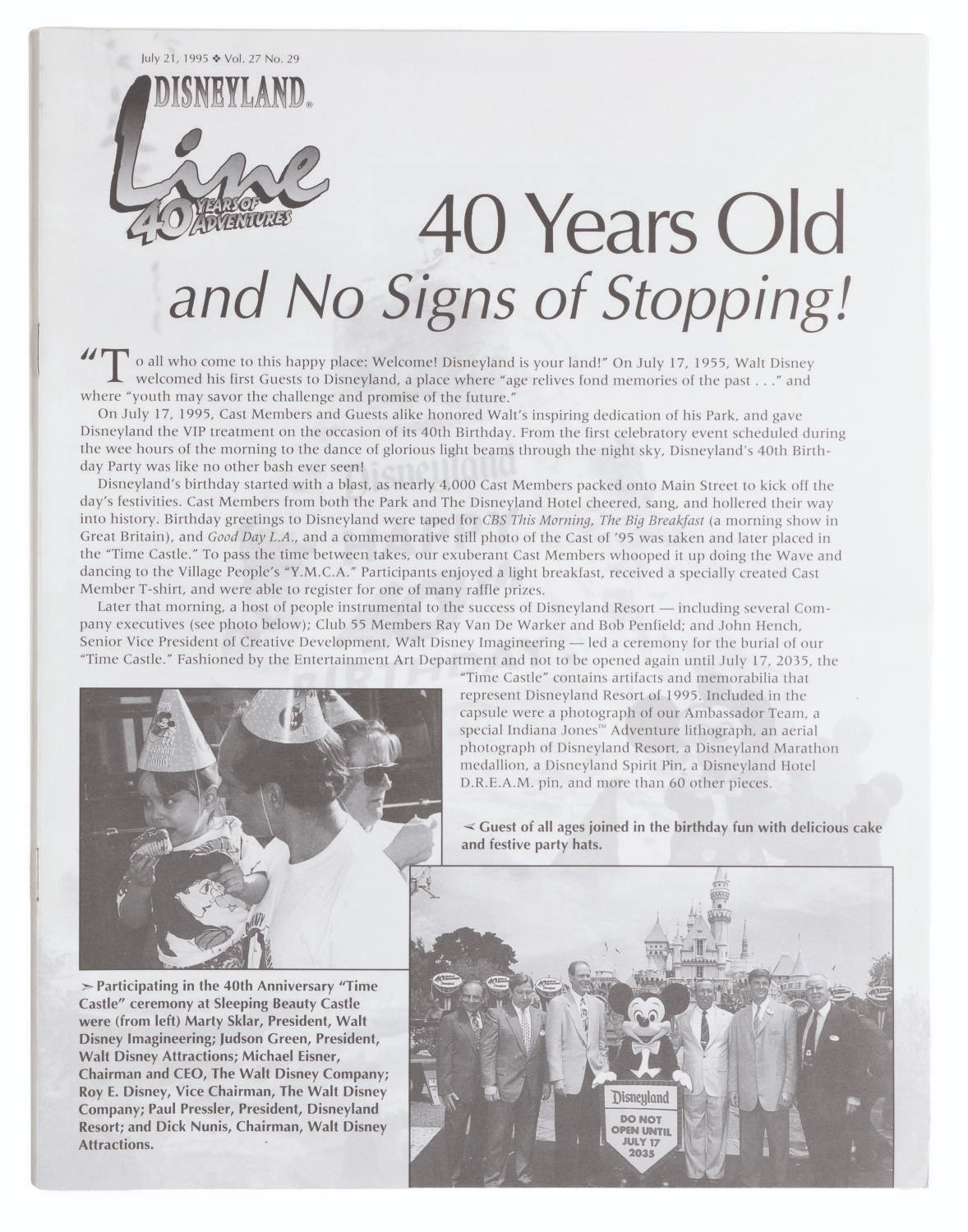 (Disneyland, 1985-97) A collection of 278 Disneyland Line newsletters. The weekly Cast Member publication features great photos and information on happenings at the Park, with the most detailed account of small and large changes to Disneyland throughout the years. Each measuring 8.5” x 11” with some duplicate issues throughout, the newsletters are overall in very good to fine condition, with typical light wear to some individual issues.