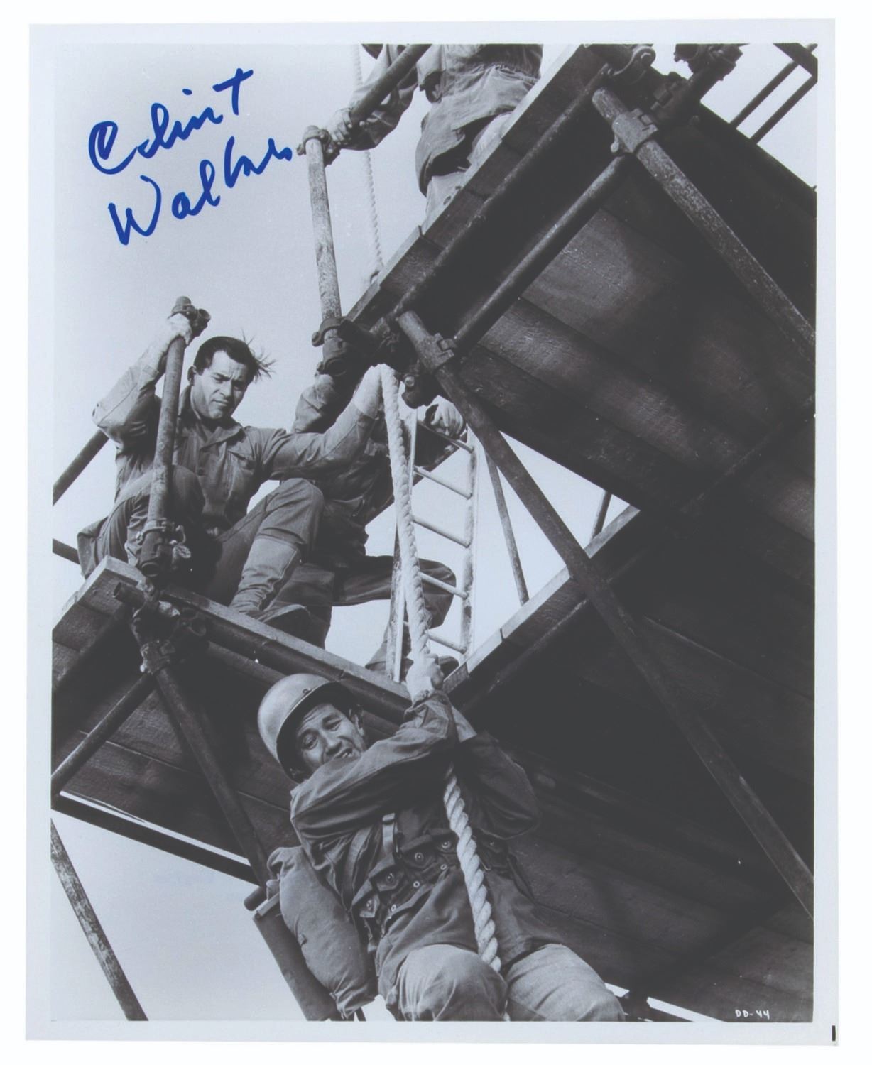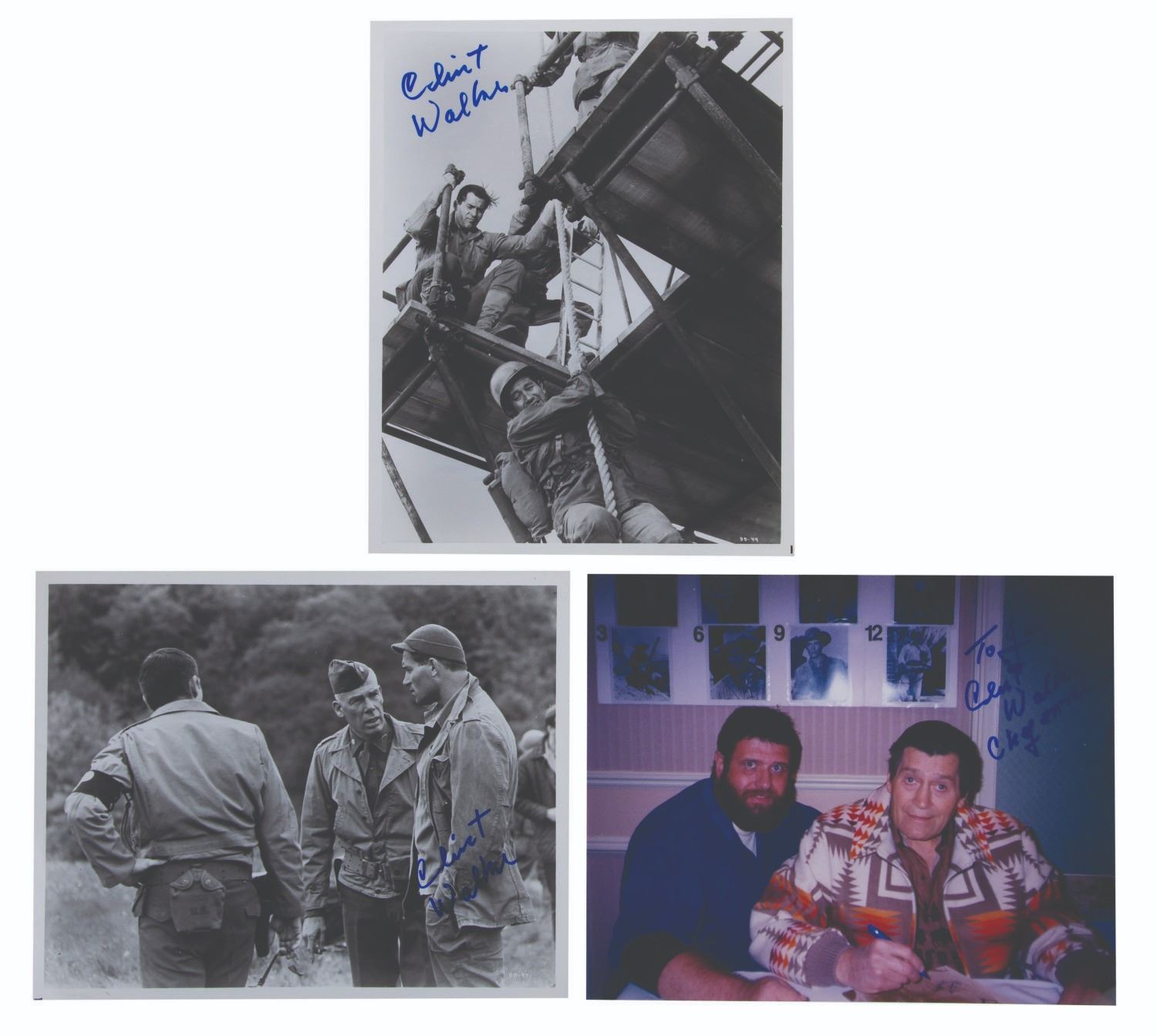 (Clint Walker, 1967-2000s) A collection of (3) photos signed by actor Clint Walker. Two are publicity photos from the 1967 film The Dirty Dozen, and the third is a later photo of Walker signing another photo, dedicated to a fan. Measuring 8"x10", the three photos with signatures are in very good condition.