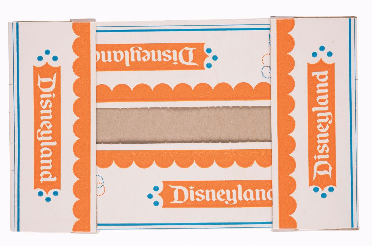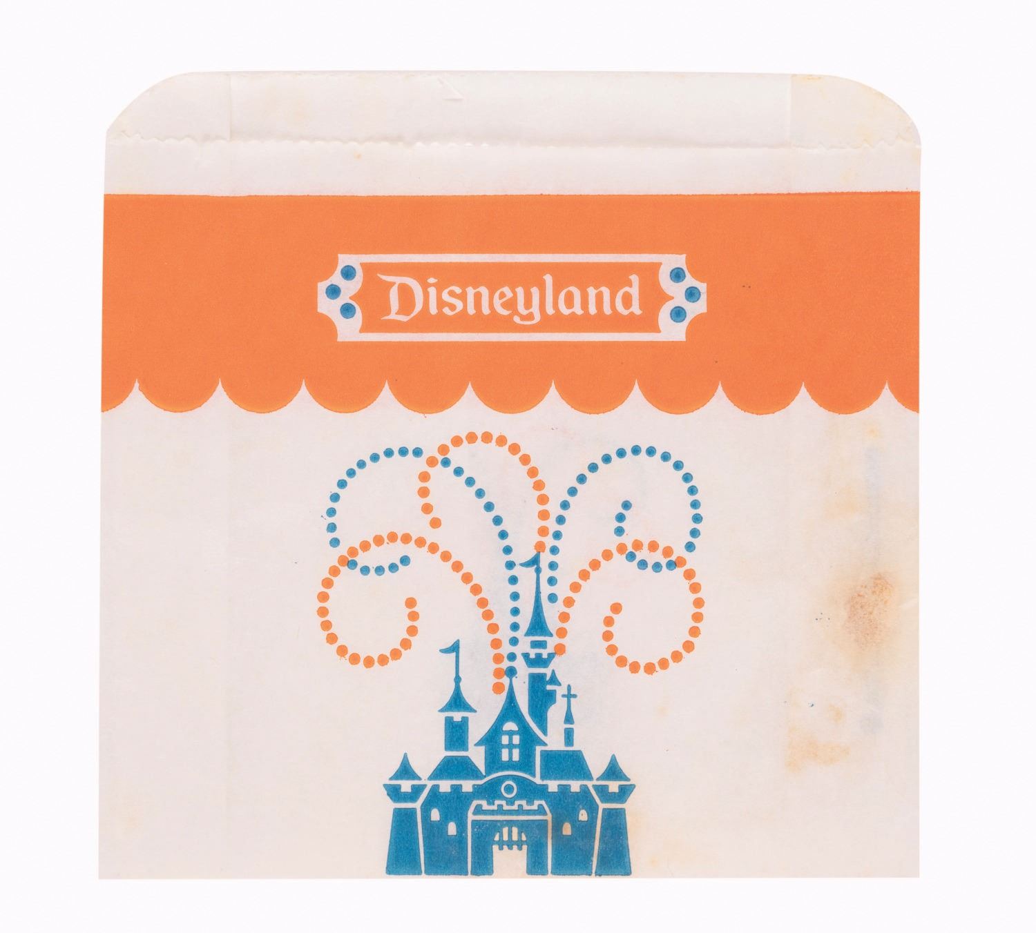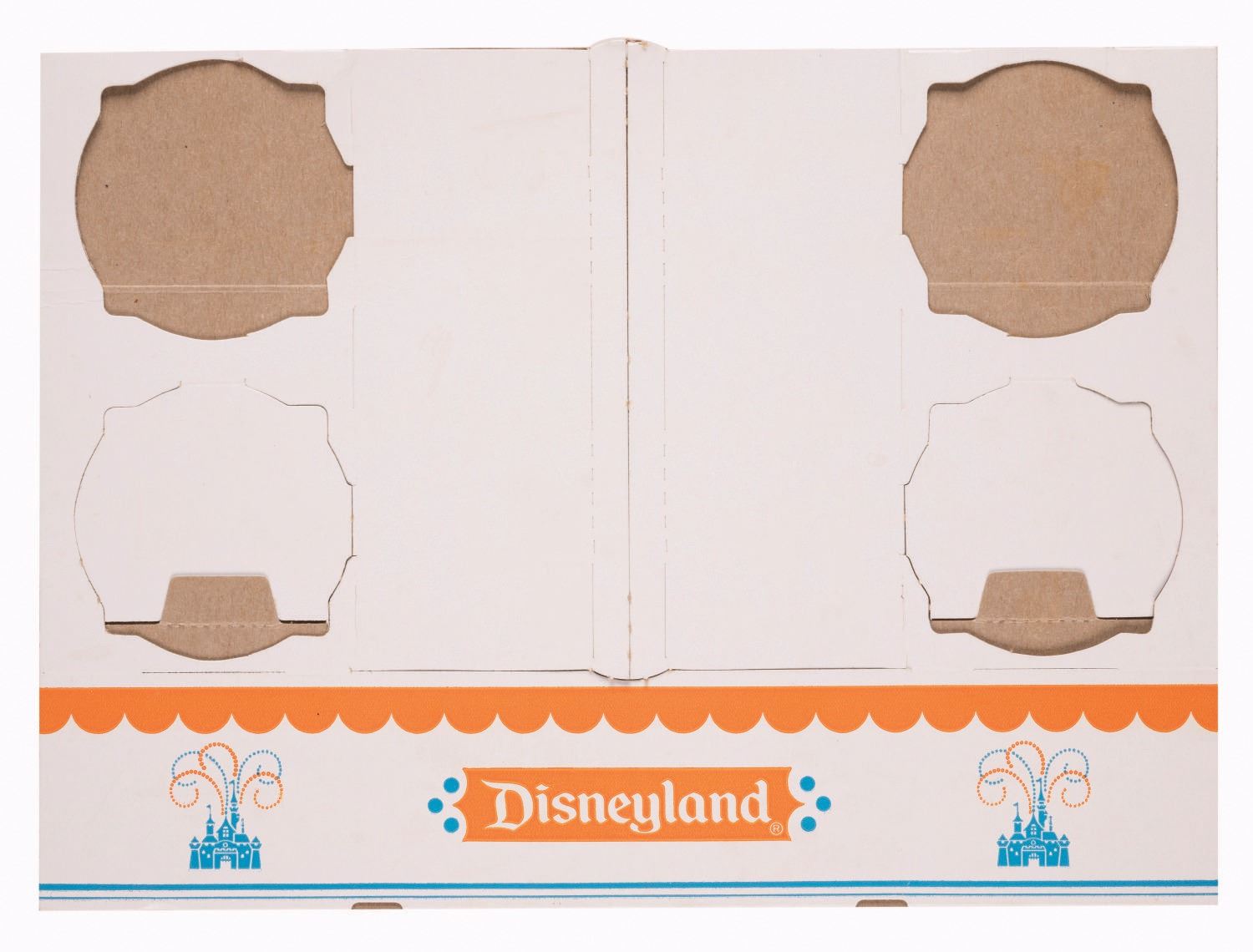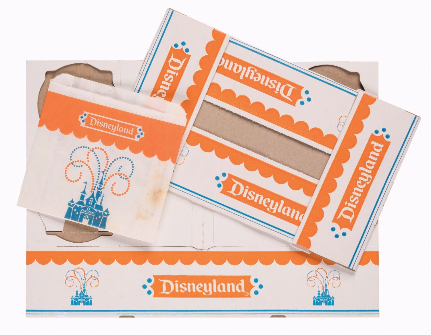 (Disneyland, 1960s-70s) A Collection of (3) Disneyland Food Service Containers. Among the lot are a small and large food container and small bag decorated with the memorable two-color Sleeping Beauty Castle motif of the 1960s and 1970s. The boxes are unfolded. Measuring from 12.5"x9" to 5.5"x5.5", the pieces are in fine to very good condition, with light wear to the bag from handling.