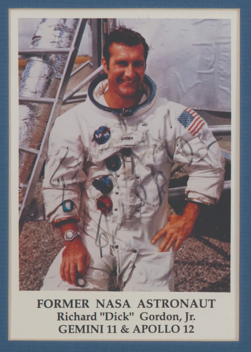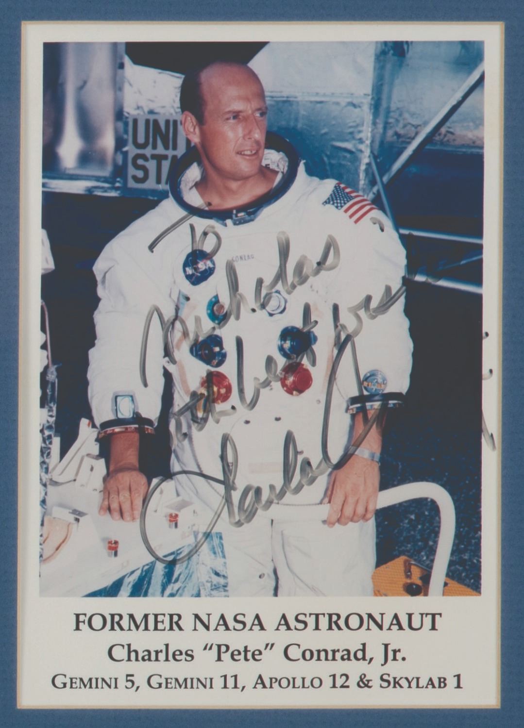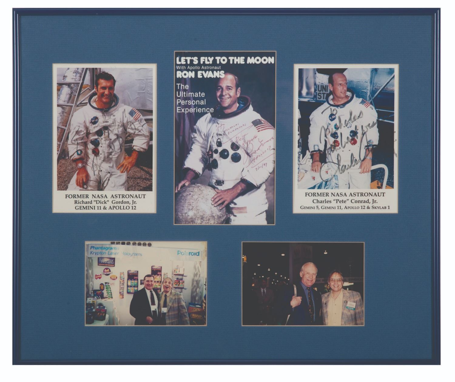 (NASA, 1980s-1990s) A collection of (3) signed and dedicated photos of NASA astronauts. Included are photos of Dick Gordon Jr. (Gemini 11 & Apollo 12), Ron Evans (Apollo 17) and Pete Conrad Jr. (Gemini 5 & 11, Apollo 12, & Skylab). Measuring from 5"x7" to 4.75"x8", the photos with autographs are in very good condition, with Gordon's signature exhibiting some fading.