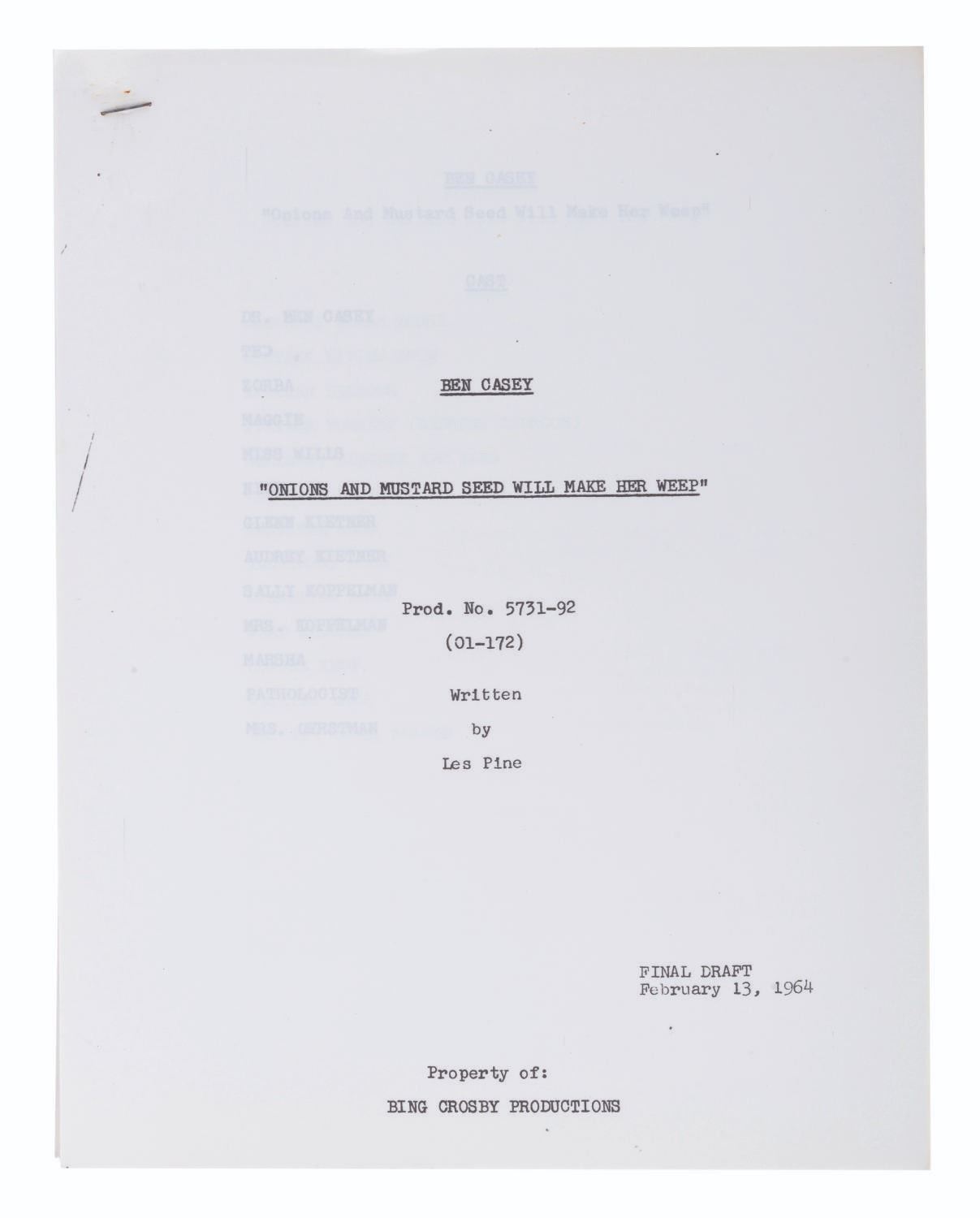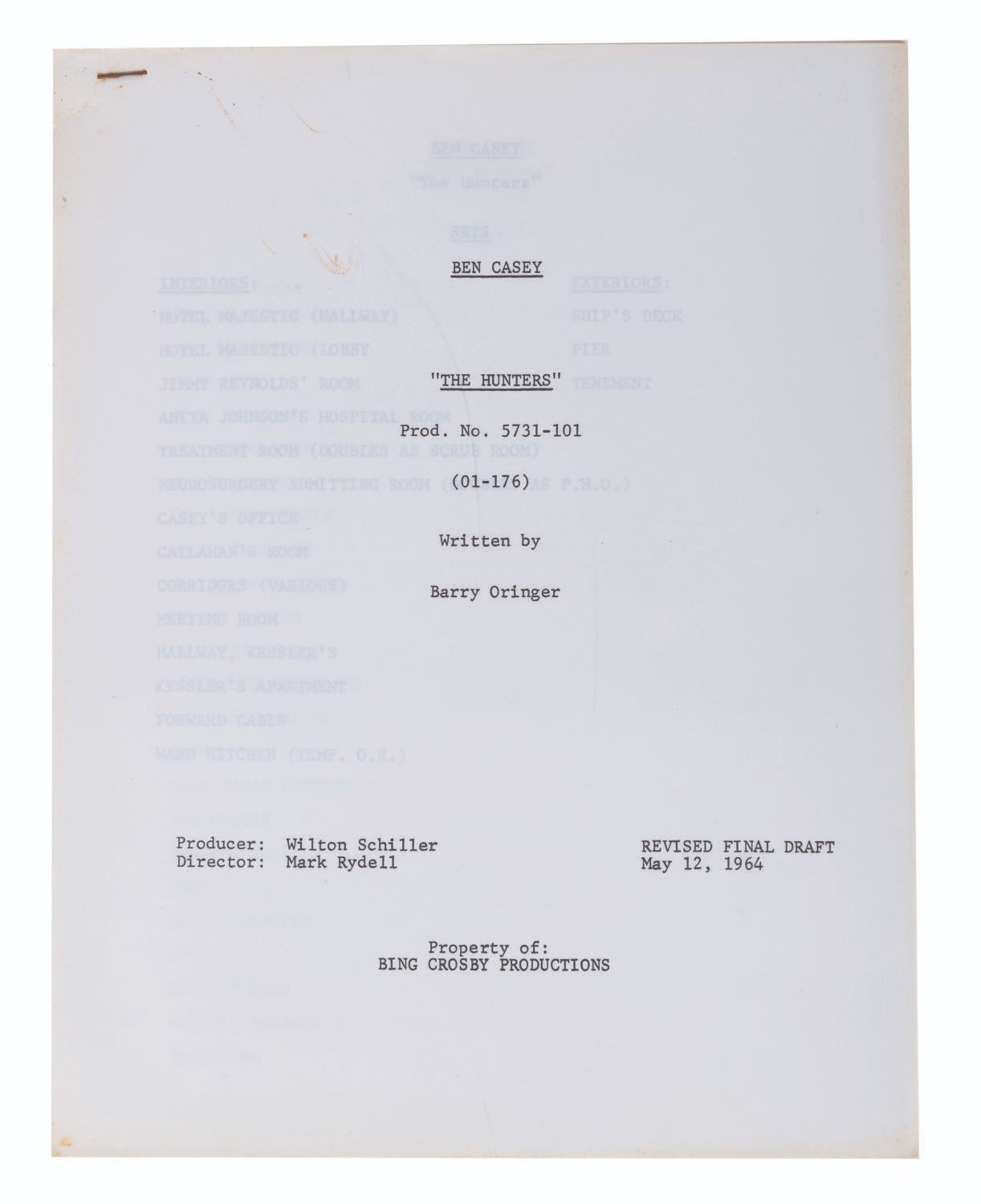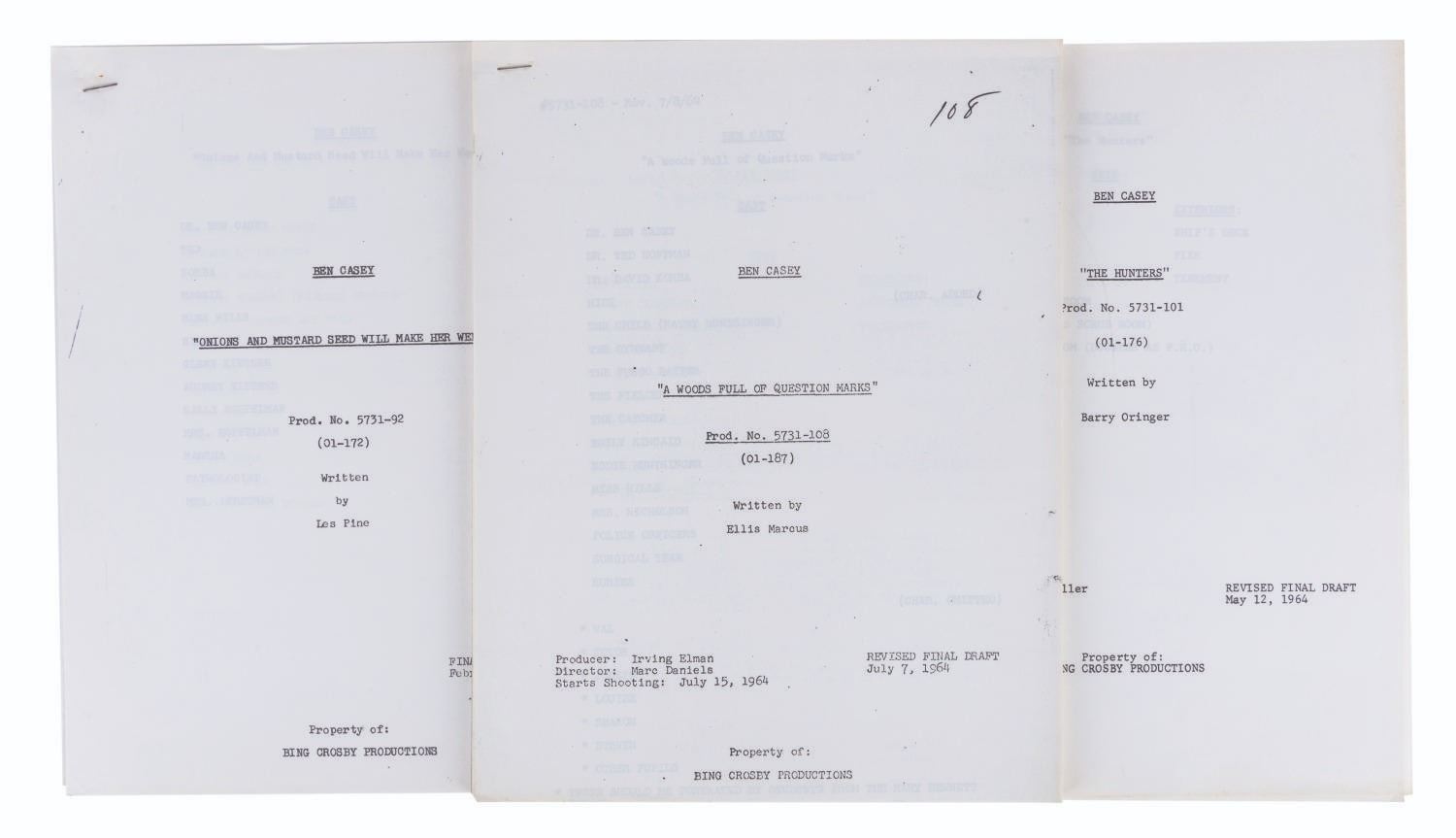 (Bing Crosby Productions, 1964) A Set of (3) Original Ben Casey Scripts. Ben Casey was a groundbreaking mid-60s medical drama produced by Bing Crosby Productions, starring Vince Edwards as neurosurgeon Ben Casey, and was notable for its accuracy owing to its technical advisor Dr. Allan Max Warner. These scripts were composed for its third season, by American television screenwriters Les Pine, Barry Oringer, and Ellis Marcus. This collection includes (1) a Final Draft of "Onions and Mustard Seed Will Make Her Weep" and (2) Revised Final Drafts of "The Hunters" and "A Woods Full of Question Marks." Measuring 8.5"x11.25", these scripts are in very good condition with wear to pages from handling and age.