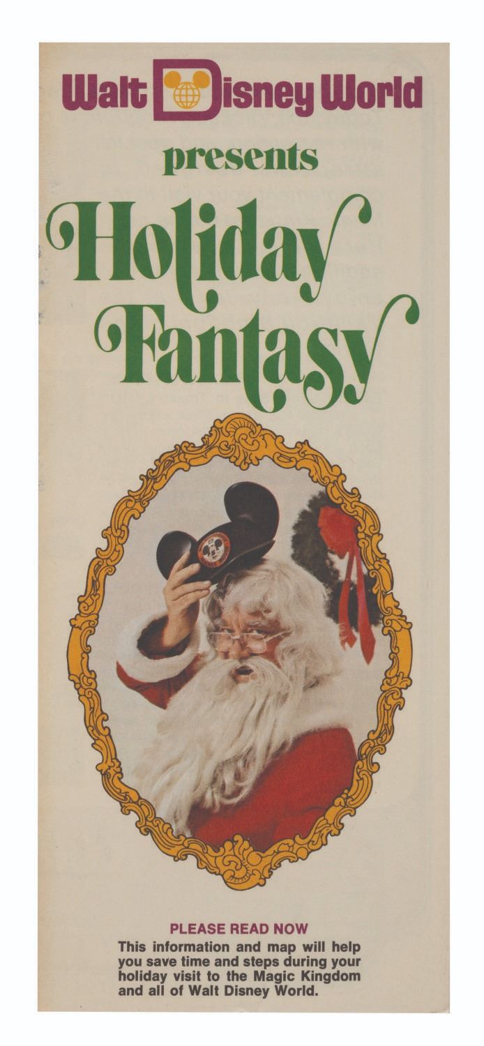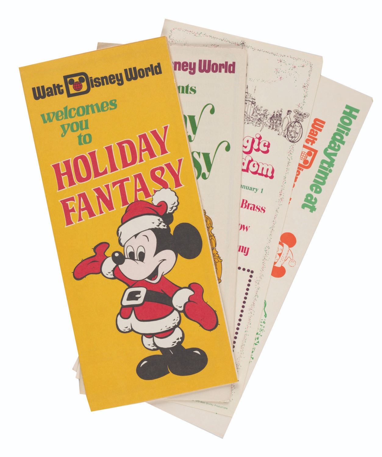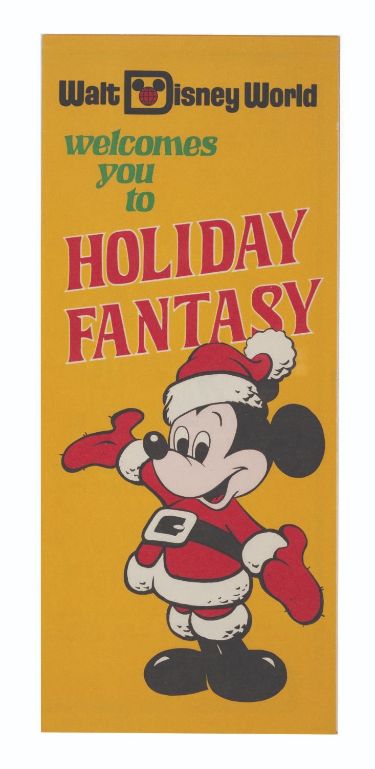 (Walt Disney World, 1973) A collection of (4) Walt Disney World Holiday Fantasy Fliers & Brochures. These pieces of Main Gate Admission Media announce the entertainment, admission prices, and hours for Fantasy on Parade in The Magic Kingdom. Measuring 3.75”x8.5” and 4”x9”, each piece is in very good condition with minor wear to their edges and corners.