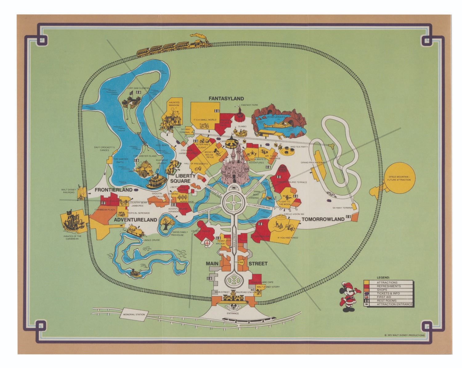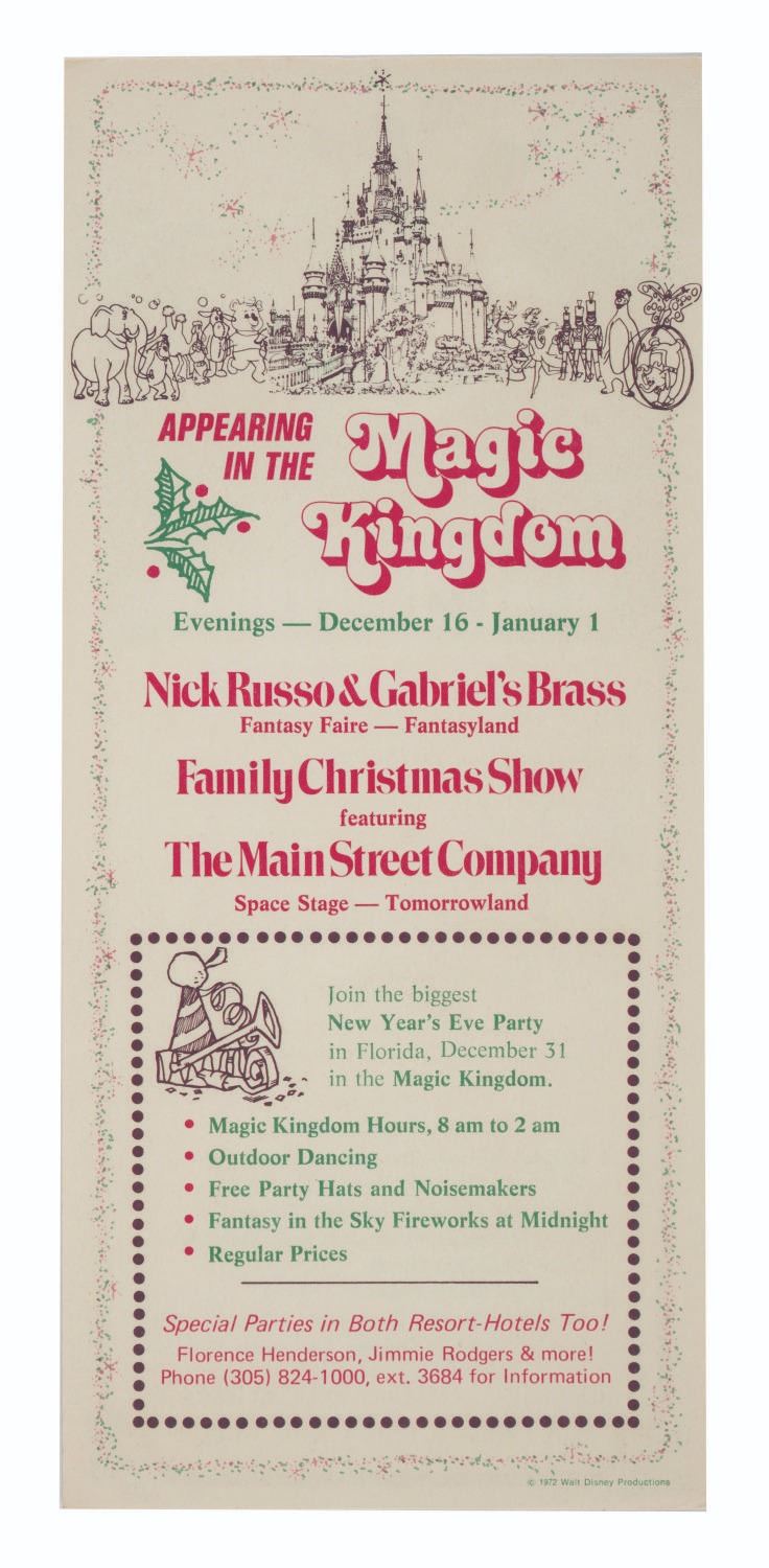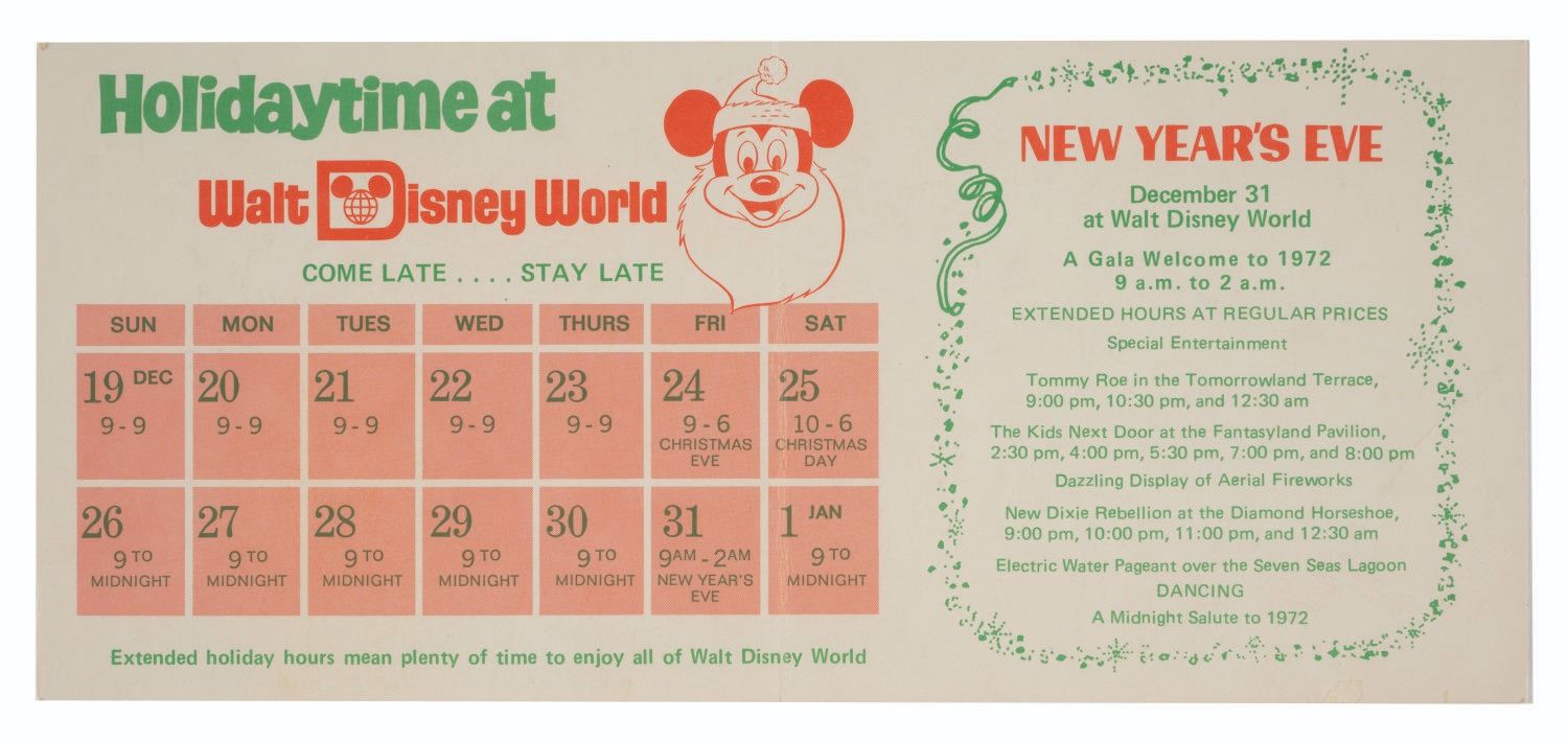 (Walt Disney World, 1973) A collection of (4) Walt Disney World Holiday Fantasy Fliers & Brochures. These pieces of Main Gate Admission Media announce the entertainment, admission prices, and hours for Fantasy on Parade in The Magic Kingdom. Measuring 3.75”x8.5” and 4”x9”, each piece is in very good condition with minor wear to their edges and corners.