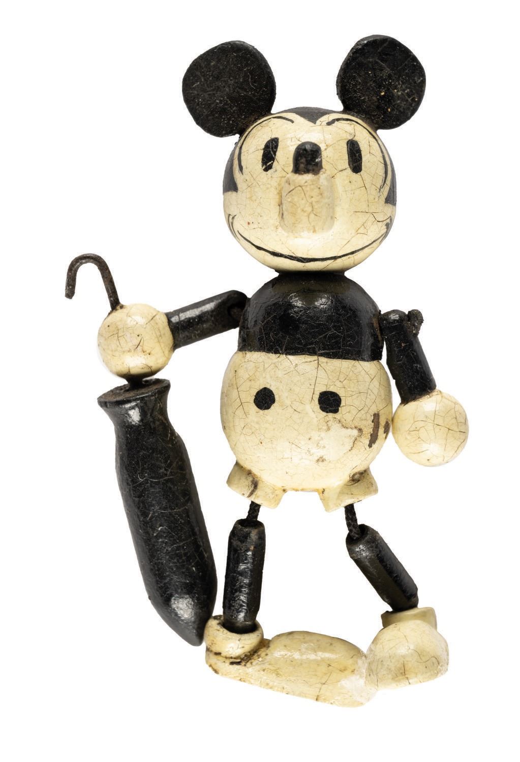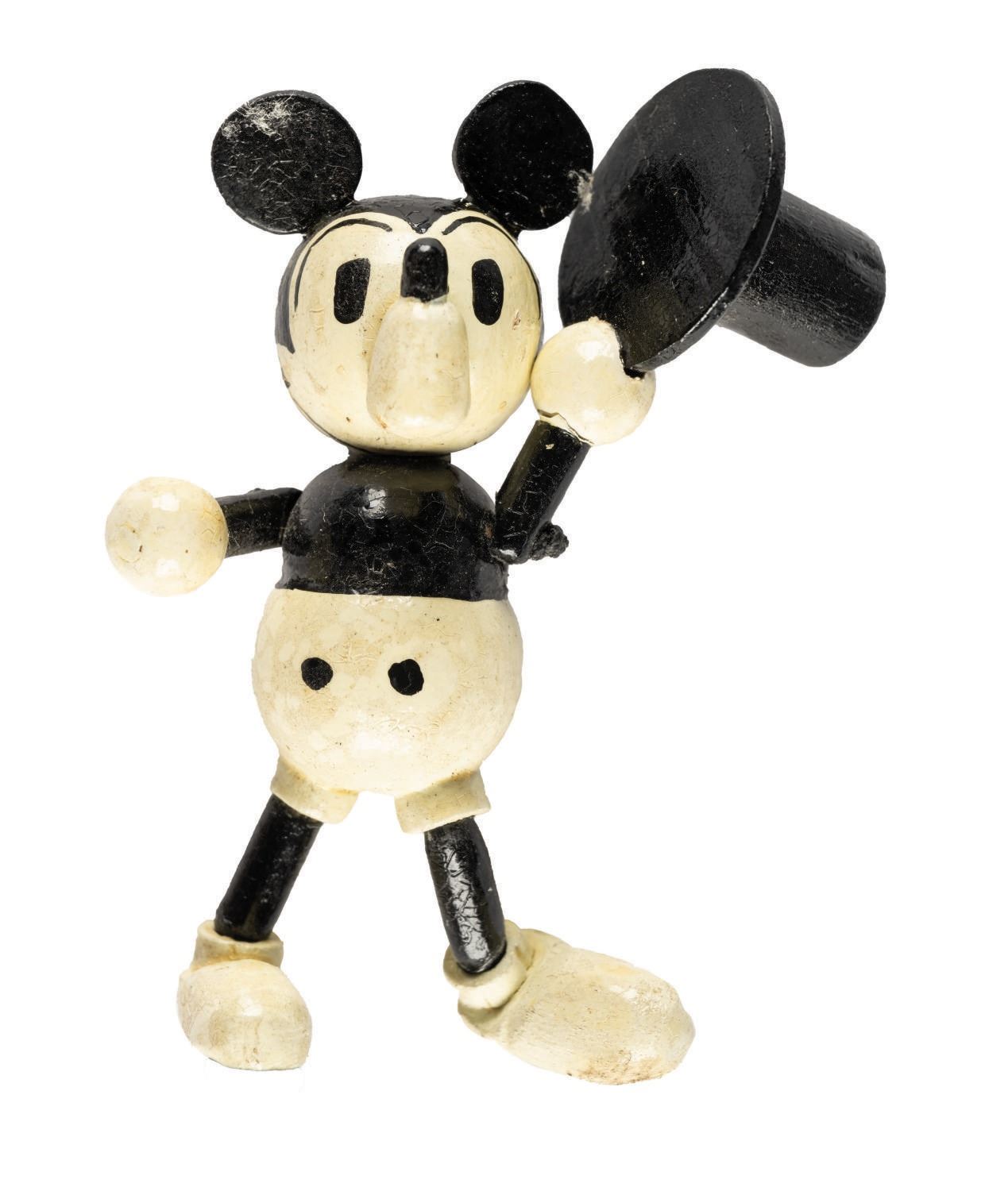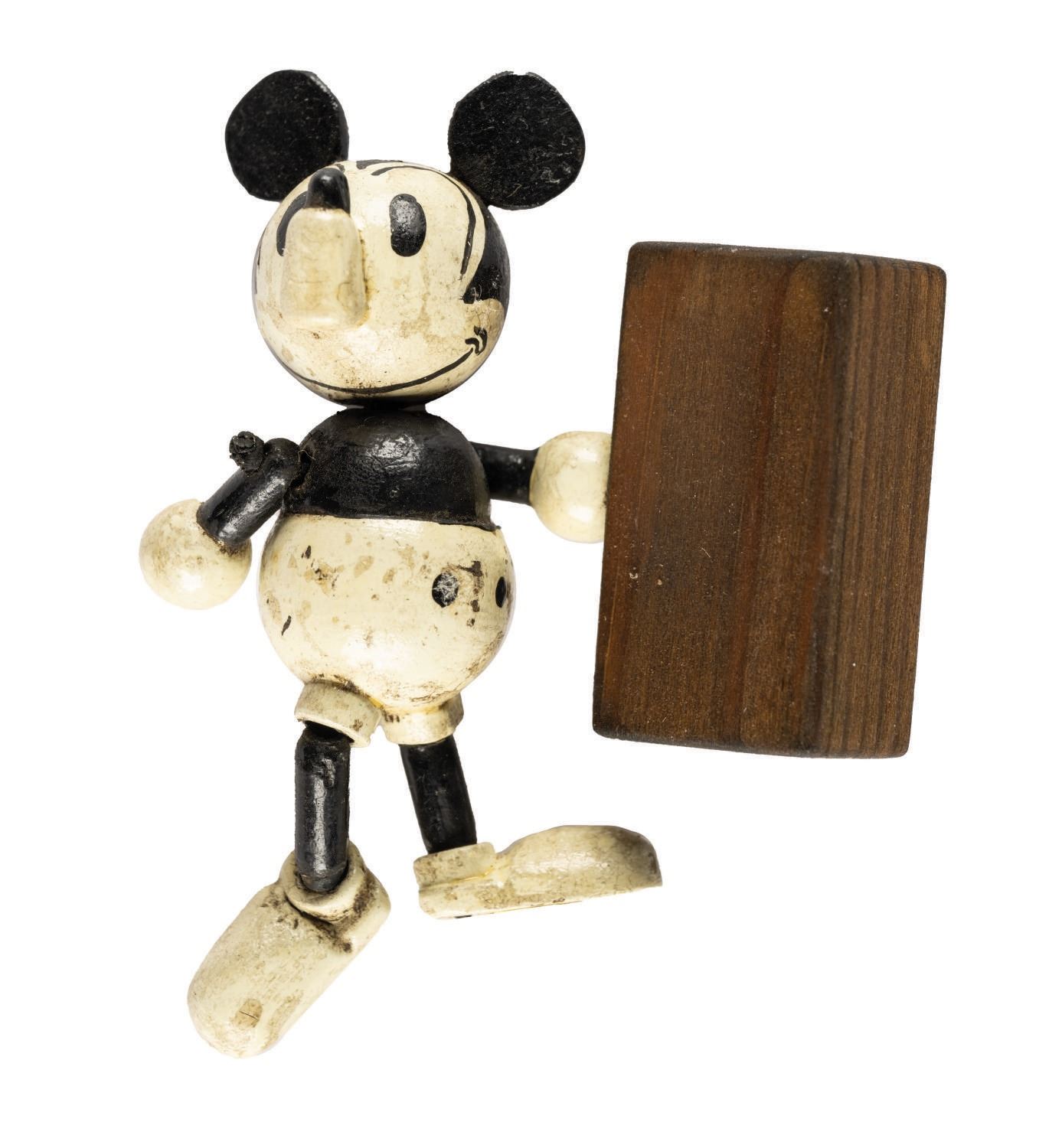 (Germany, 1930s) A collection of (4) wooden jointed Mickey toys distributed in Germany by UFA. Each figure stands around 2.5" tall and feature Mickey with an umbrella, with a top hat, holding a suitcase, and smoking a pipe. All are in very good condition with wear and some soiling to the paint from display (they can be cleaned).