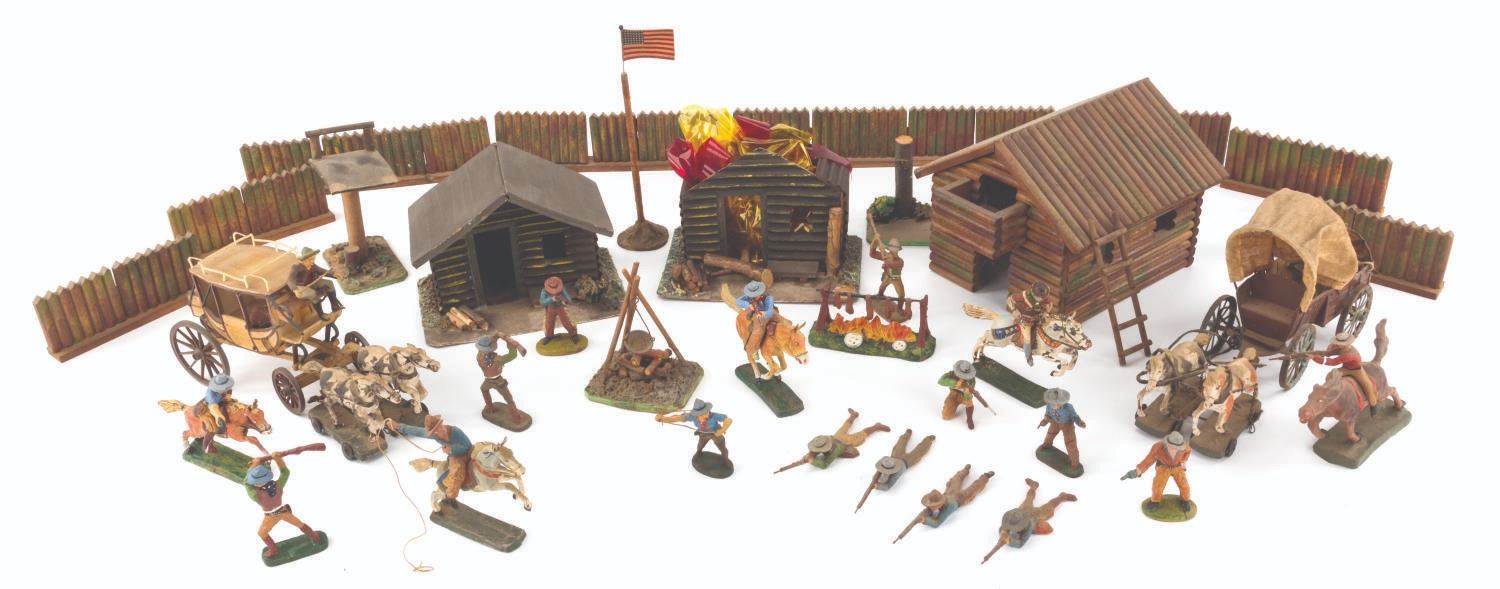 (Various, 1930s-50s) A collection of 42 vintage Western cowboy composition figures and scenic playsets manufactured by O&M Hausser's Elastolin of Germany, Tipple-Topple of Austria, Plastinol, and others. Many of the figures are by Elastolin, while many of the large "scenics" were by Tipple-Topple of Austria. The lot includes 25 figures of cowboys and animals, a stagecoach and Conestoga Wagon both with horses, and 17 scenic playset pieces, including cabins and log houses, a ladder, firepits, stockade walls, a flagpole, and more. The figures measure 2" to 4.25" tall, while the playsets and "scenics" range from 7.5" x 9" x 6" to 4" x 2" x 1.5". The collection is in good overall condition with scuffs, cracks, tears, and wear to composition elements and paint, and a broken stagecoach hitch.