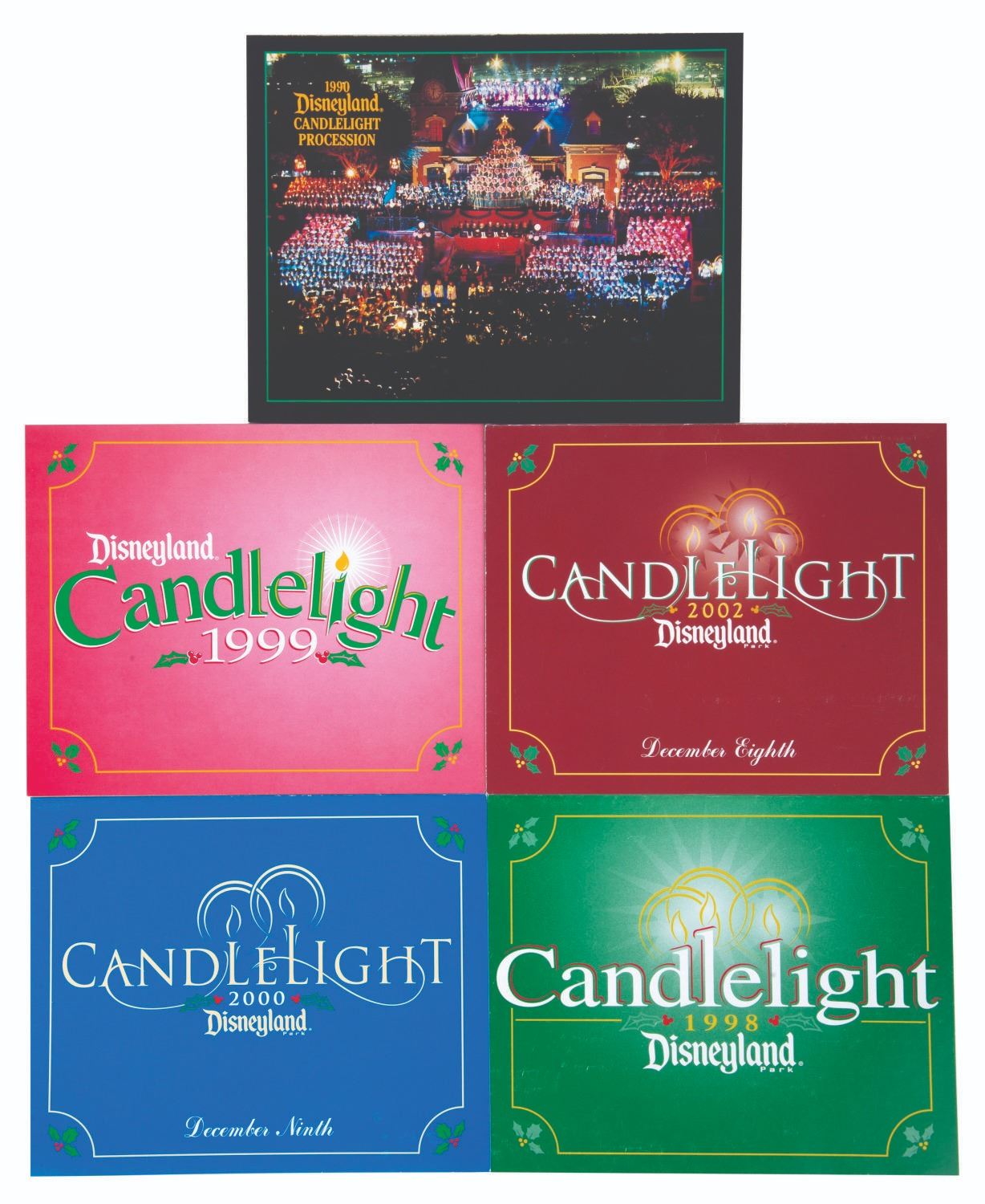 (Disneyland, 1990-2002) A collection of (5) different Disneyland Candlelight Procession program cards. Each card commemorates the Candlelight Event, with graphics, photo imagery, and listing the organizations involved in the winter season holiday festivity. Measuring 7”x5.5” and 6.5”x5.25”, the cards are very good condition with minor wear to edges, corners, and original folds.