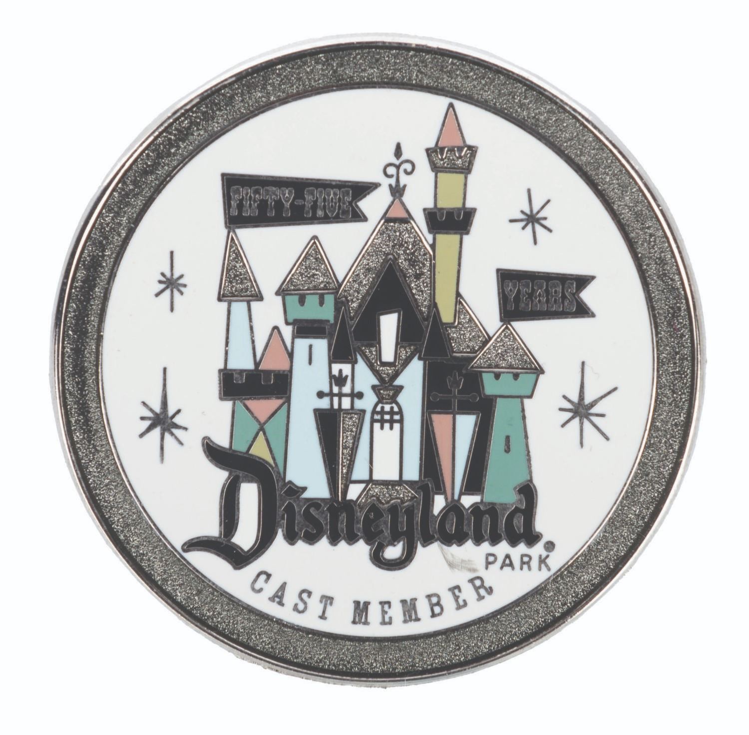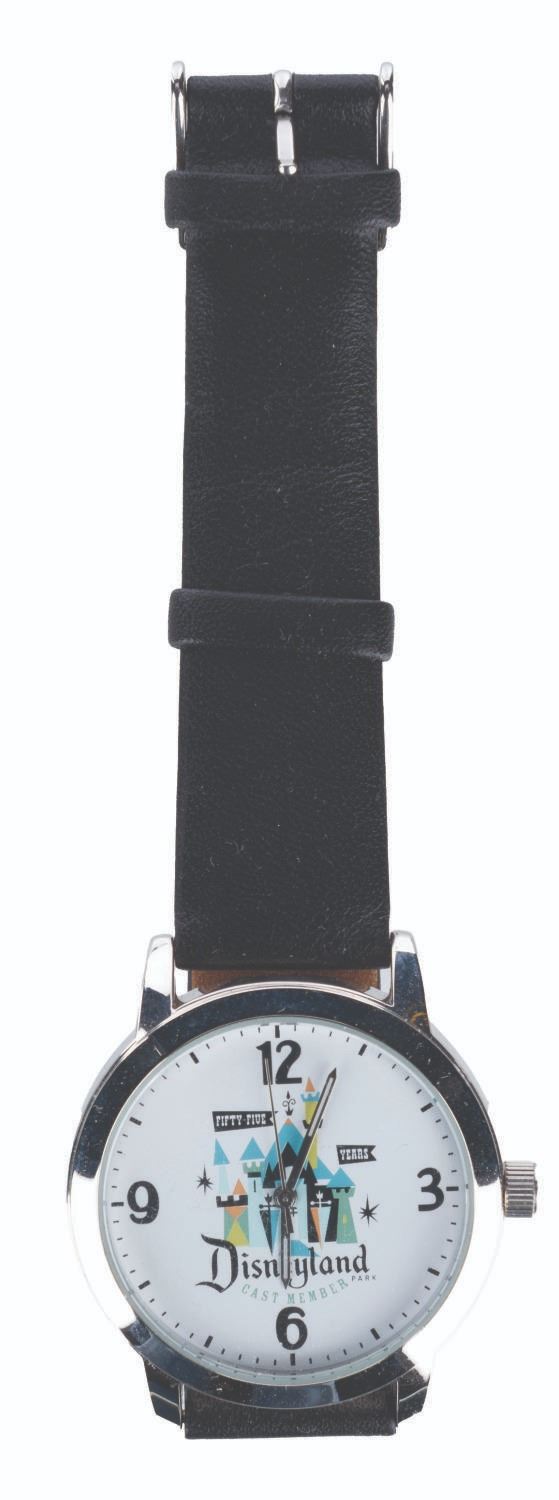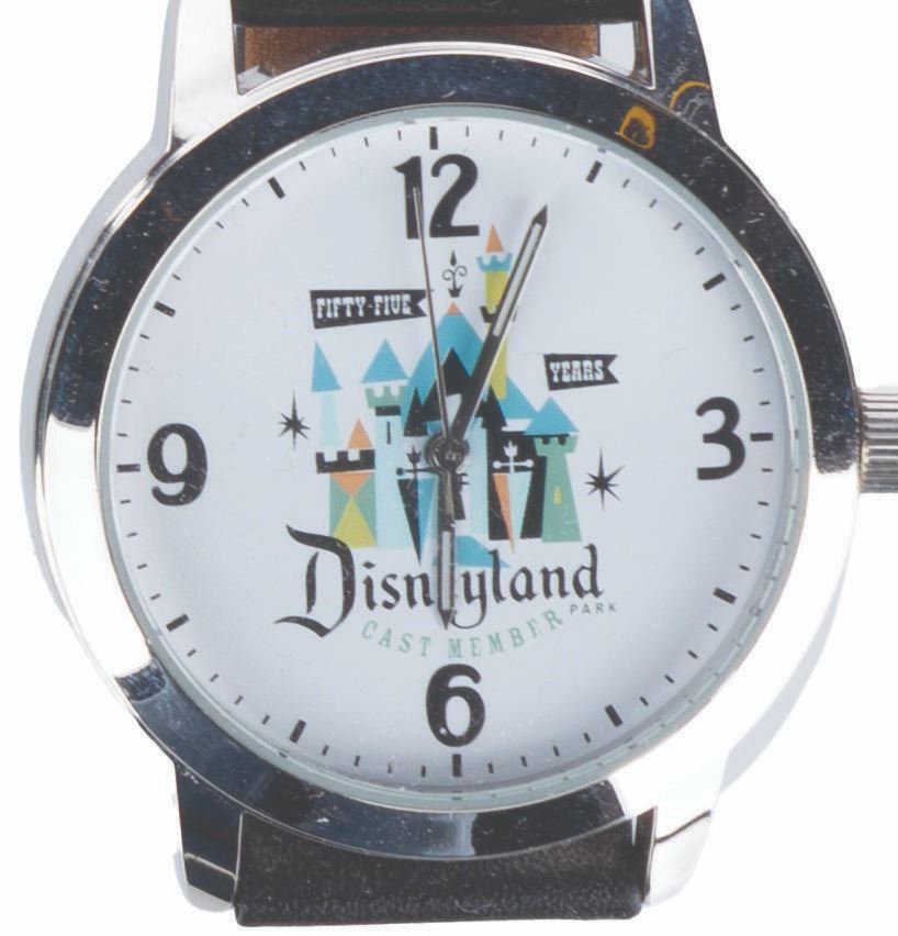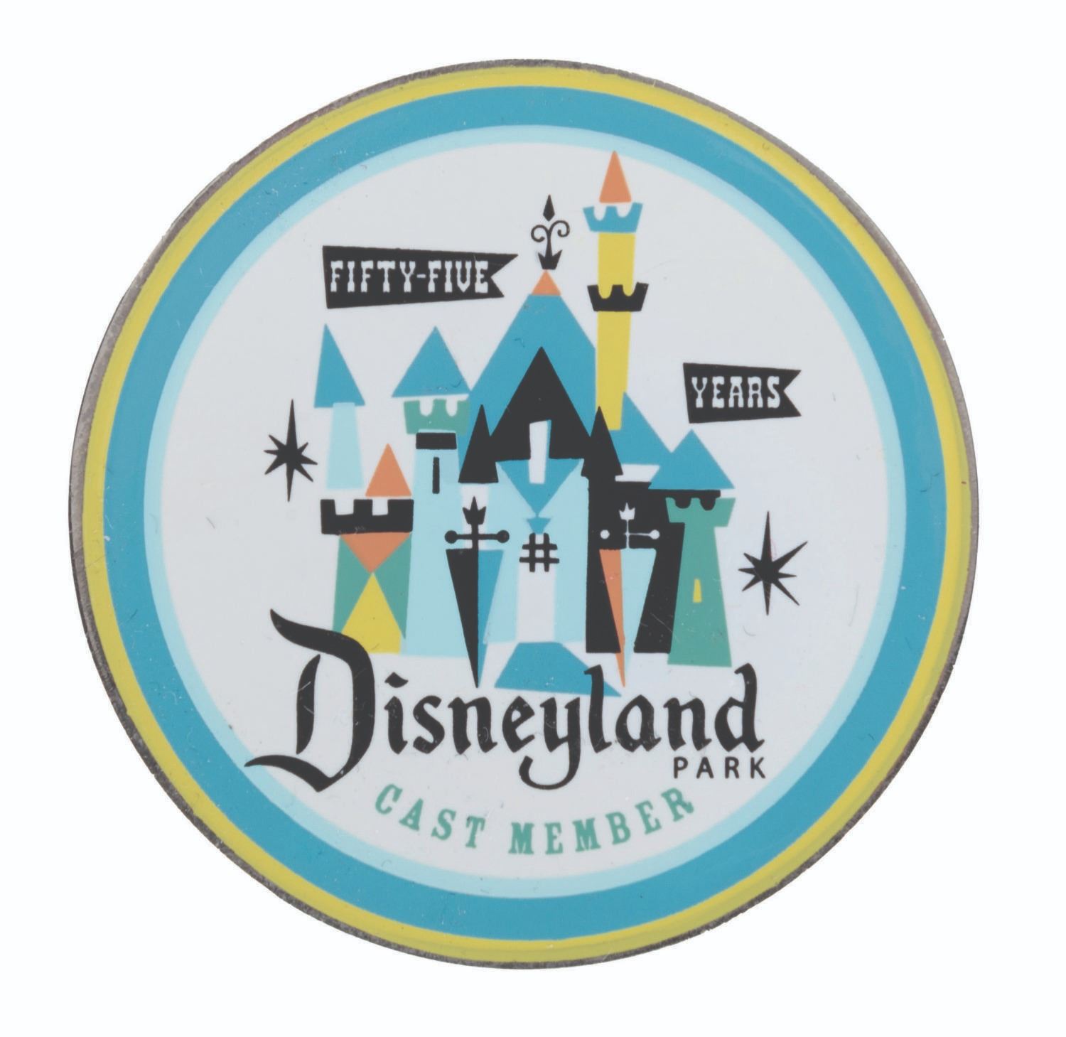(Disneyland, 2010) A collection of Cast Member-exclusive souvenirs from the Park’s 55th Anniversary. Included in the lot are a watch, magnet, keychain, pin, pen, and a rocks glass. Ranging in size from the 1.75” in diameter magnet to the 4.5” tall and 3.5” in diameter glass, the items are in very good condition with light scratches, tape residue, and wear.