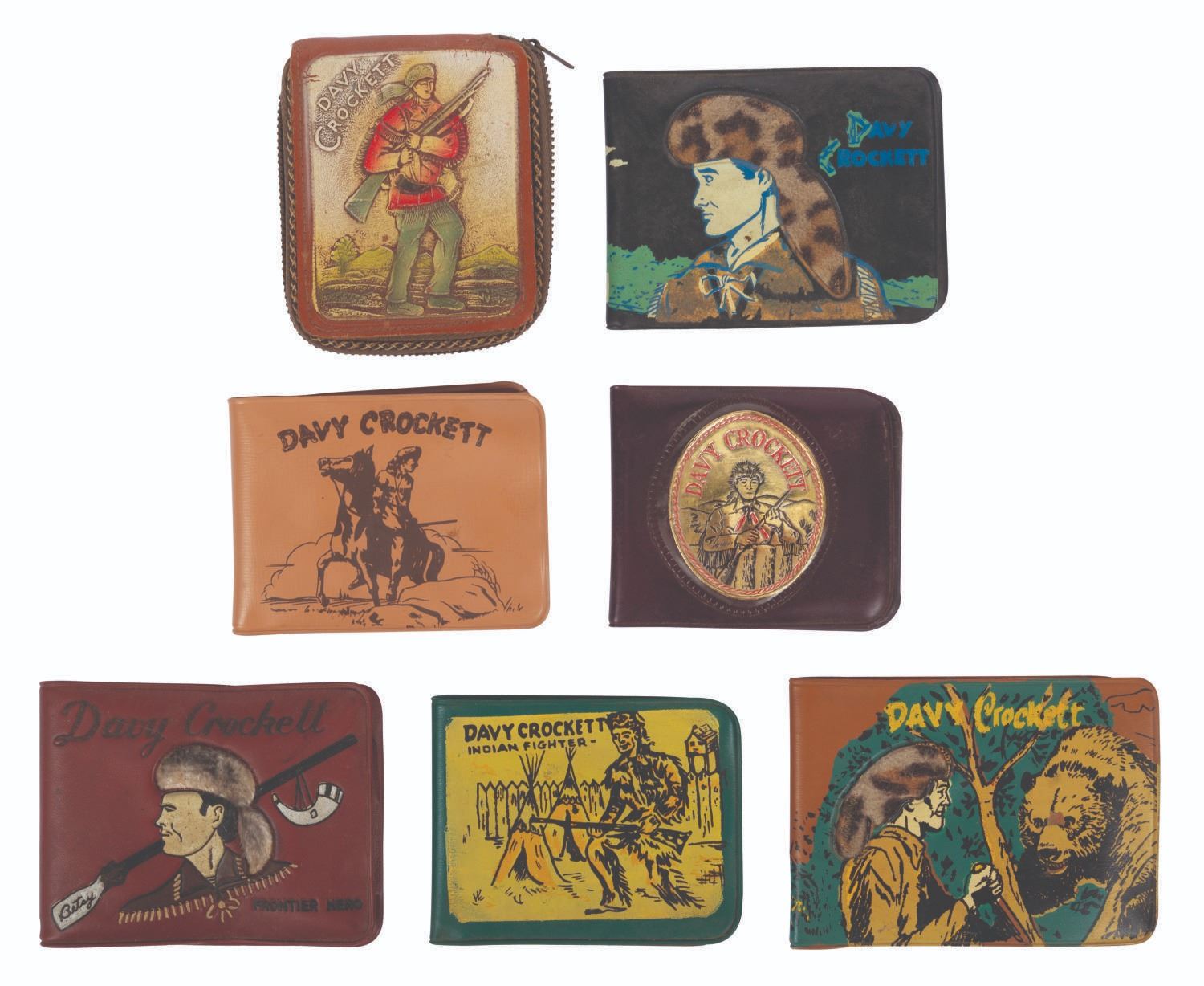 (Various, 1950s) A collection of 7 Davy Crockett wallets. These 6 vinyl and 1 leather wallets are all decorated with images of Crockett and slogans, and 3 have faux fur elements for coonskin caps. All measuring between 3.5" x 3" and 3.5" x 4.5", the vinyl wallets are in very good to fine unused condition, with some degradation to vinyl from age and storage. The leather wallet is in good used condition, with degraded plastic photo sleeves inside.