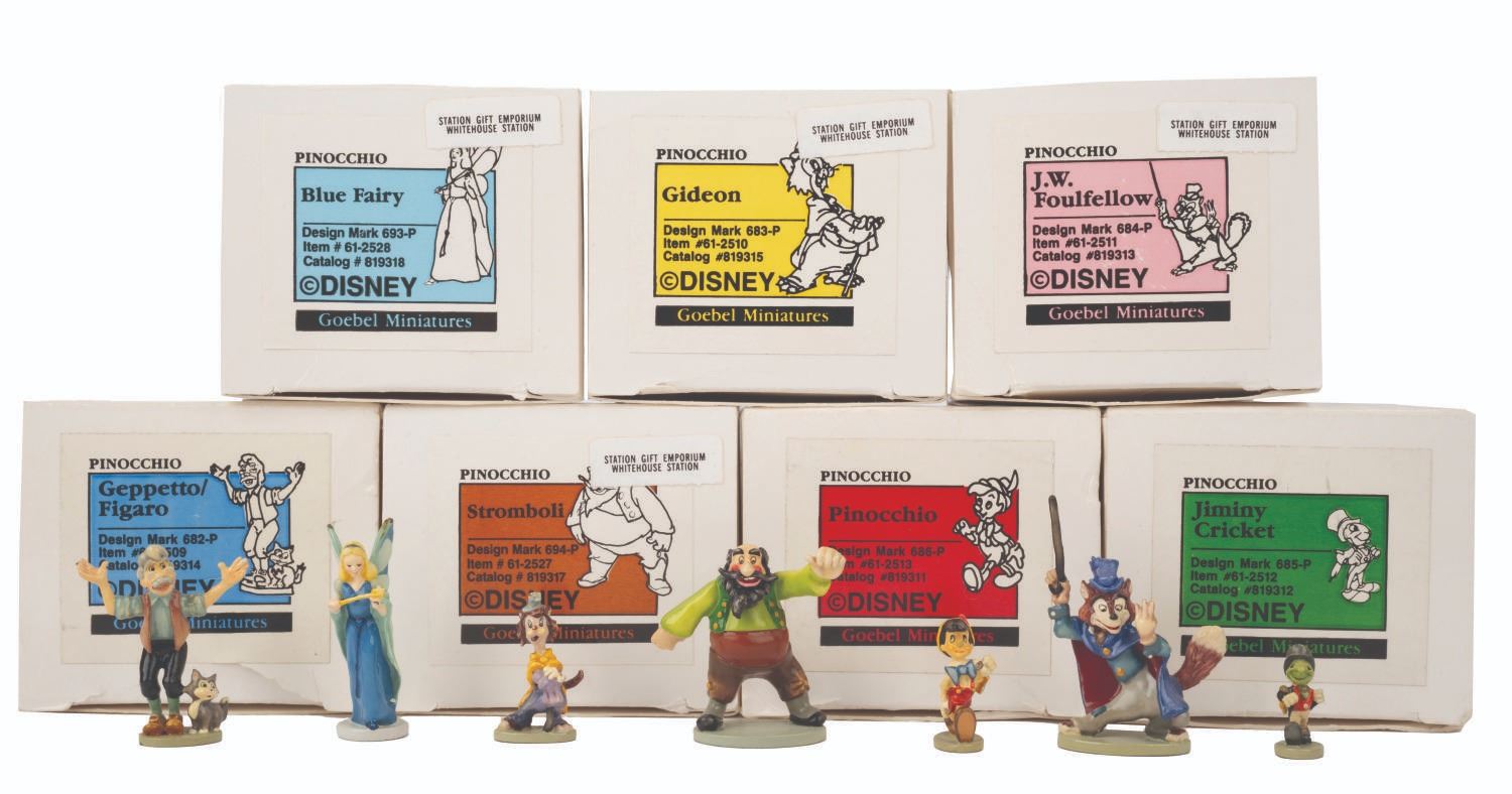 (Goebel, 1990) A Disney’s Pinocchio Miniatures Collection by Goebel. This collection of (7) miniature figures was designed by artist Robert Olszewski and distributed through Goebel, and includes Pinocchio, Gepetto/Figaro, Jiminy Cricket, Blue Fairy, J.W. Foulfellow, Gideon, and Stromboli. Measuring .5” to 1.5”, each vintage hand-crafted figure is in good to fine condition and exhibits few small scuffs to paint and both creases and minor wear to edges and corners. The figures come within their original 2.75”x2.25”x2.25” boxes.