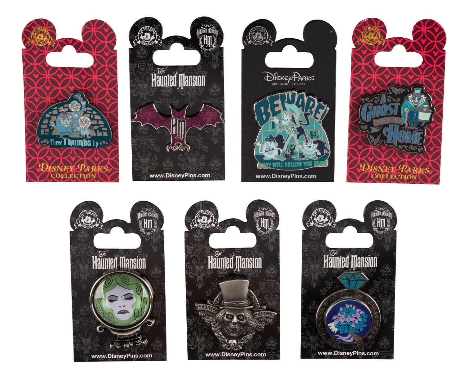 (Disney Parks, 2017-18) A collection of (7) pins inspired by The Haunted Mansion at Disney Parks. Among the lot are "Three Thumbs Up," Haunted Mansion wallpaper bat, "Beware a Toy Will Follow You Home," Bride & Groom Ring, Madame Leota, Hatbox Ghost, and "A Ghost Will Follow You Home." Measuring from 1.75"x1.5" and 1.5"x1.5", the pins are in fine condition.
