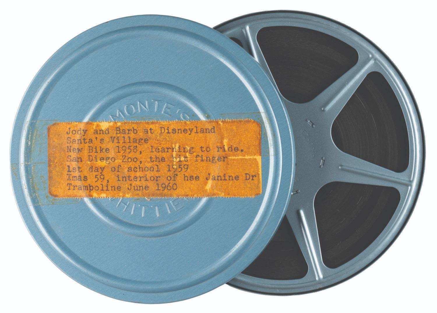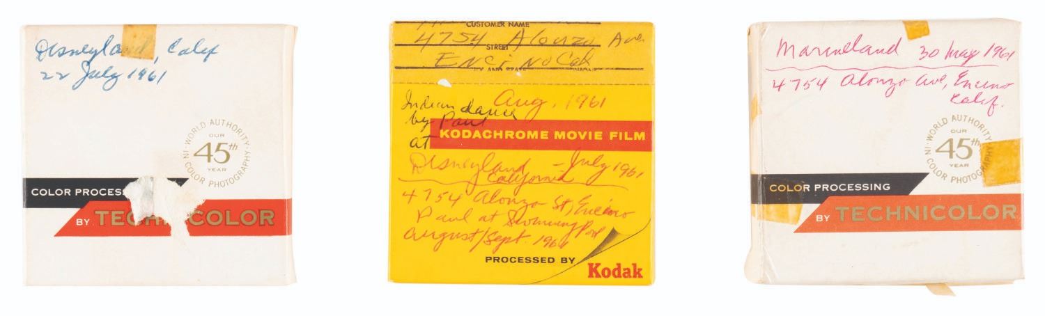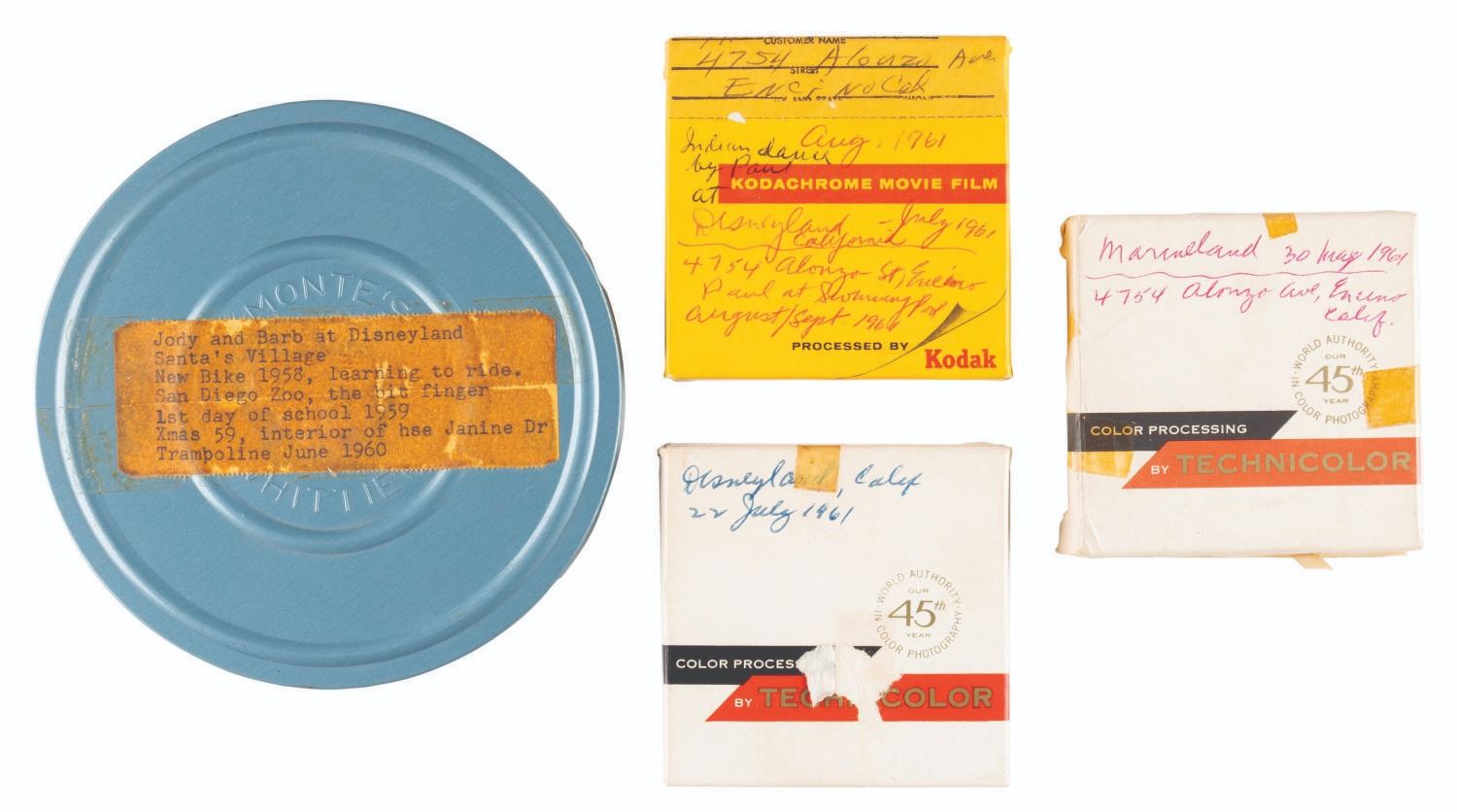 (1958-61) A collection of 8mm home movies filmed at theme parks including three 3" reels and one 5" reel. The 3" reels each run two to three minutes and are labeled including "Indian Dance by Paul at Disneyland July 1961," "Disneyland 22 July 1961," and "Marineland 30 May 1961." The 5" reel runs from 12 to 14 minutes and includes "Disneyland," "Santa's Village," and "San Diego Zoo bit finger" labels. The films are in very good condition, with handling wear to the boxes and labels.