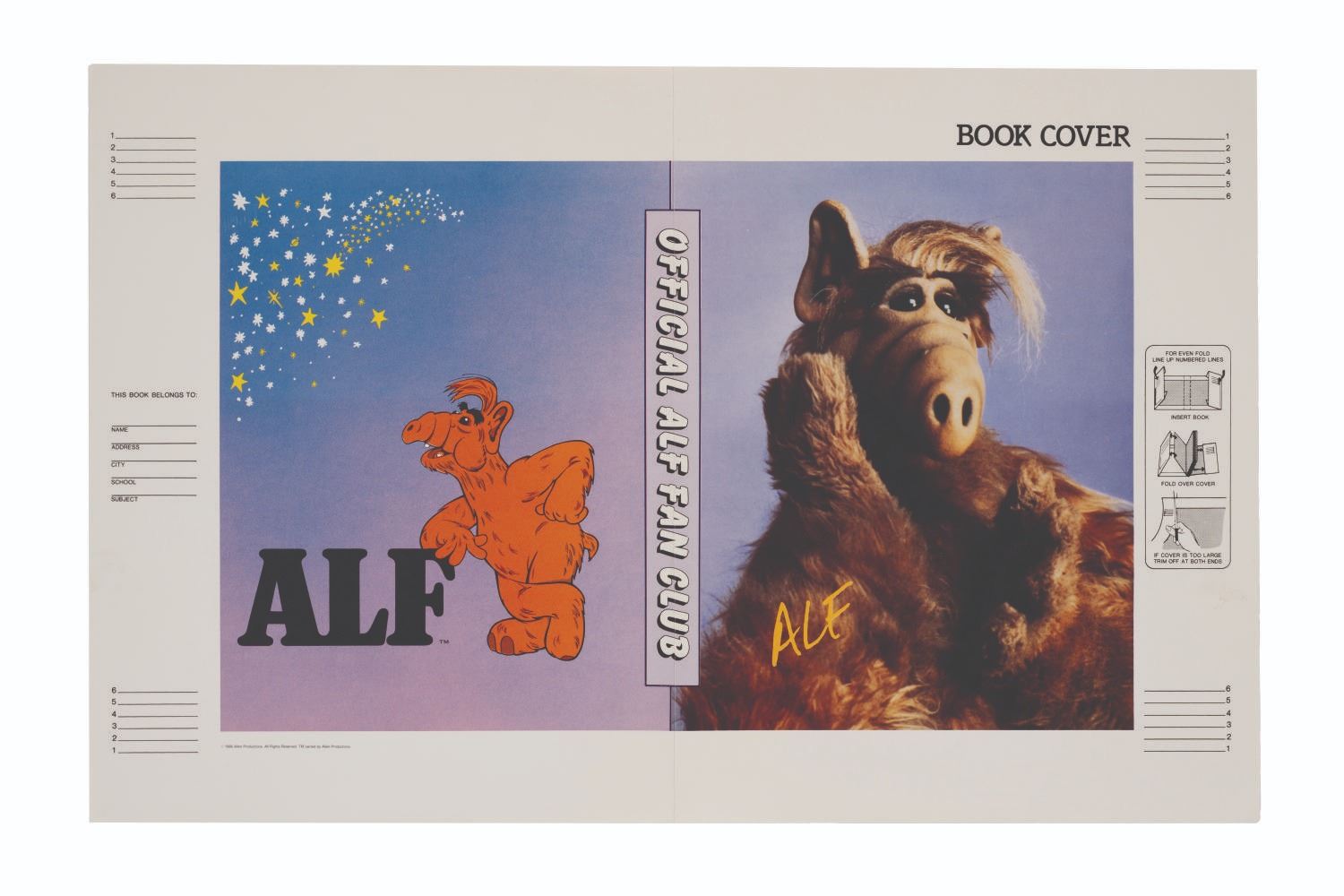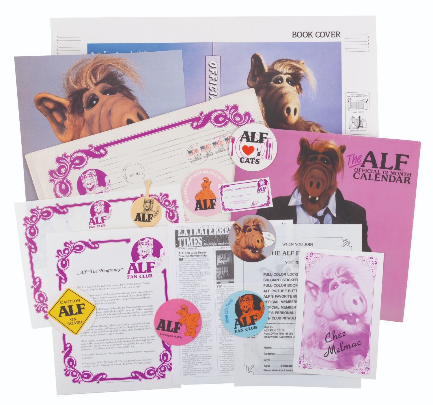 (NBC, 1980s) A collection of memorabilia for fans of the 1980s television show "Alf." Included are stickers, a 1988 calendar, a book cover, a poster, a menu of feline delicacies, an Alf Fan Club membership card, the Extraterrestrial Times newspaper, and an Alf biography. Packed in the original envelope measuring 12” x 15.5”, the collection is in very good condition with light handling wear, except for the good condition calendar displaying scuffs, bends, and creases. The envelope displays handling wear, markings, and tearing.