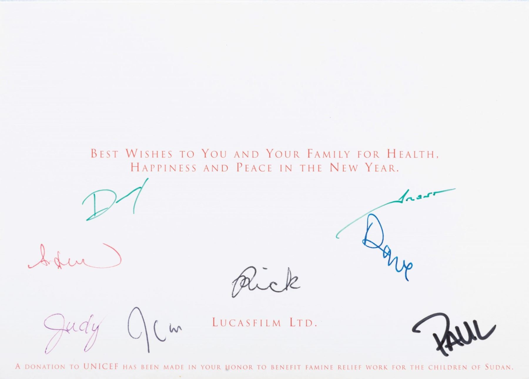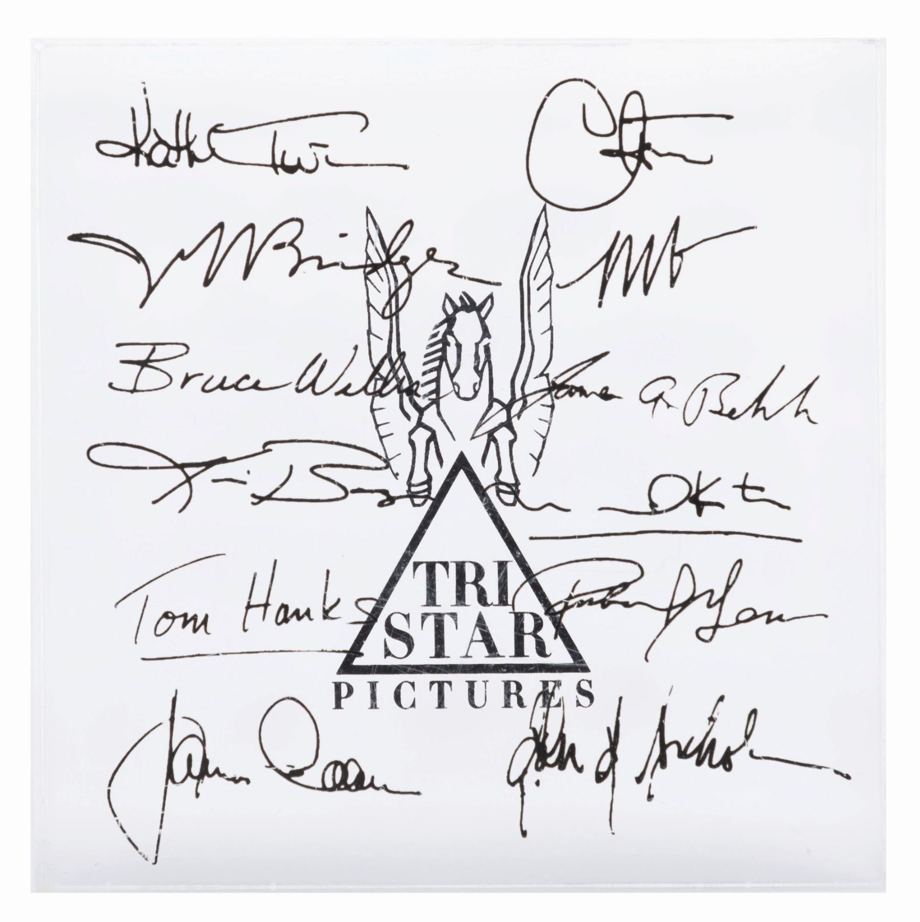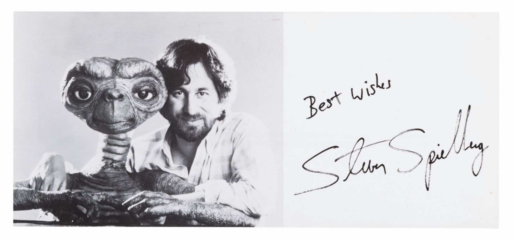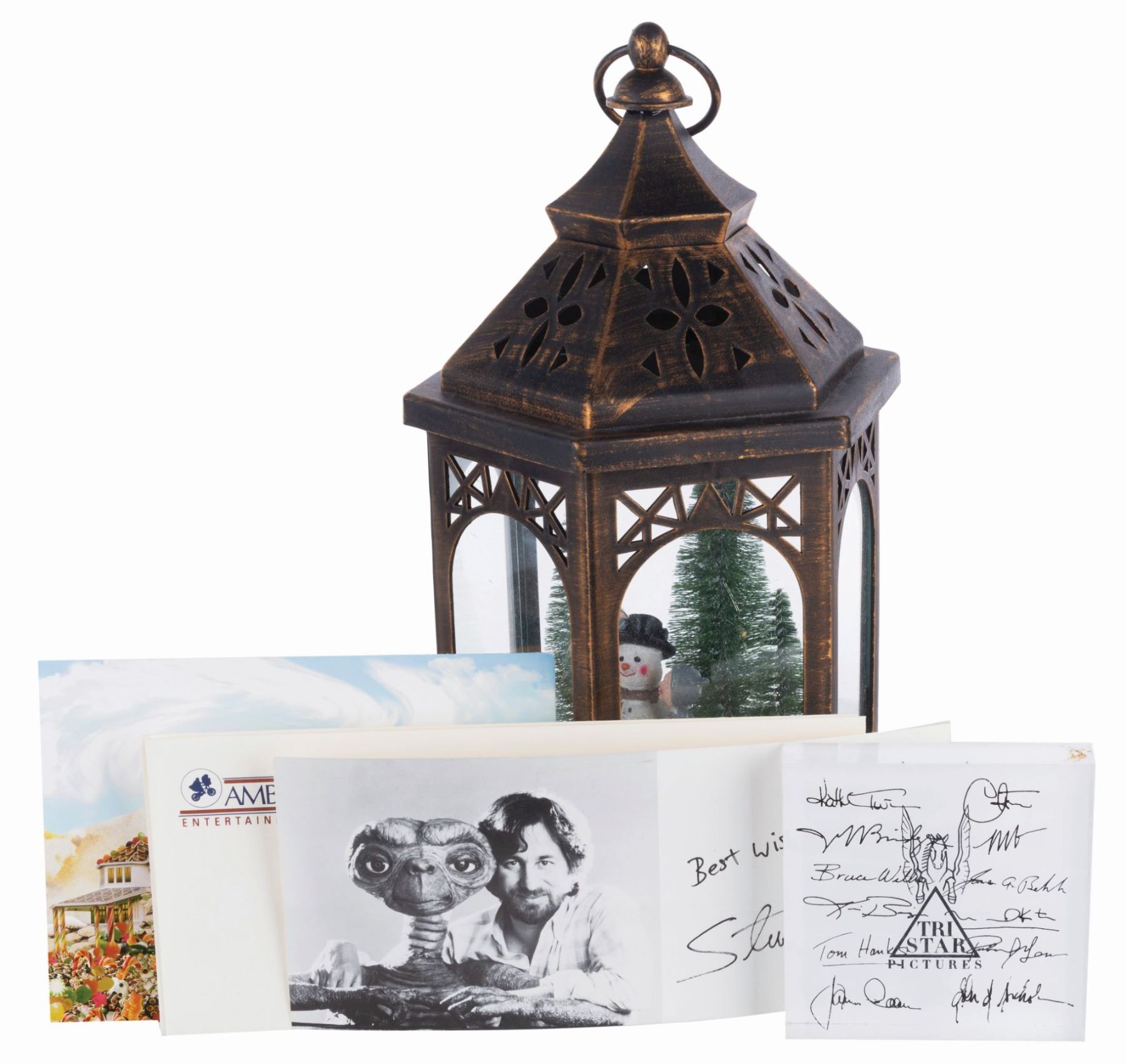 (Amblin, 1982-2006) A collection of Amblin Entertainment ephemera including a piece originally owned by Steven Spielberg. The set includes two unused Amblin logo envelopes, a pre-signed card of Spielberg with E.T., a 1998 Lucasfilm holiday card signed by eight employees, an Amblin employee holiday gift lantern with a snow scene that lights up with three "AAA” batteries (not included), and a TriStar Pictures Thank you plaque personally owned by Spielberg with printed signatures of actors he had worked with. Measuring from the 4” x 4” x 7.5” plaque up to the 6” x 7” x 14.75” lantern, the pieces are overall in very good condition with light handling wear, and the 4” x 9” Amblin envelopes in fine condition.