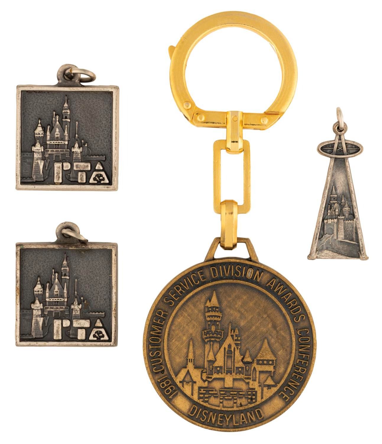 (1971-1981) A collection of Disneyland and City of Anaheim-related charms and a keyring. Included are a triangular 1971 American Business Women's Association Anaheim charm featuring Sleeping Beauty Castle, two 1977 PTA National Convention at Disneyland charms, and one 1981 Disneyland Customer Service Division Awards Conference keychain. Measuring from 0.5" x 1" to 2.5" long, most of the items are in very good condition with light oxidation, with one PTA charm in good condition showing more oxidation.