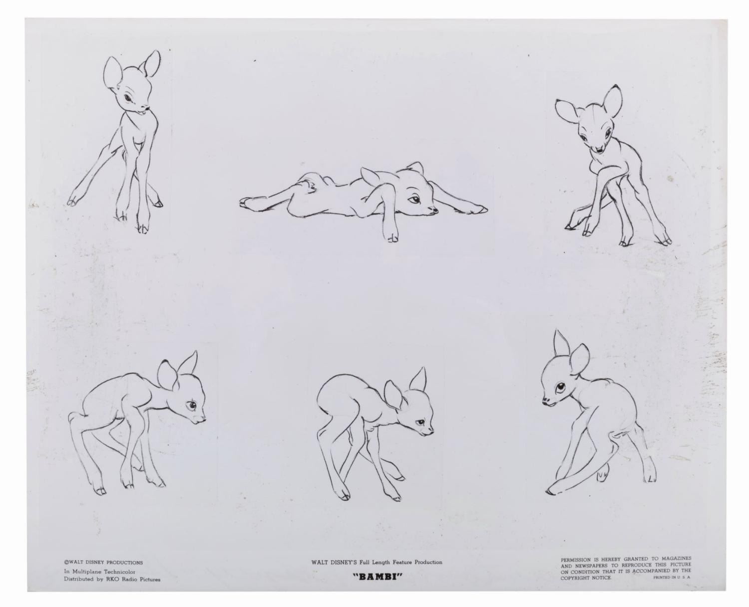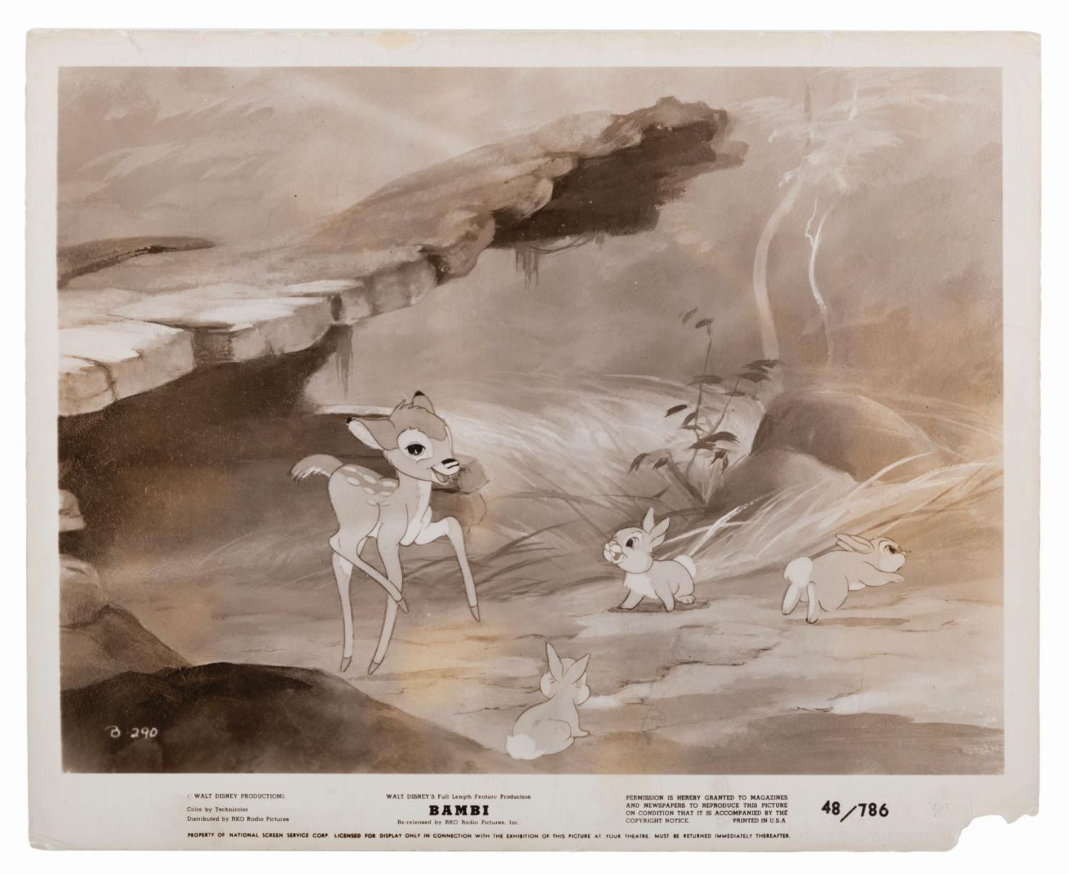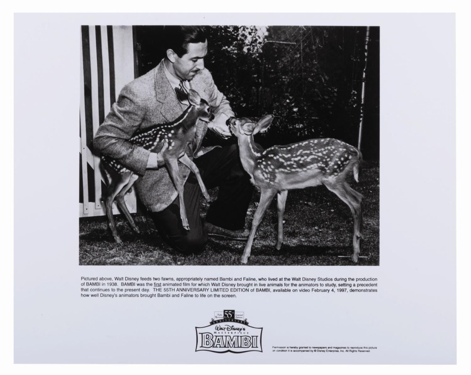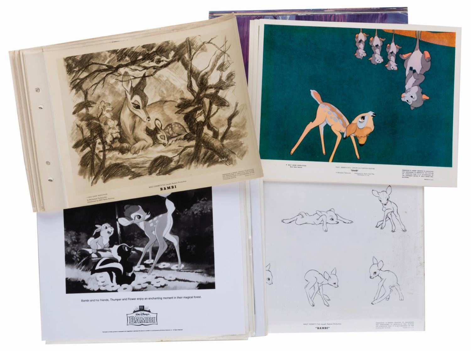 (Disney, 1942-97) A collection of 44 "Bambi" publicity photos and lobby cards dating from the original 1942 release through to the 55th Anniversary. Included are 15 photos mounted to page backings, 12 photos that were sent to a newspaper, several with the newspaper clipping attached; seven color lobby cards, three color photo prints, two photos from the 55th Anniversary, and five from the original release. Measuring 8" x 10", the photos are in very good condition with soiling, discoloration, tears, and creasing. The newspaper images are in fair condition from heavy production use, smudging, extensive notes on the reverse, and adhesive residue.