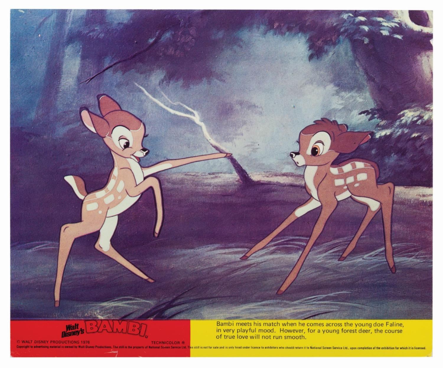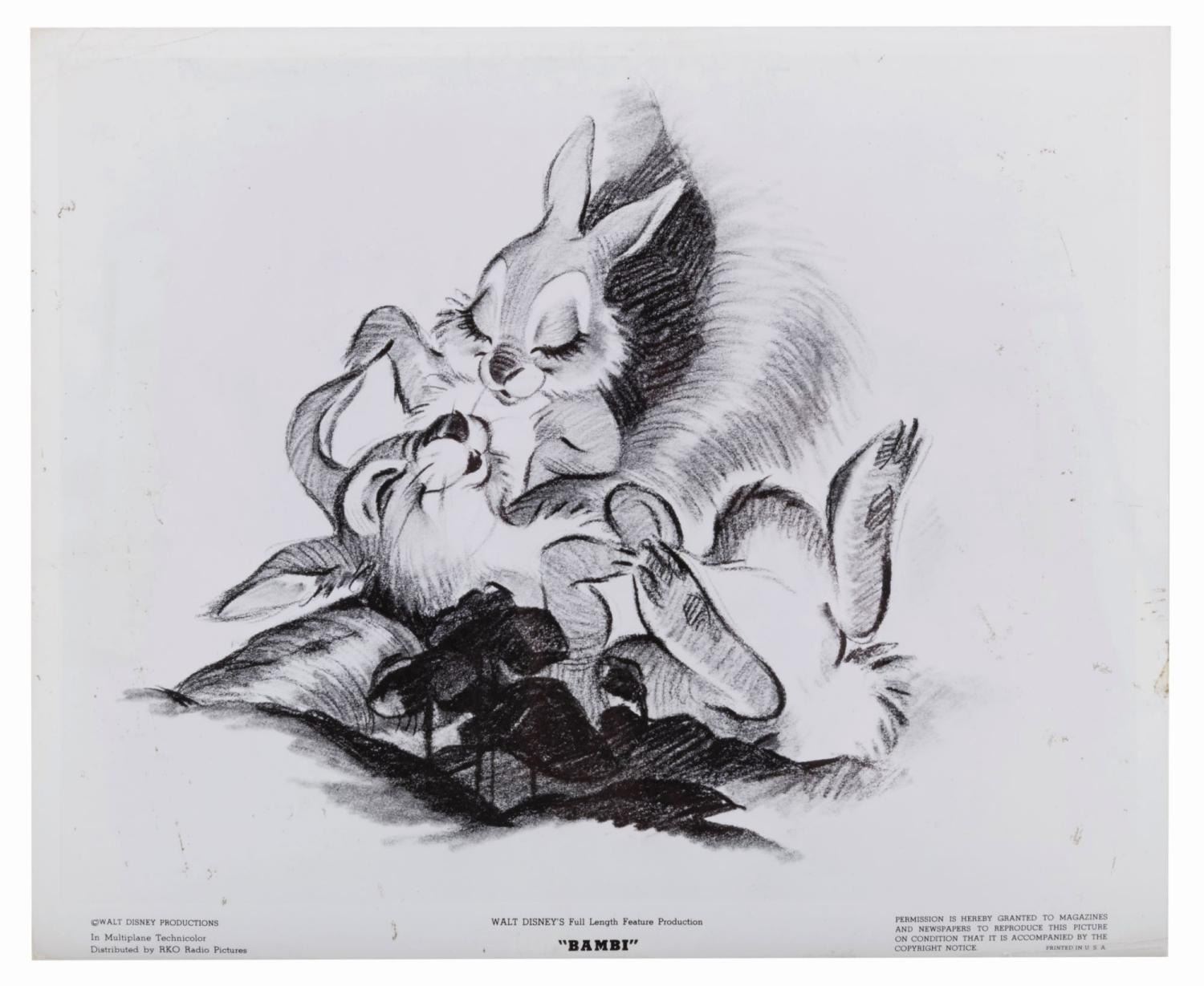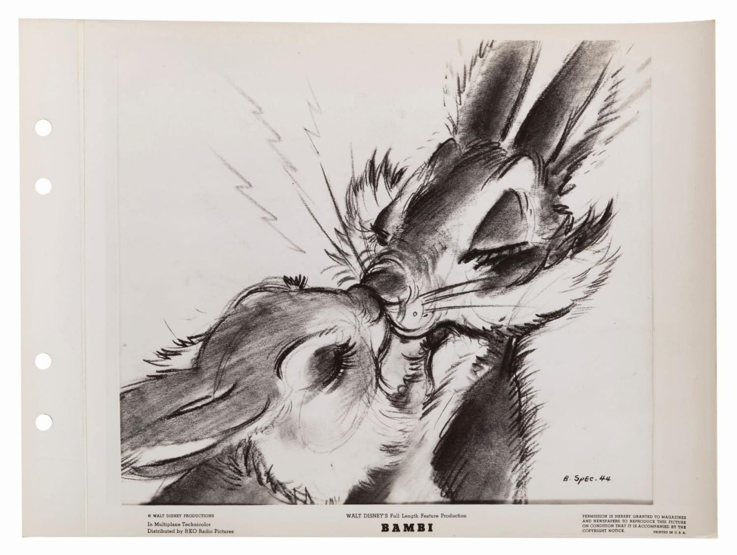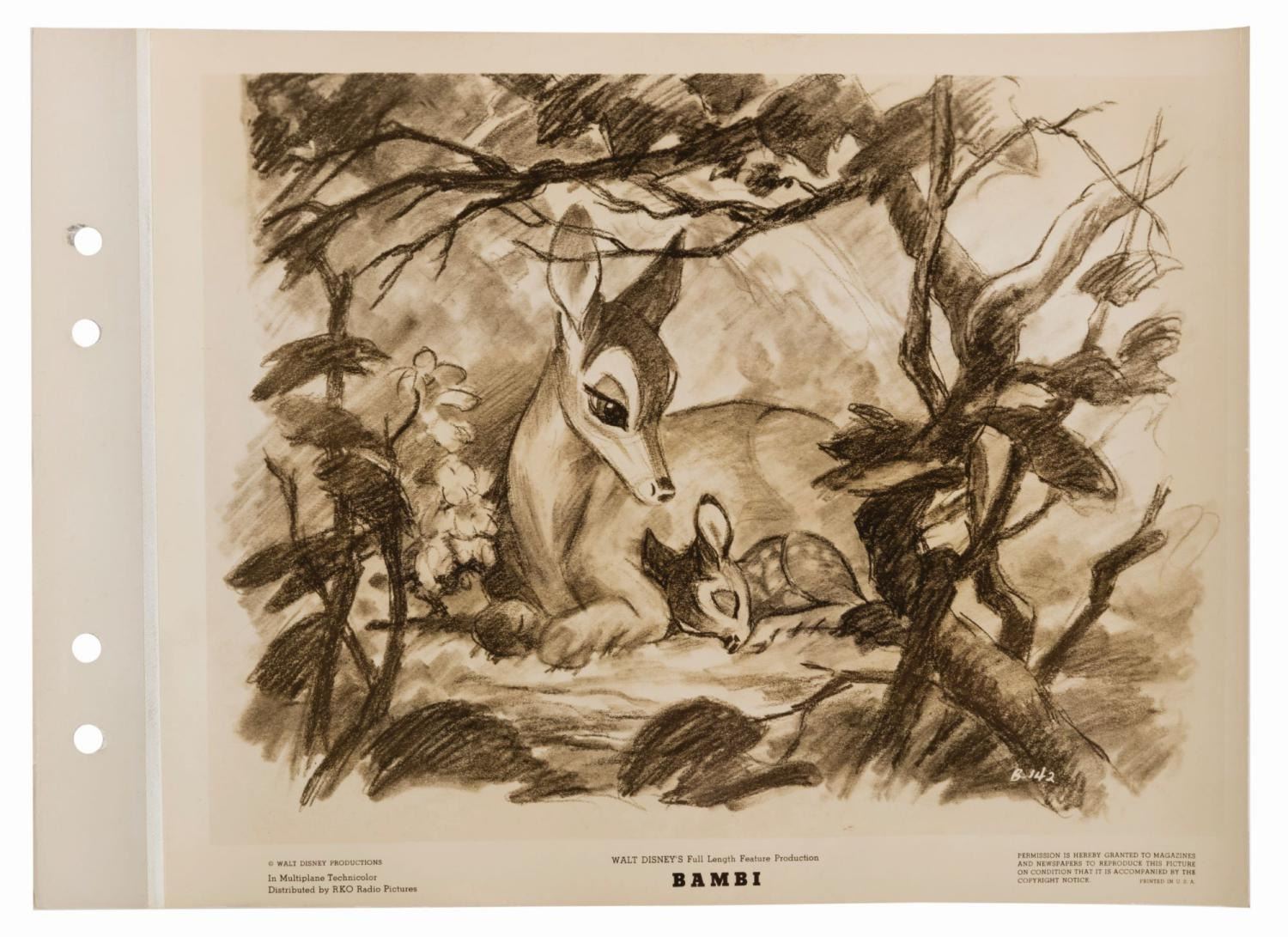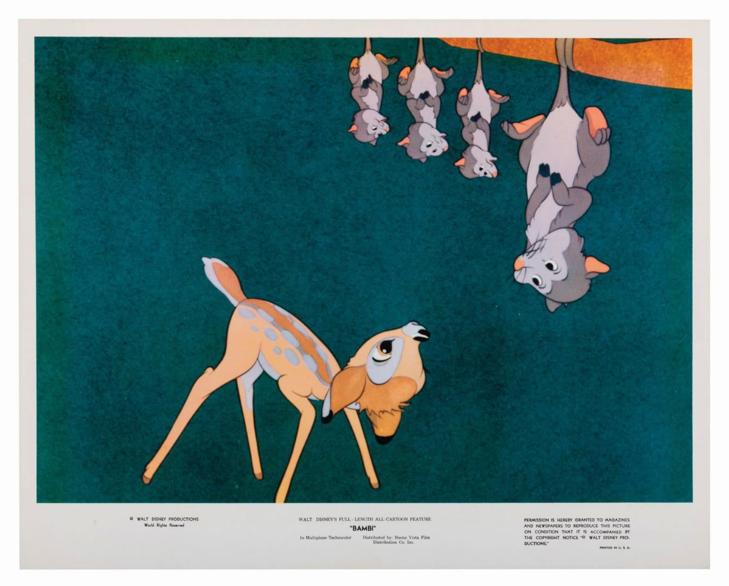 (Disney, 1942-97) A collection of 44 "Bambi" publicity photos and lobby cards dating from the original 1942 release through to the 55th Anniversary. Included are 15 photos mounted to page backings, 12 photos that were sent to a newspaper, several with the newspaper clipping attached; seven color lobby cards, three color photo prints, two photos from the 55th Anniversary, and five from the original release. Measuring 8" x 10", the photos are in very good condition with soiling, discoloration, tears, and creasing. The newspaper images are in fair condition from heavy production use, smudging, extensive notes on the reverse, and adhesive residue.