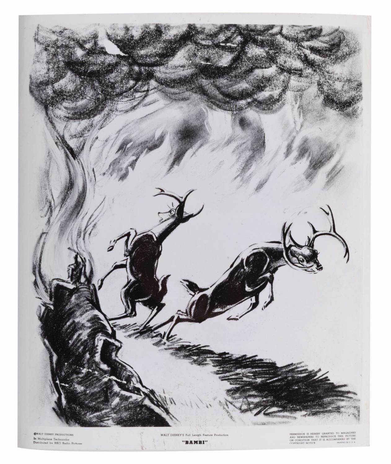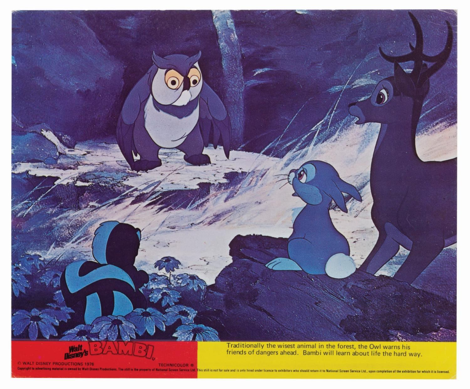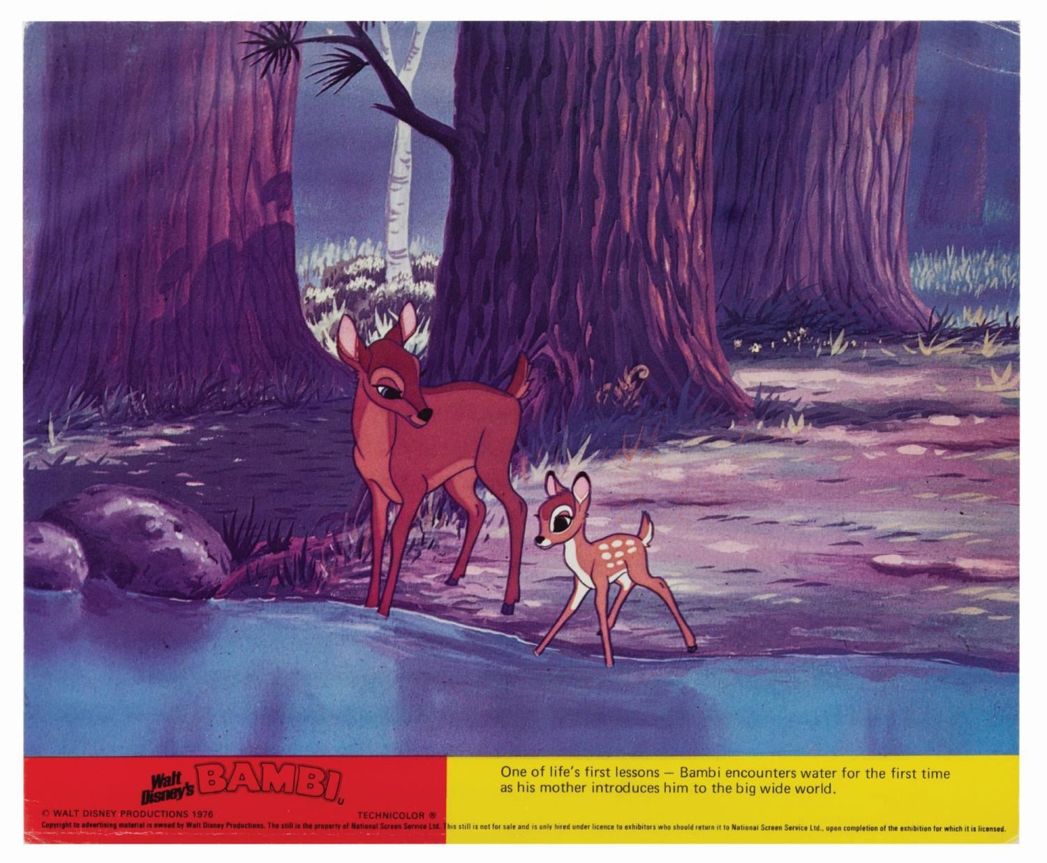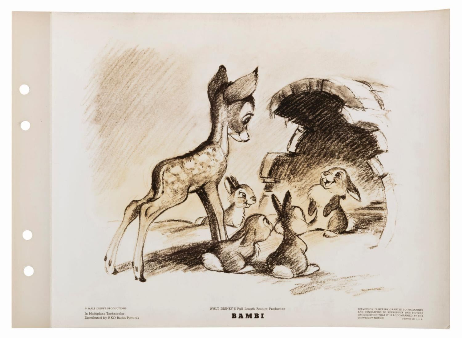 (Disney, 1942-97) A collection of 44 "Bambi" publicity photos and lobby cards dating from the original 1942 release through to the 55th Anniversary. Included are 15 photos mounted to page backings, 12 photos that were sent to a newspaper, several with the newspaper clipping attached; seven color lobby cards, three color photo prints, two photos from the 55th Anniversary, and five from the original release. Measuring 8" x 10", the photos are in very good condition with soiling, discoloration, tears, and creasing. The newspaper images are in fair condition from heavy production use, smudging, extensive notes on the reverse, and adhesive residue.