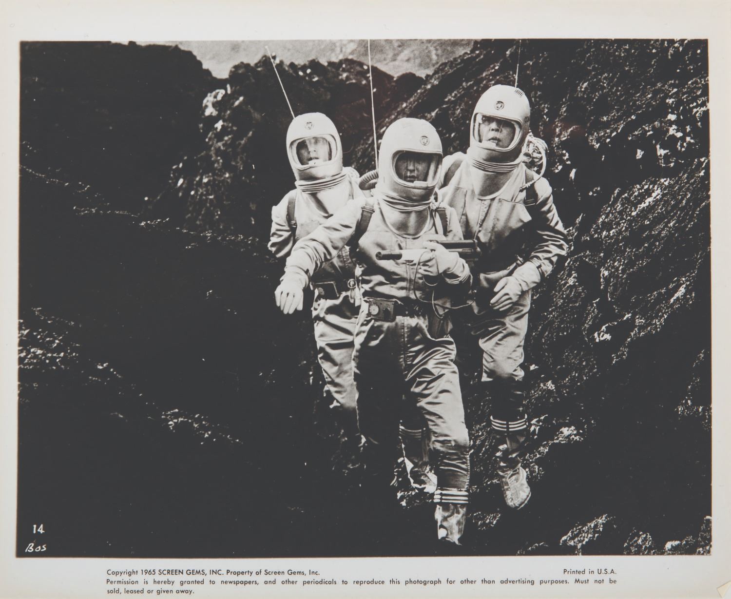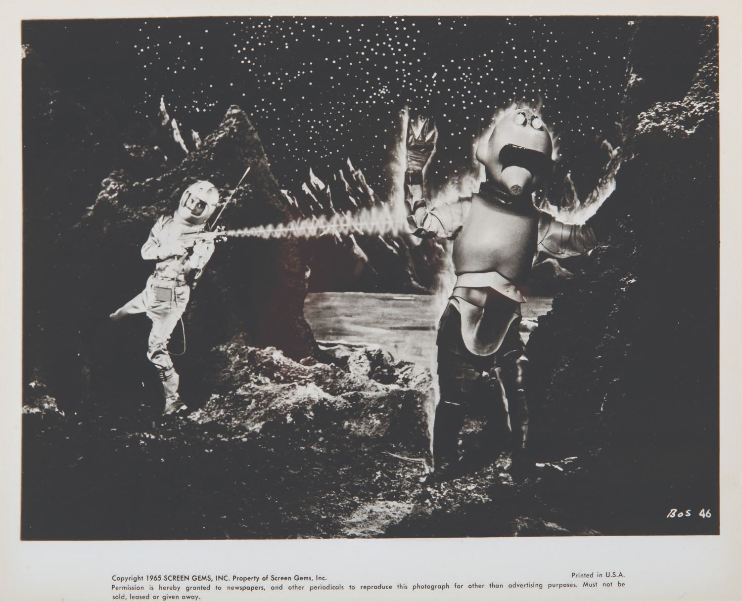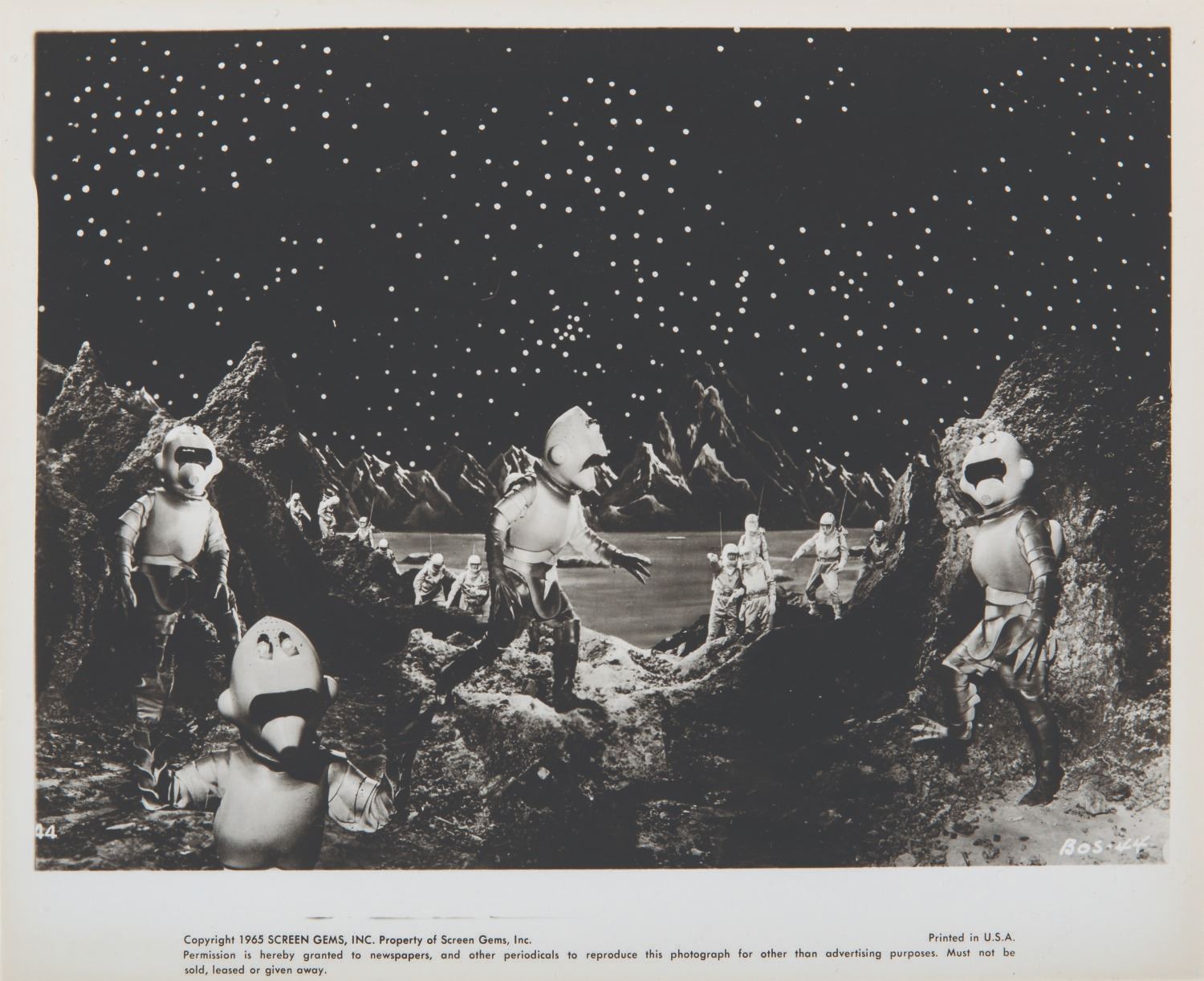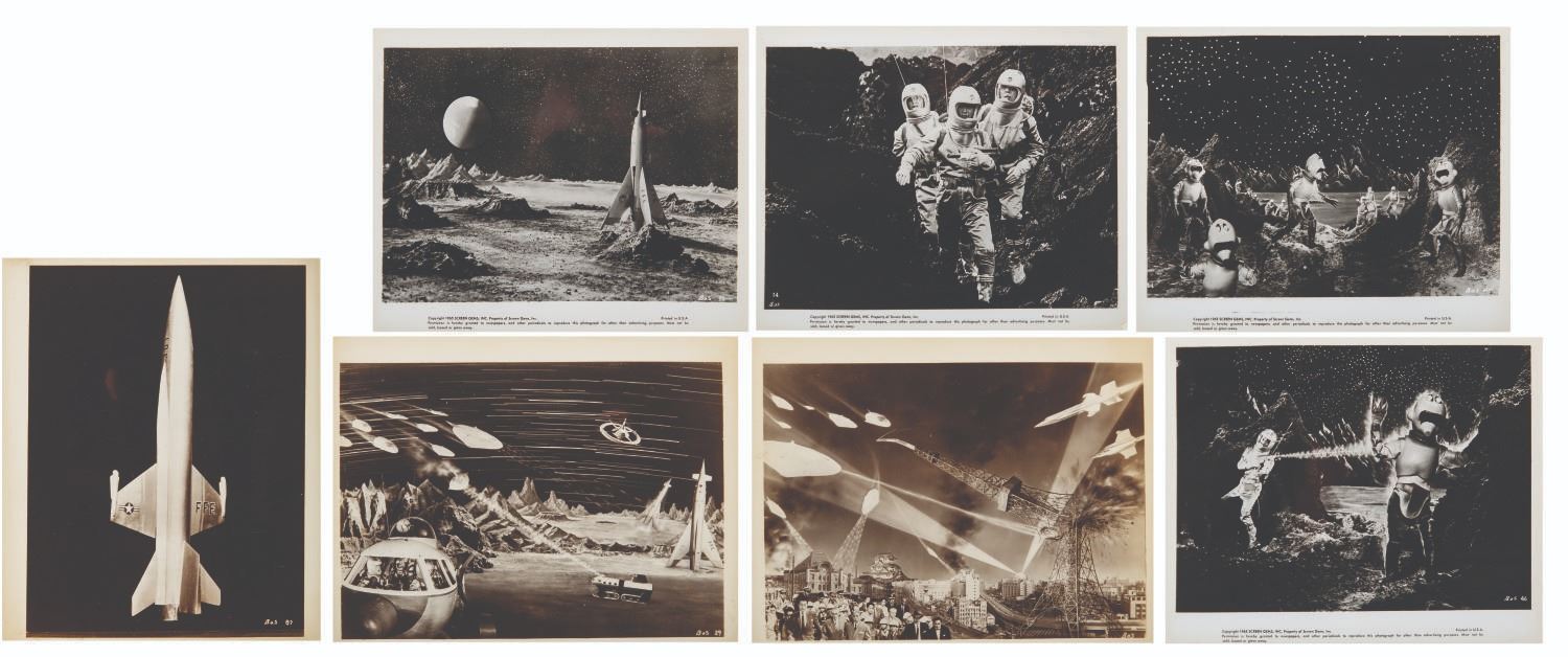 (Toho, 1959-65) A collection of seven promotional photos for the theatrical release of "Battle in Outer Space." Measuring up to 8.25" x 10" each, the photos are in very good condition with light stains and light handling wear, and toning from age to three.