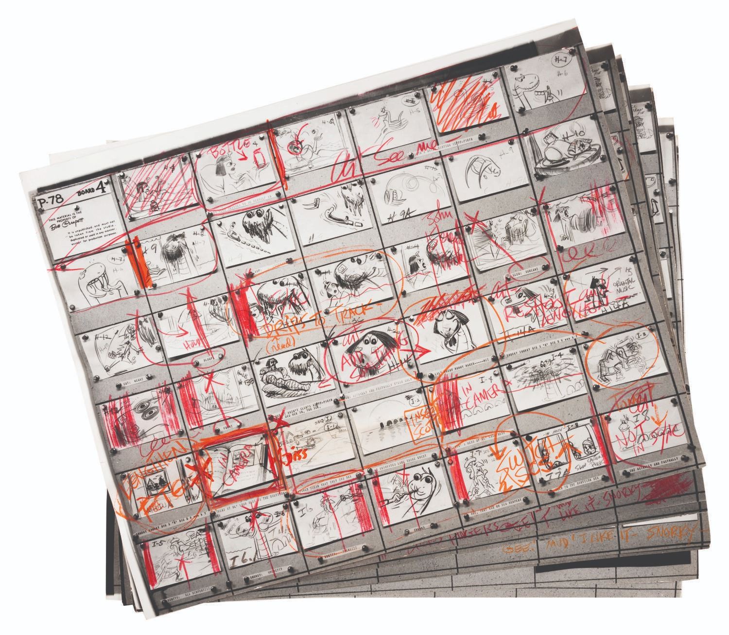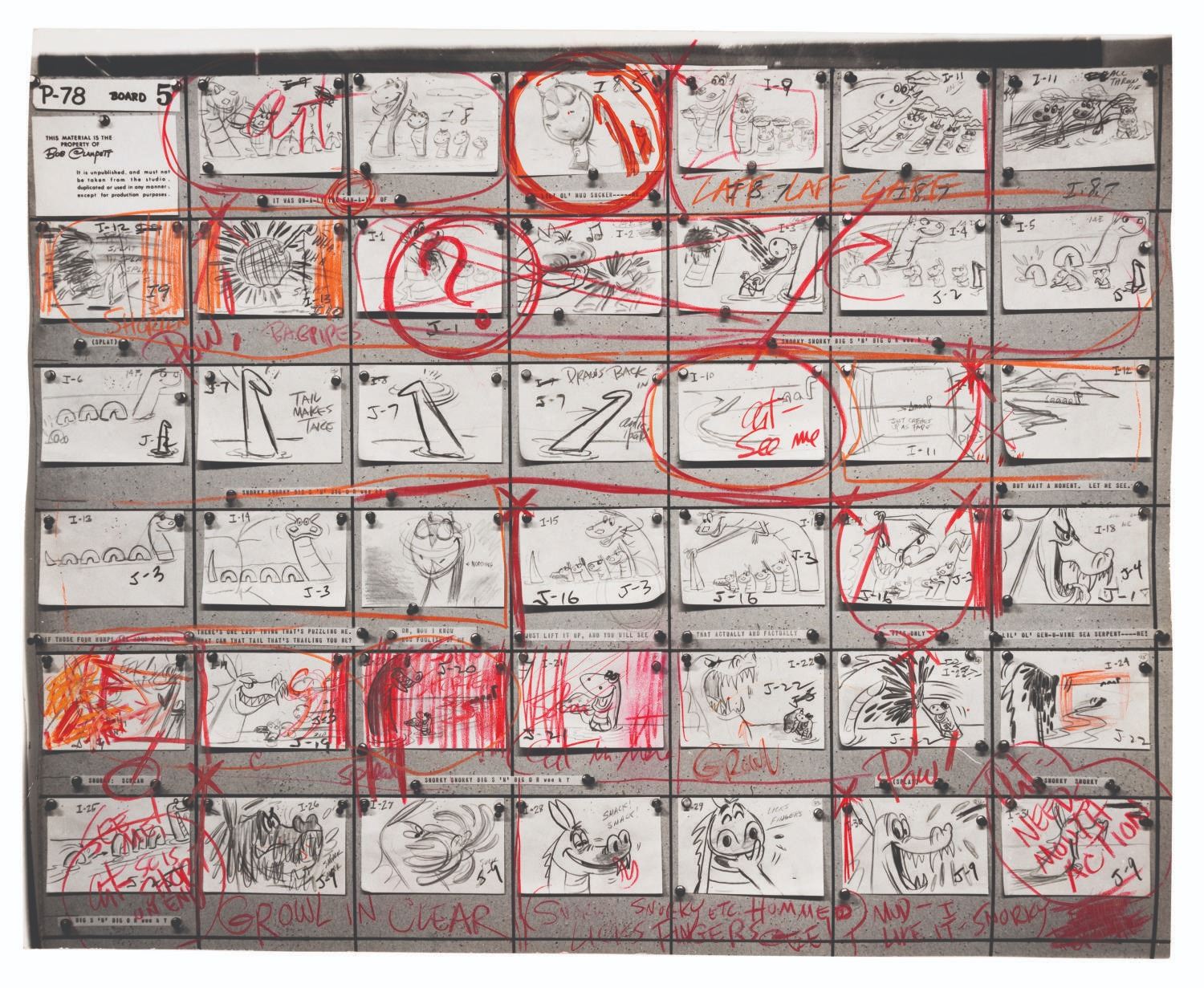 (Clampett, 1962) A collection of seven photo prints of storyboards from the “Beany and Cecil” episode, “There’s No Such Thing as a Sea Serpent.” Included are a print of Board 4, four of Board 5, and two of Board 6, each with hand-written notes by Bob Clampett (who also narrated the episode) in red and orange grease pencil. These prints were used by animators for reference during production. Measuring 16” x 20” each, the prints display in good condition with creasing, edge wear, and light warping from age and production use.