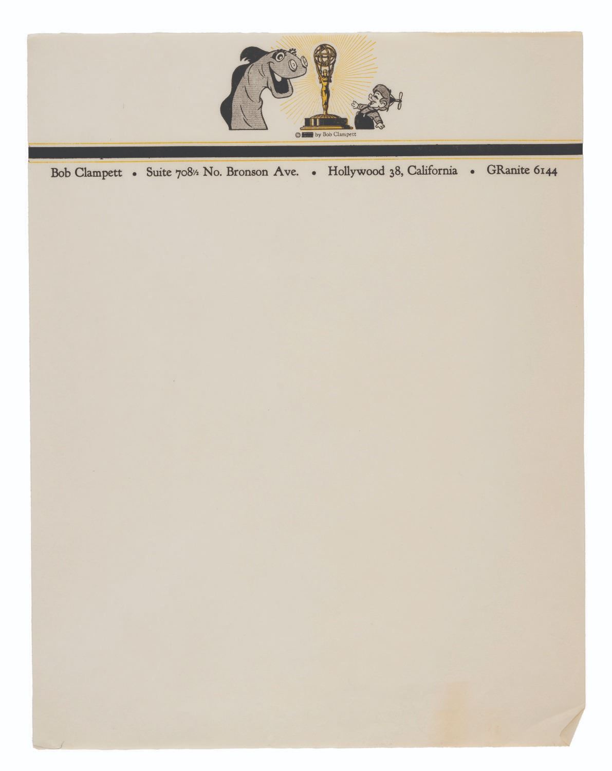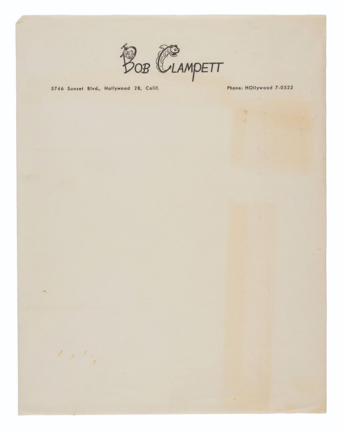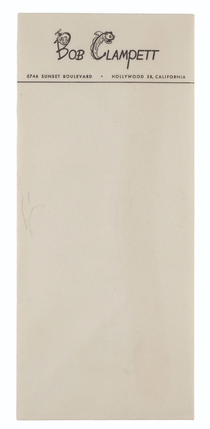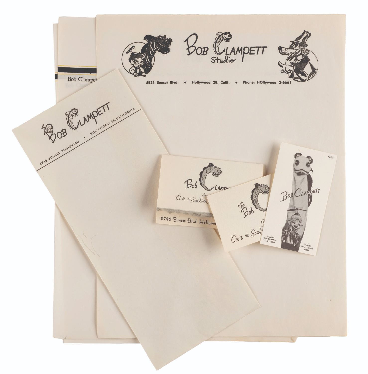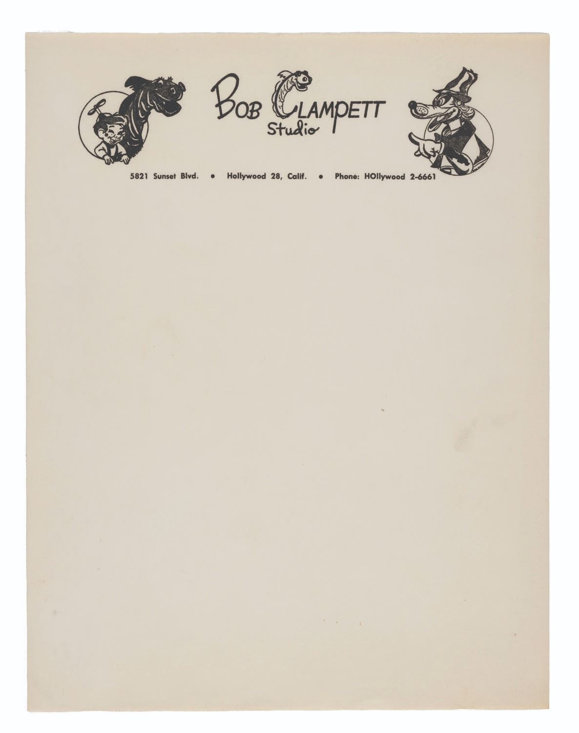 (Clampett, 1940-50s) A collection of stationery and business cards from four of Bob Clampett’s offices after he left Leon Schlesinger Productions. Included are four business cards, two of which fold open to reveal Clampett’s original characters, four pages of stationery, and one envelope. Ranging in size from 2” x 3.5” to the 8.5” x 11” stationery, the items are in good to fine condition with creasing, stains, and discoloration from age and light graphite marks.