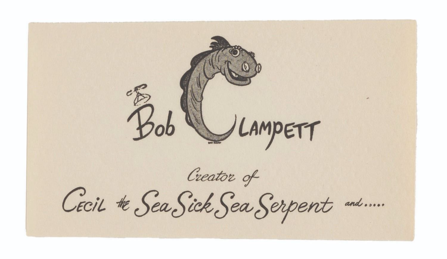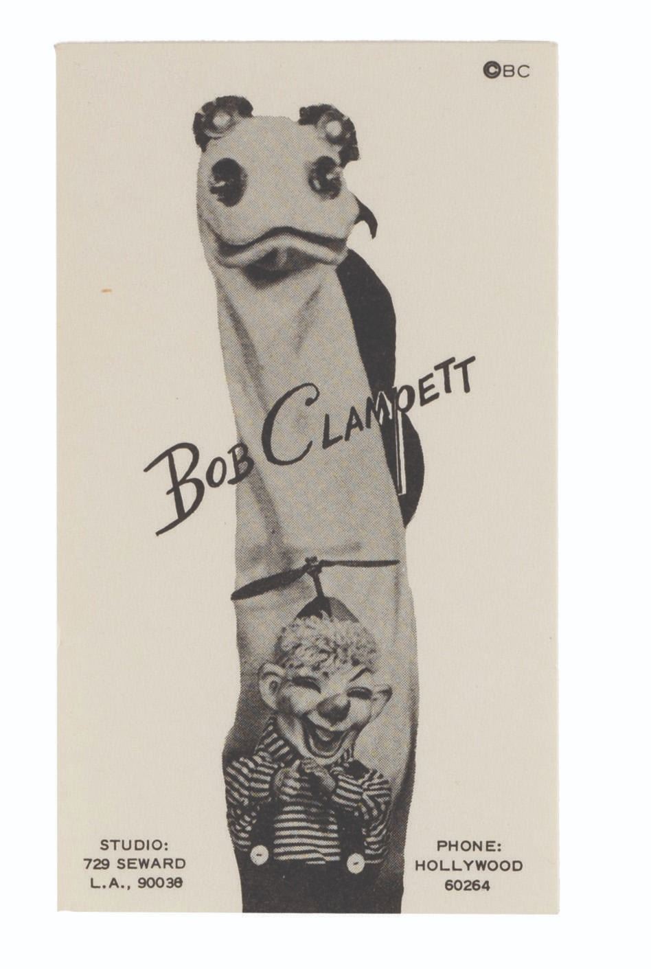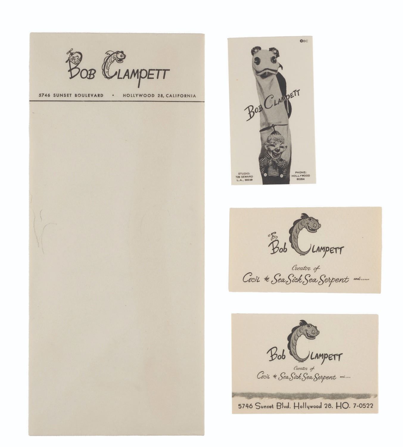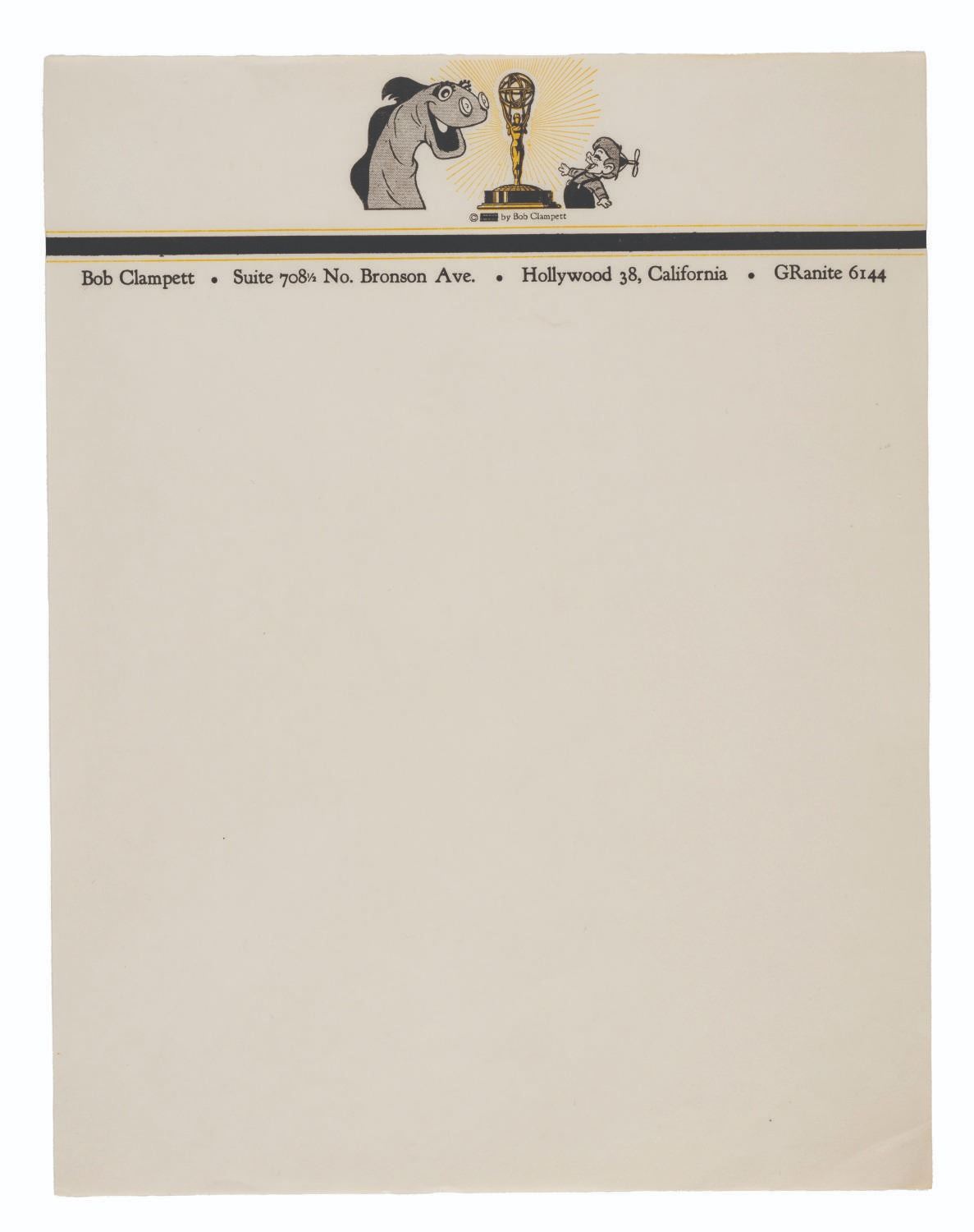 (Clampett, 1940-50s) A collection of stationery and business cards from four of Bob Clampett’s offices after he left Leon Schlesinger Productions. Included are four business cards, two of which fold open to reveal Clampett’s original characters, four pages of stationery, and one envelope. Ranging in size from 2” x 3.5” to the 8.5” x 11” stationery, the items are in good to fine condition with creasing, stains, and discoloration from age and light graphite marks.