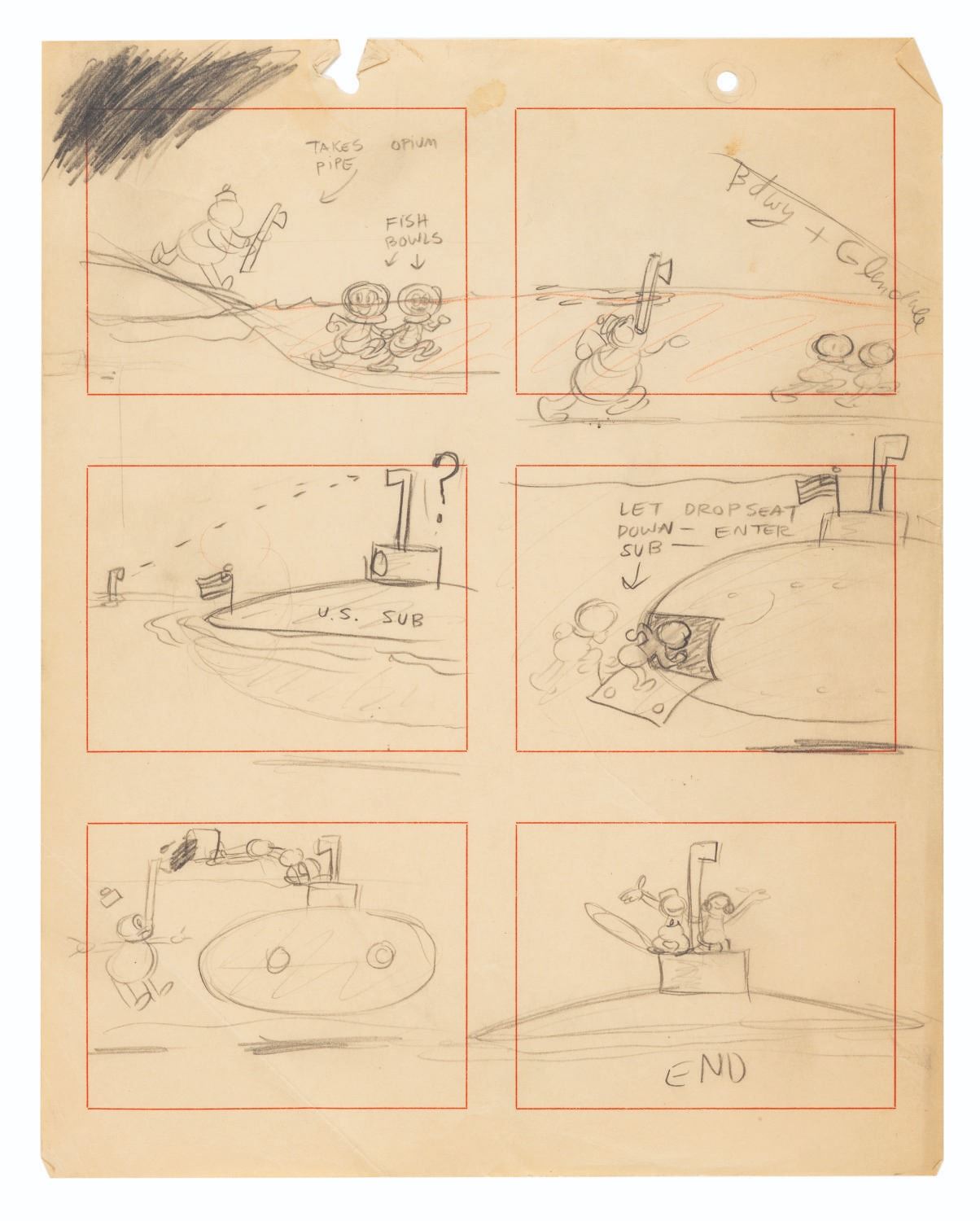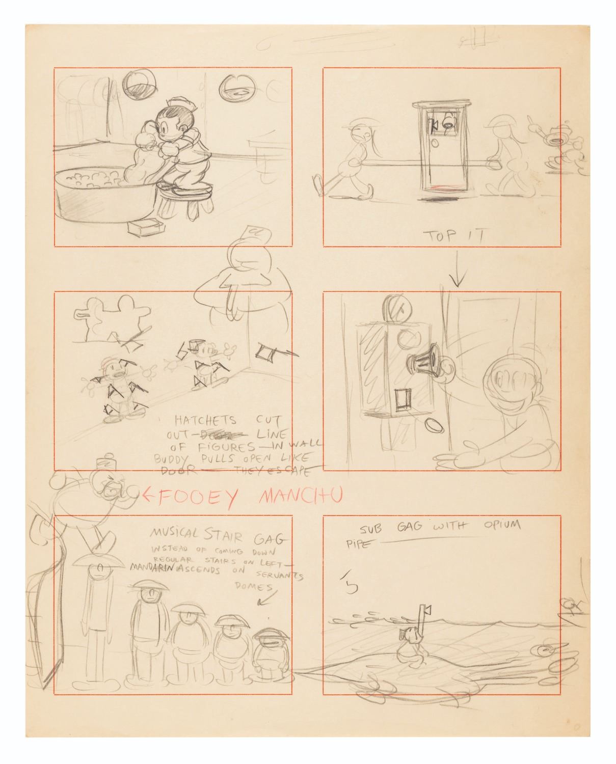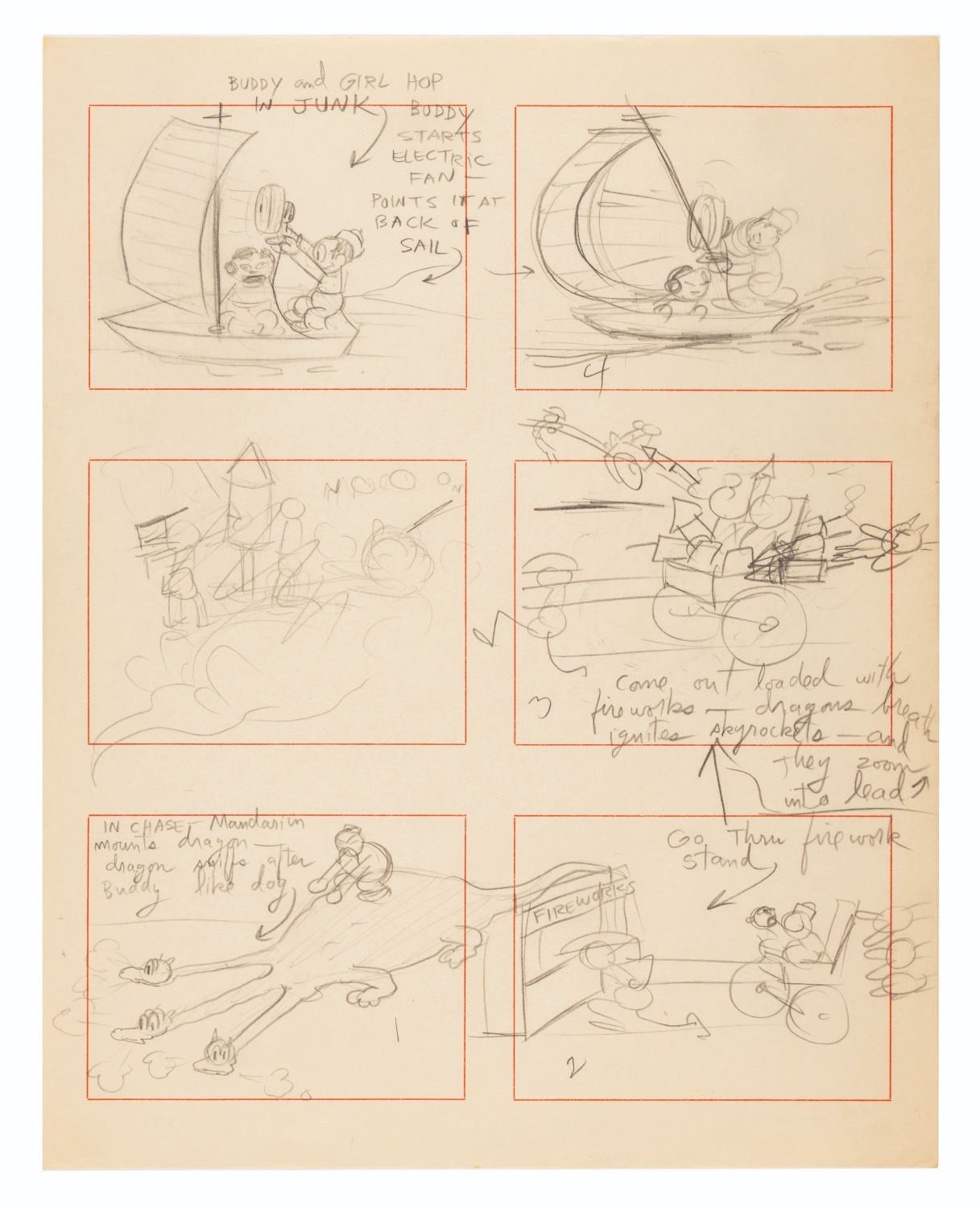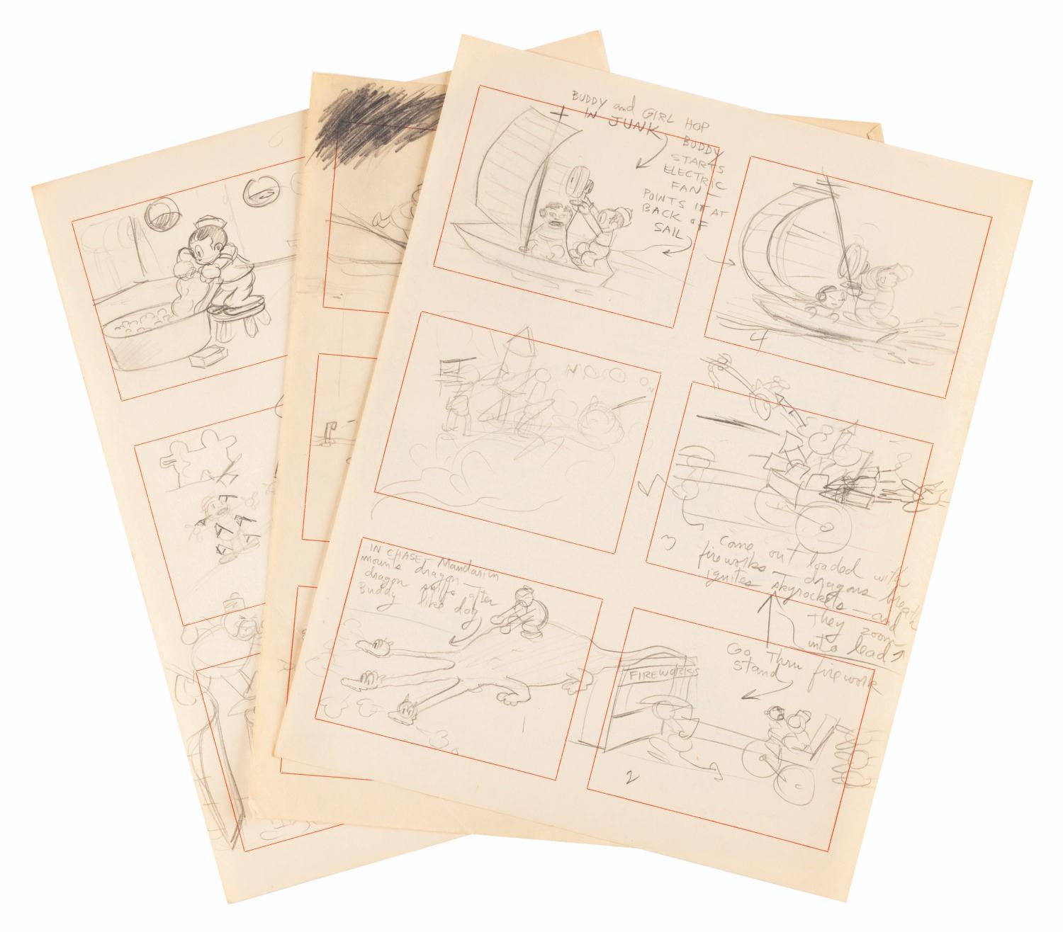 (Schlesinger, 1934) Three pages of storyboards from the Friz Freleng-directed Looney Tunes short “Buddy the Gob.” This was the first short Freleng directed in its entirety for the studio, having previously finished “Buddy’s Day Out” after Tom Palmer was fired. Each page consists of 6 storyboard panels, for a total of 18 panels. Measuring 9.5” x 12” overall, with each panel measuring 3” x 4”, the storyboards, accomplished in graphite and colored pencil,  are in good to very good condition with light stains, wear from production use, corner folds, and discoloration from age.