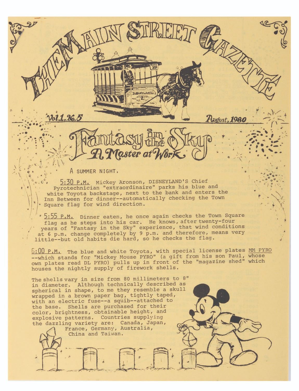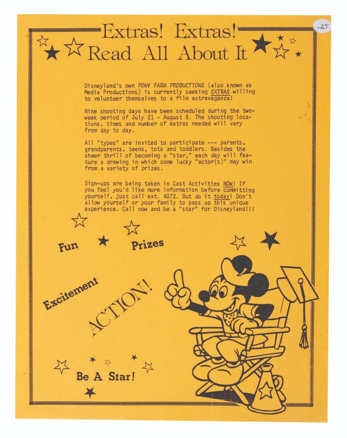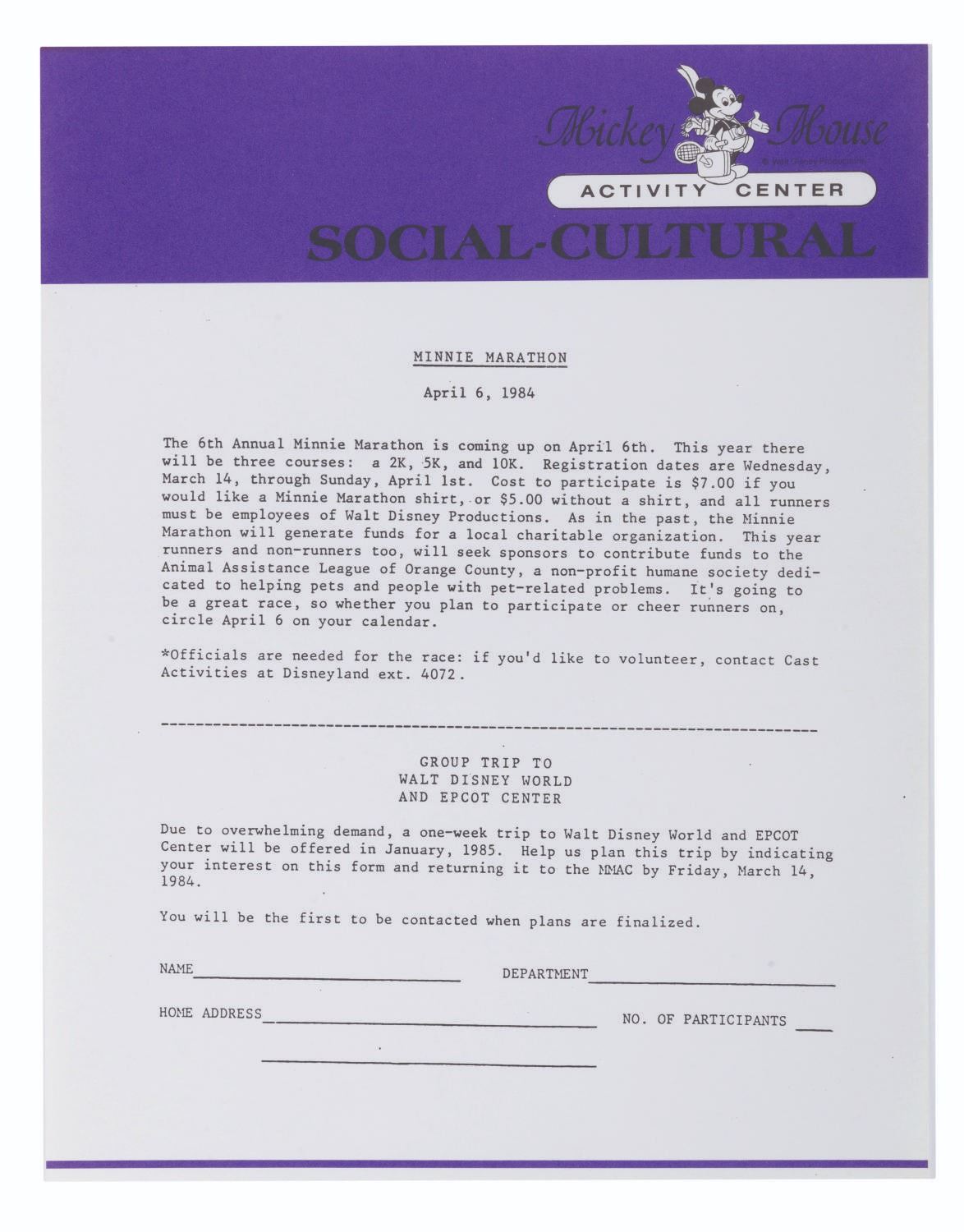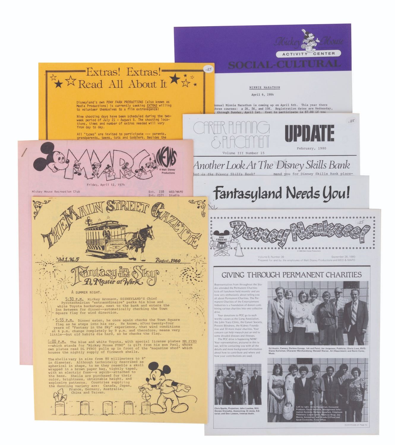 (Disney, 1974-1982) A collection of seven internal Cast Member publications including a Mickey Mouse Recreation Club flyer, a flyer for the Minnie Marathon, a Cast Activities extras casting call, a Fantasyland flyer for volunteers to test ride Snow White and Pinocchio attractions, a Career Planning and Placement Update newsletter, a Disney Newsreel from 1980, and a Main Street Gazette featuring information on the Fantasy in the Sky nighttime spectacular. Each measuring 8.5" x 11", all items are in very good condition with typical wear.
