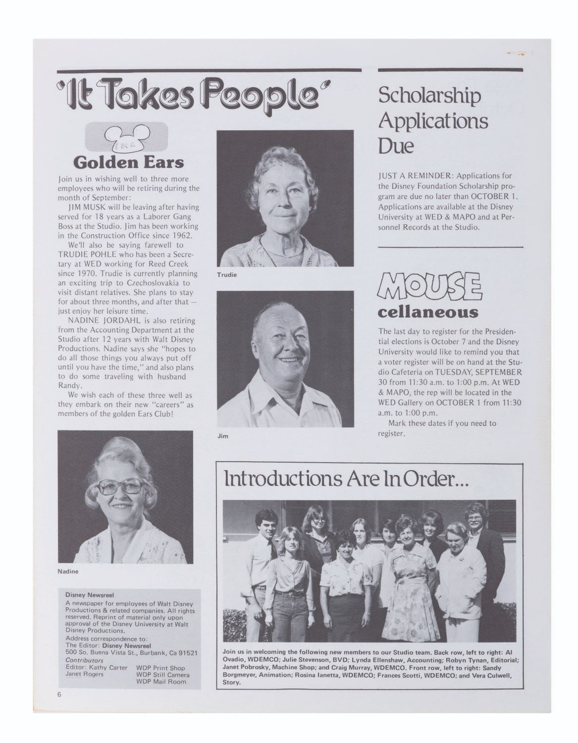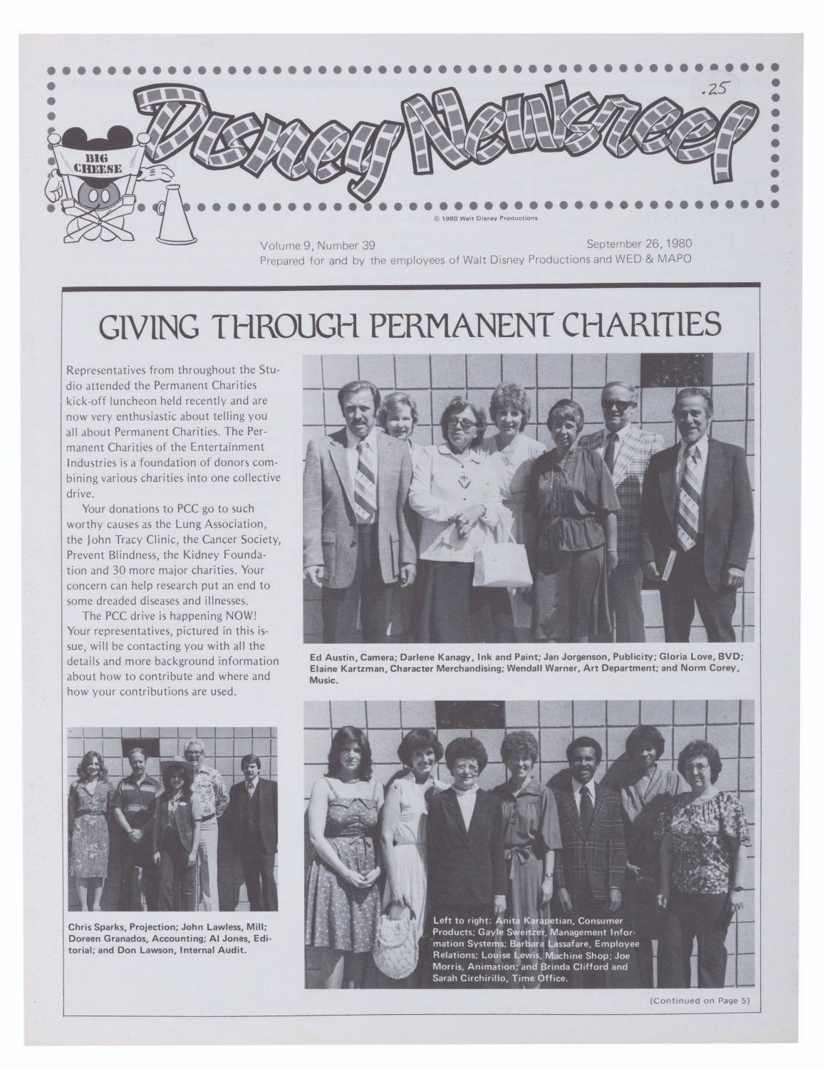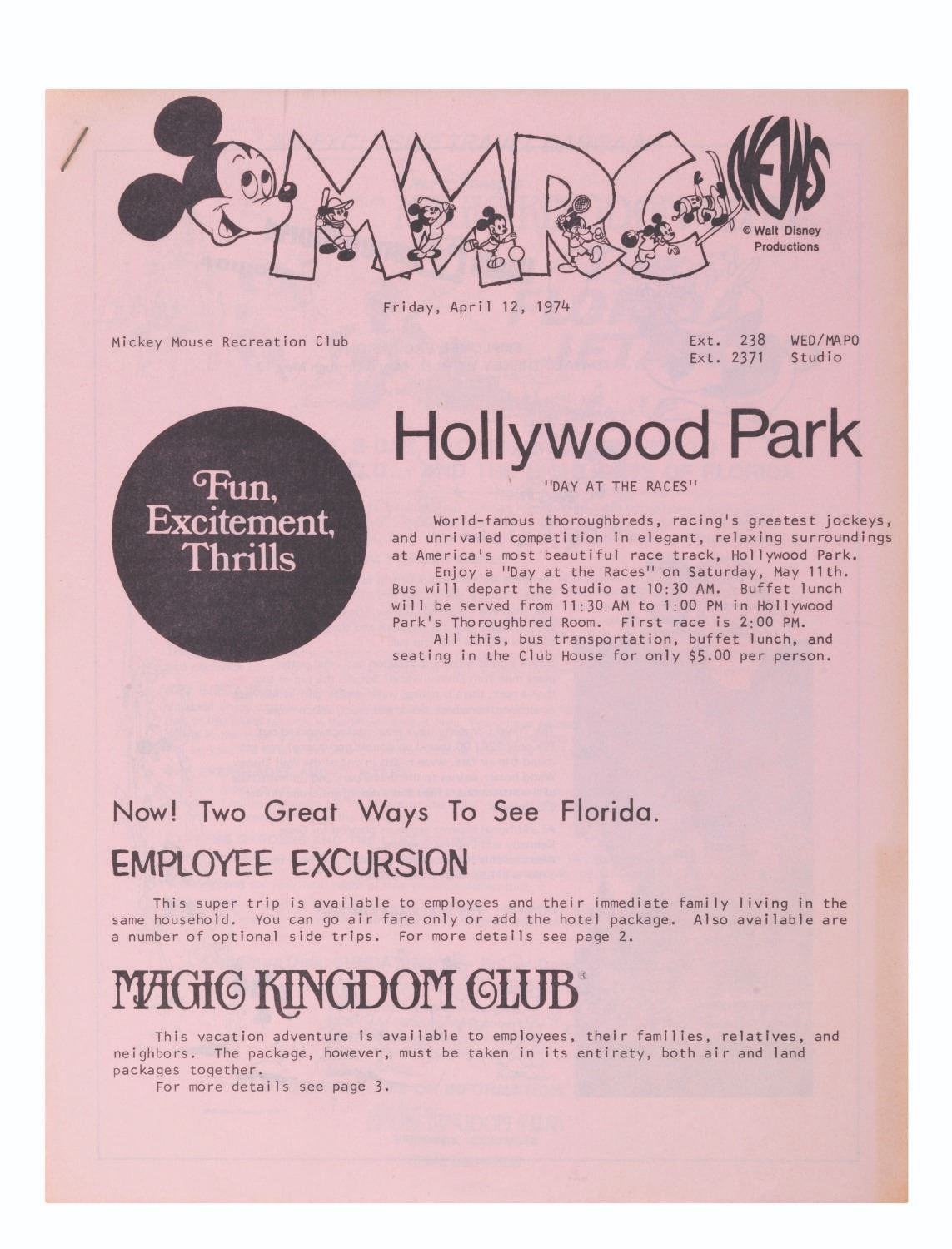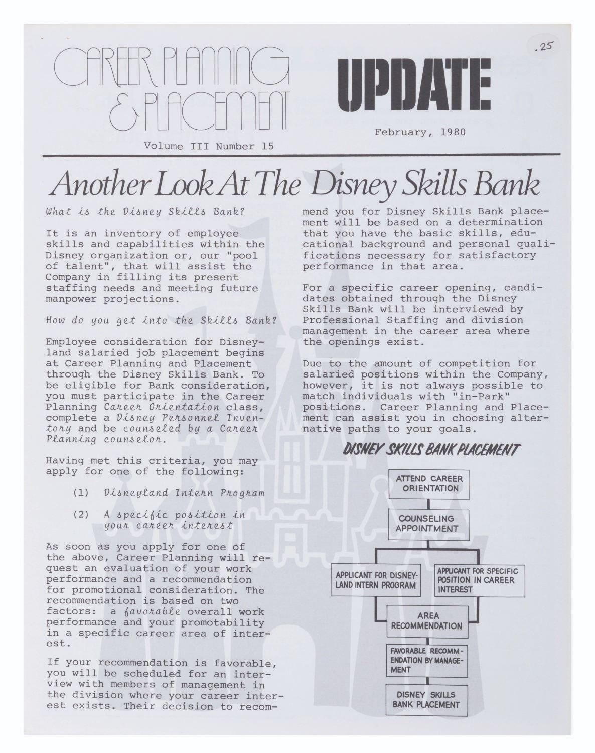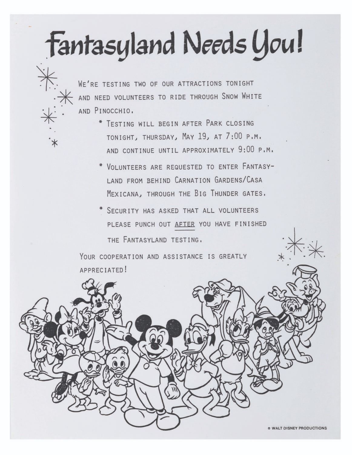 (Disney, 1974-1982) A collection of seven internal Cast Member publications including a Mickey Mouse Recreation Club flyer, a flyer for the Minnie Marathon, a Cast Activities extras casting call, a Fantasyland flyer for volunteers to test ride Snow White and Pinocchio attractions, a Career Planning and Placement Update newsletter, a Disney Newsreel from 1980, and a Main Street Gazette featuring information on the Fantasy in the Sky nighttime spectacular. Each measuring 8.5" x 11", all items are in very good condition with typical wear.